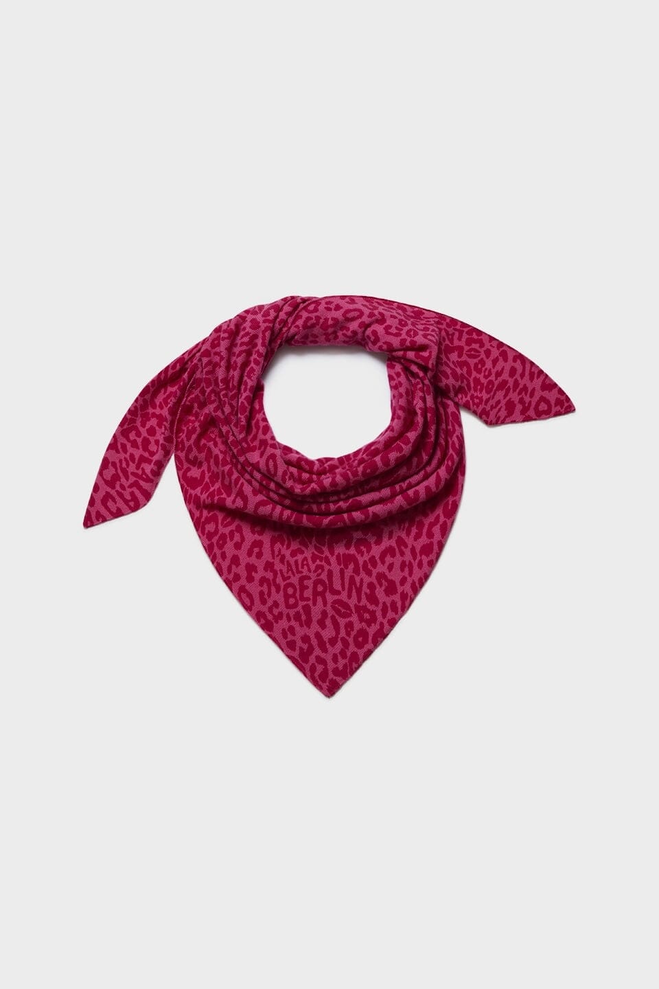 Un foulard triangulaire de Lala Berlin, confectionné en cachemire imprimé avec un motif léopard rose. Le design allie confort doux et allure audacieuse.