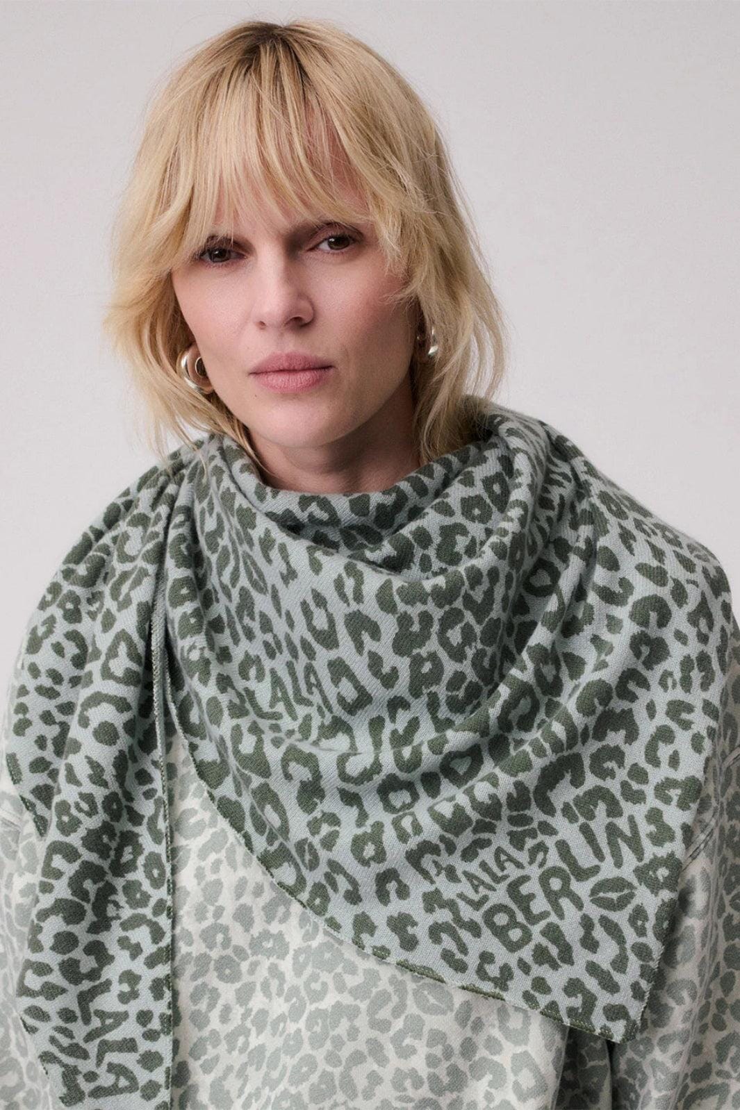 Foulard triangulaire de Lala Berlin, confectionné en cachemire imprimé avec un motif léopard dans des nuances de vert. Le foulard présente une forme triangulaire avec le branding Lala Berlin.