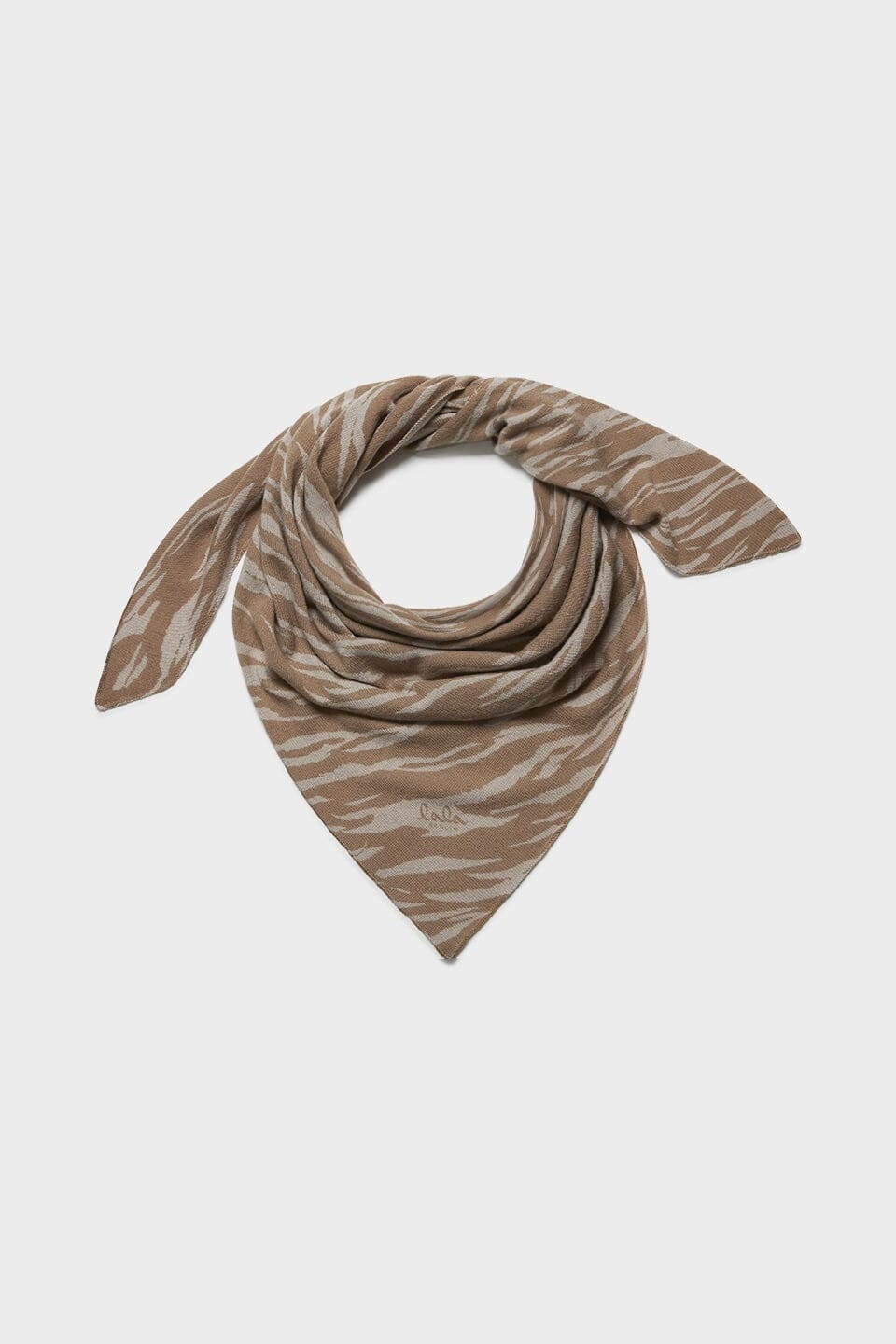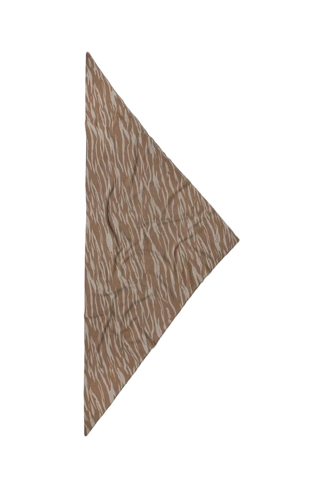 Foulard triangulaire Lala Berlin en cachemire imprimé. Le motif présente des rayures ondulées, rappelant le tigre, dans des nuances sable et marron sur un fond beige.