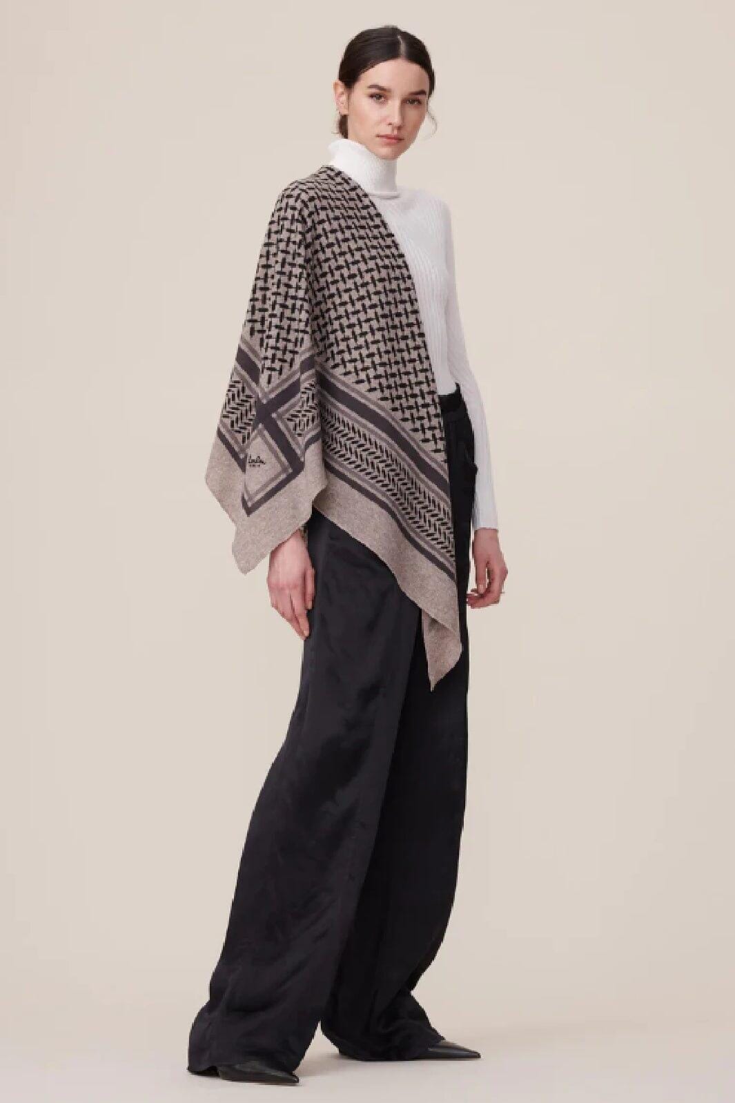 Écharpe triangulaire de Lala Berlin en brun mélangé. Une grande écharpe avec le motif Kufiya caractéristique sur un fond brun. L'écharpe est fabriquée en cachemire.