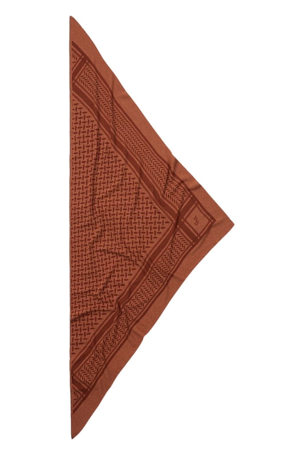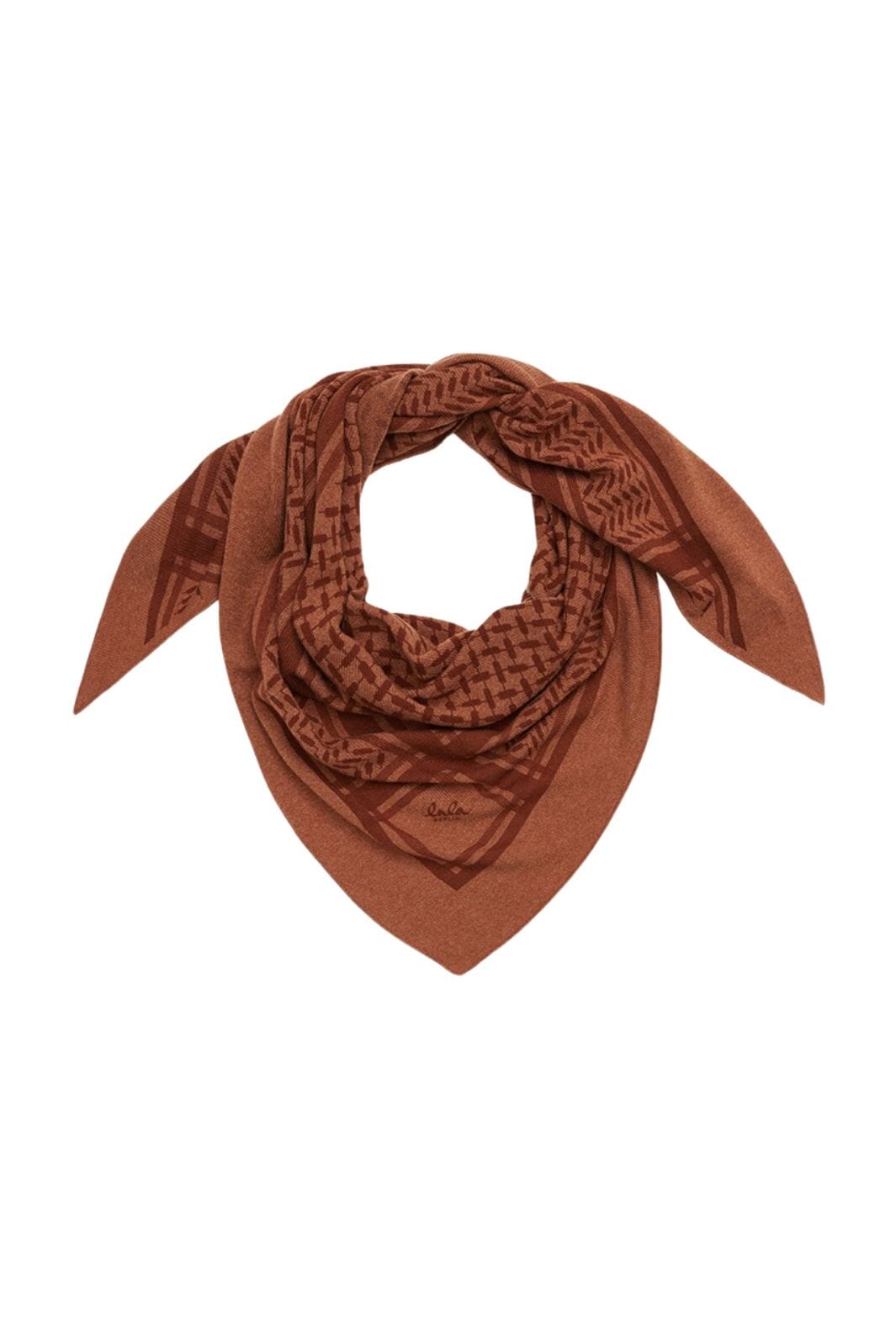 Écharpe triangulaire de Lala Berlin en brun. Fabriquée en cachemire avec un motif en chevrons et une impression le long des bords. Le design triangulaire rend l'écharpe facile à styliser de différentes manières.