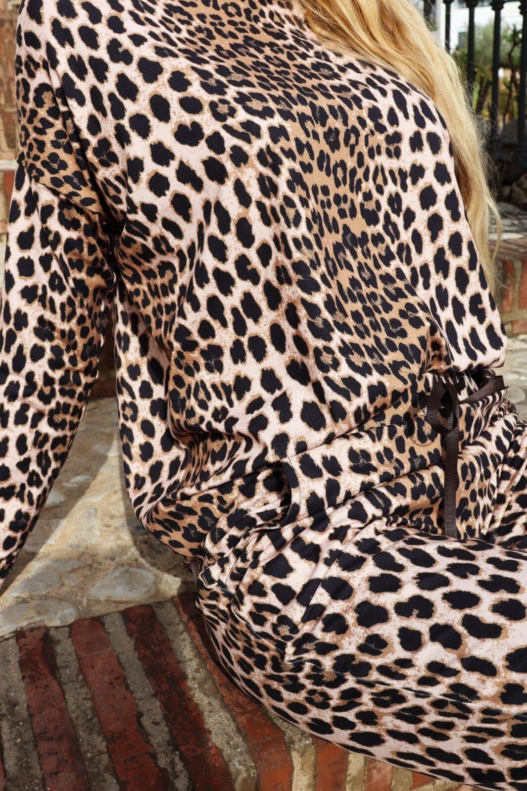 Blouse de Liberte avec imprimé léopard dans des nuances de brun et de noir. Elle a des manches longues et un col rond avec un lien comme détail.