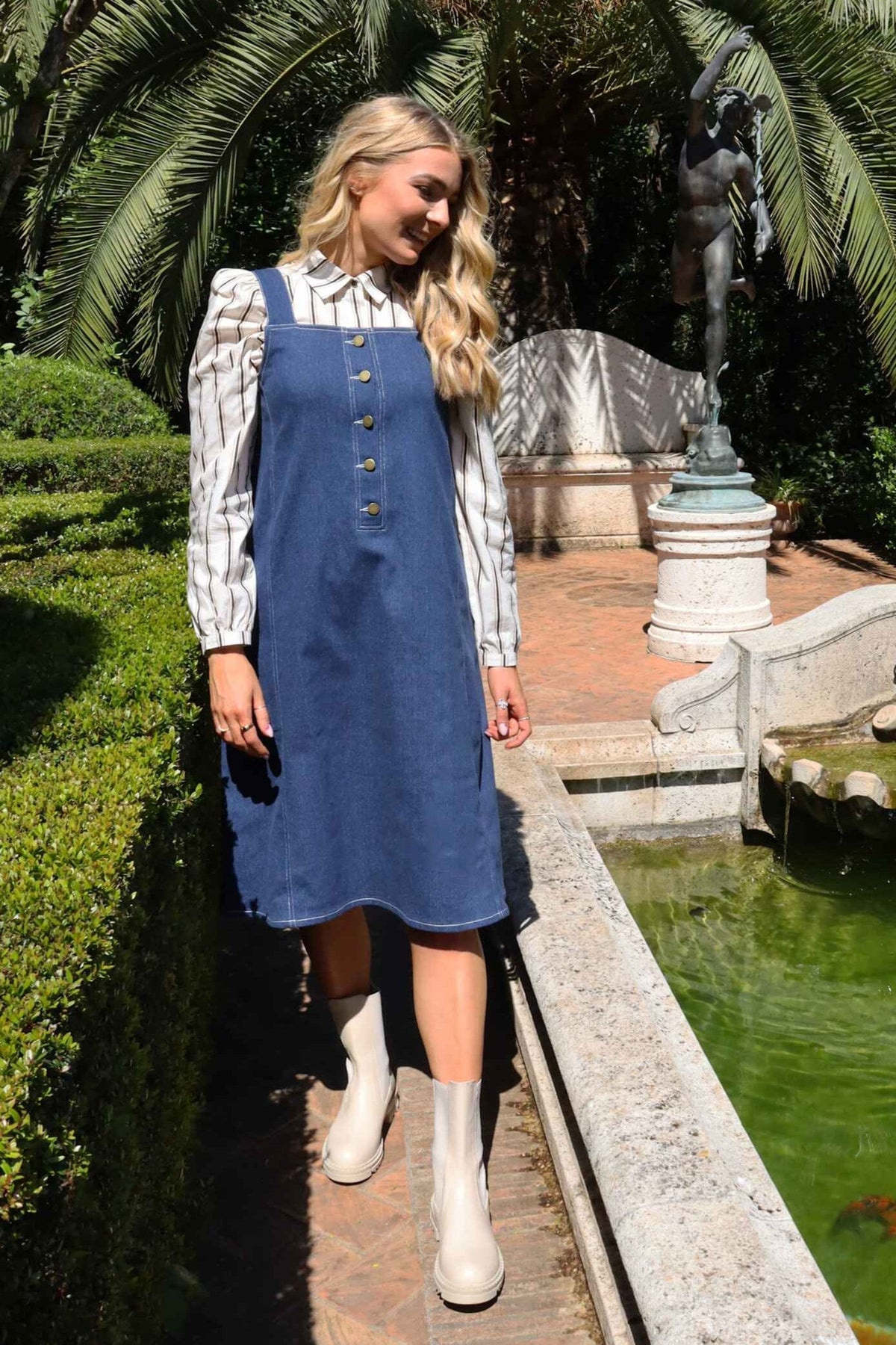 Salopette en denim de Liberte en bleu classique. Elle a des bretelles larges et une fermeture à boutons à l'avant avec des coutures décoratives le long des bords.