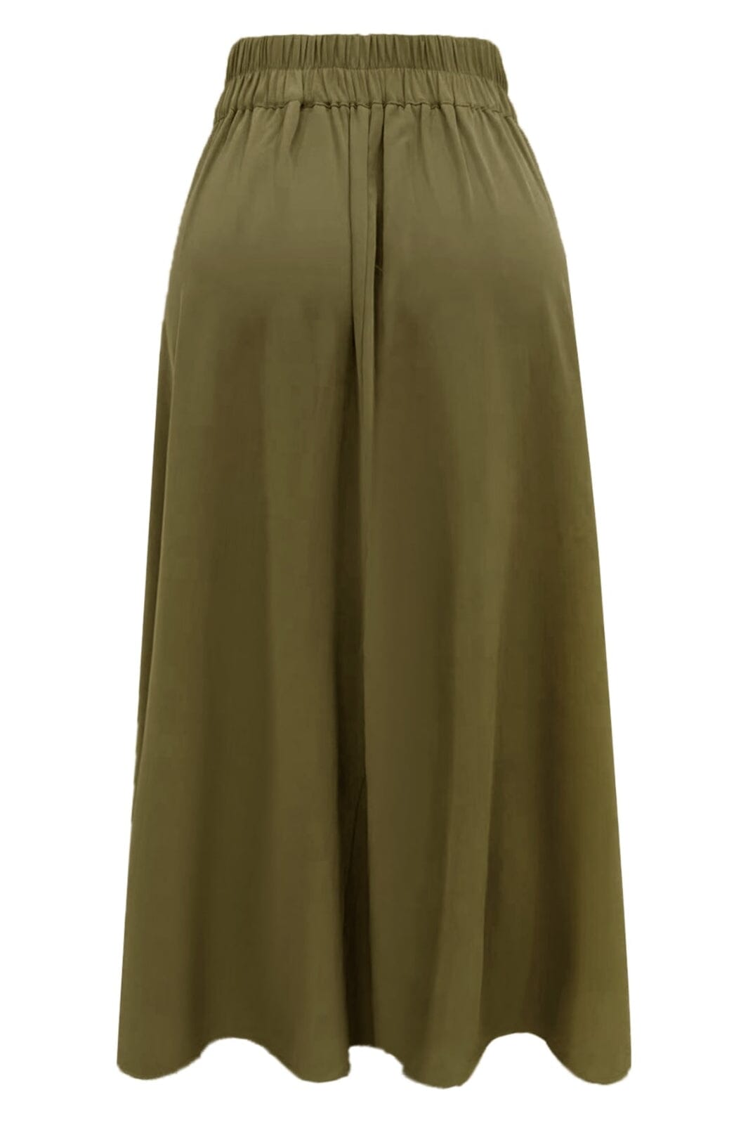 Jupe longue de Liberte en vert armée. La jupe a une silhouette fluide et une taille normale avec un élastique à la taille.