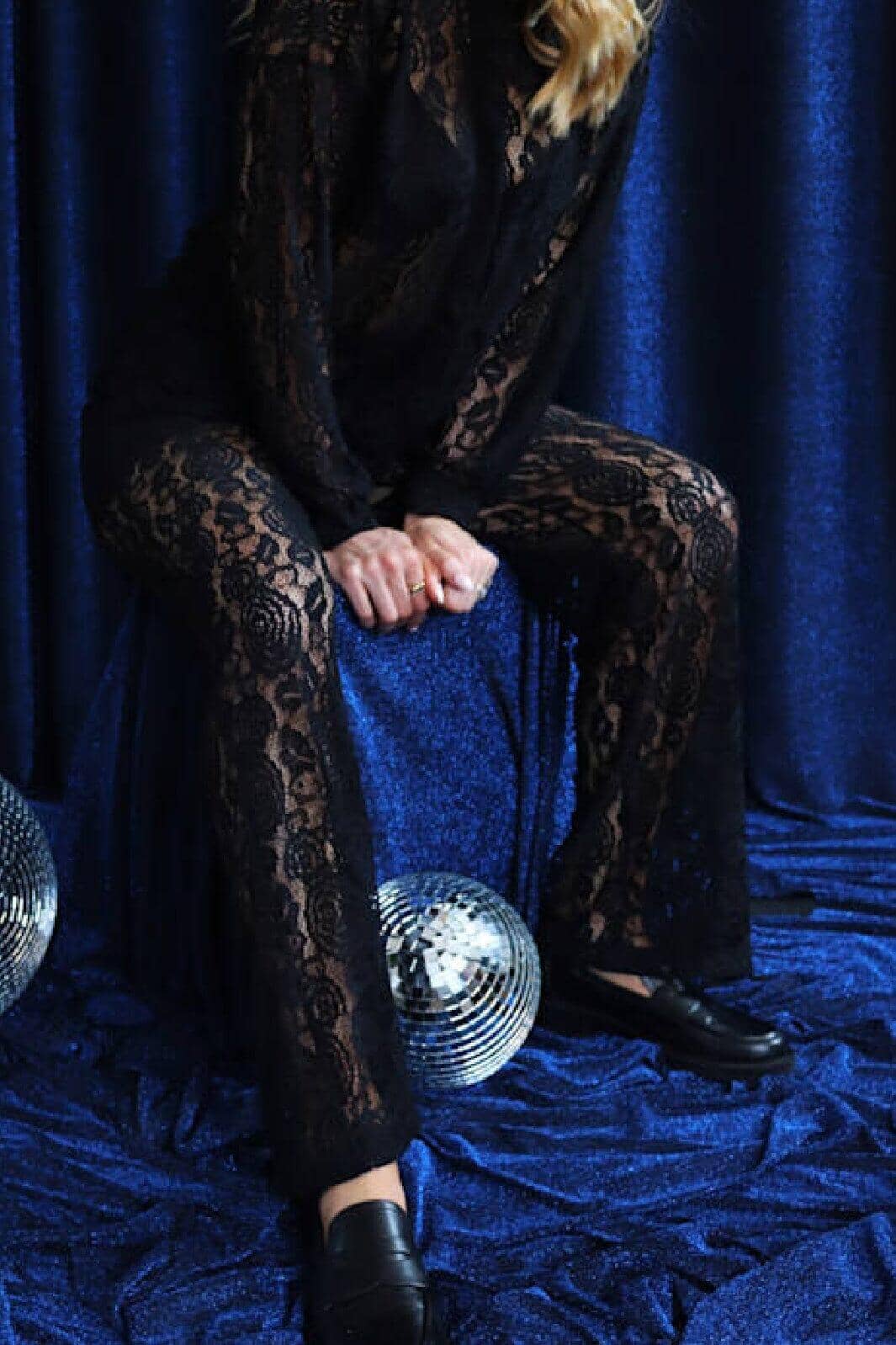 Pantalon en dentelle noire de Liberte avec un motif floral. Le pantalon présente des jambes transparentes et une partie supérieure plus opaque, et il convient aux occasions festives et formelles.
