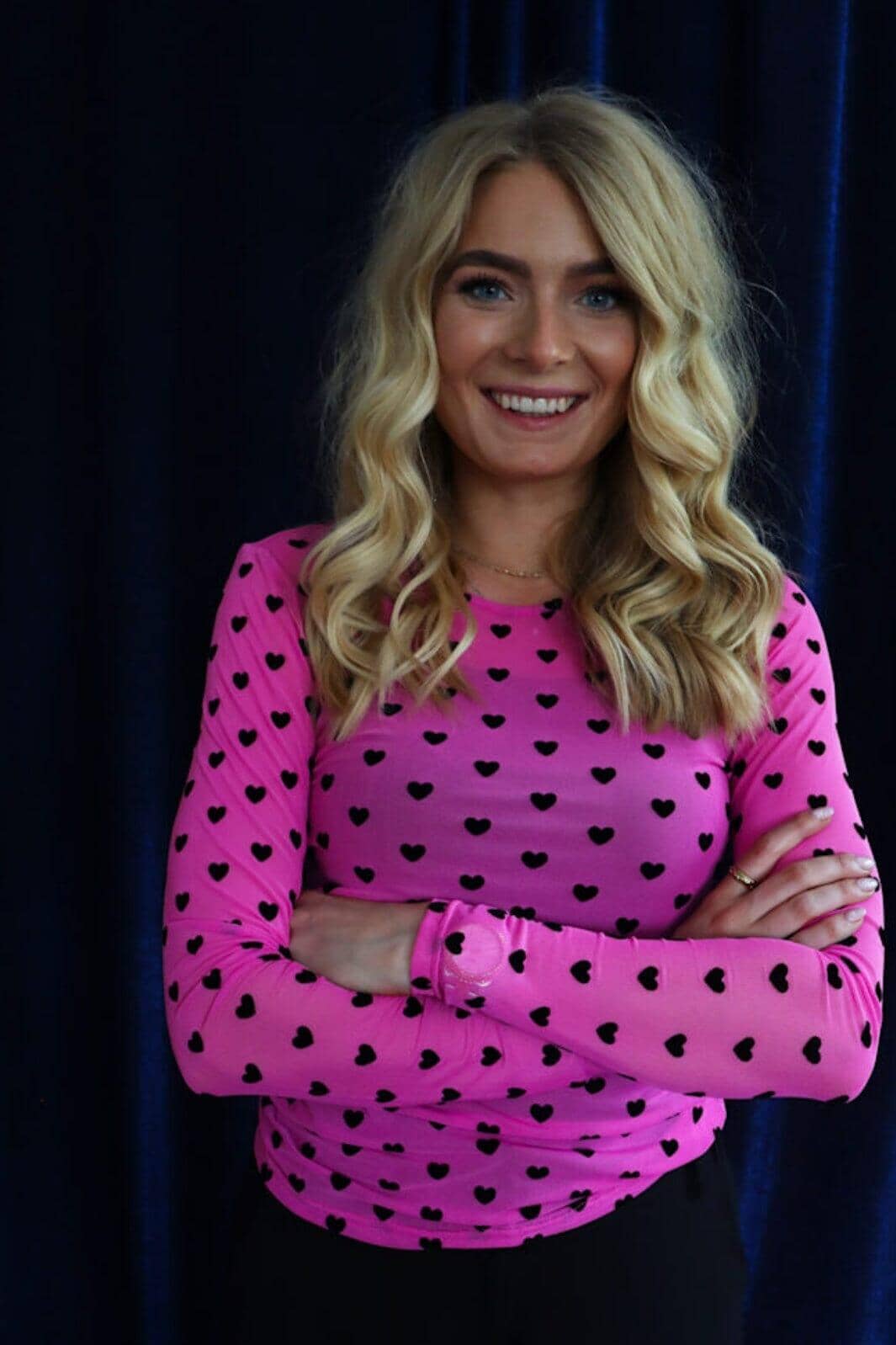 T-shirt en mesh rose à manches longues de Liberte avec des cœurs noirs sur toute la surface. Le t-shirt a une coupe slim et un col rond.