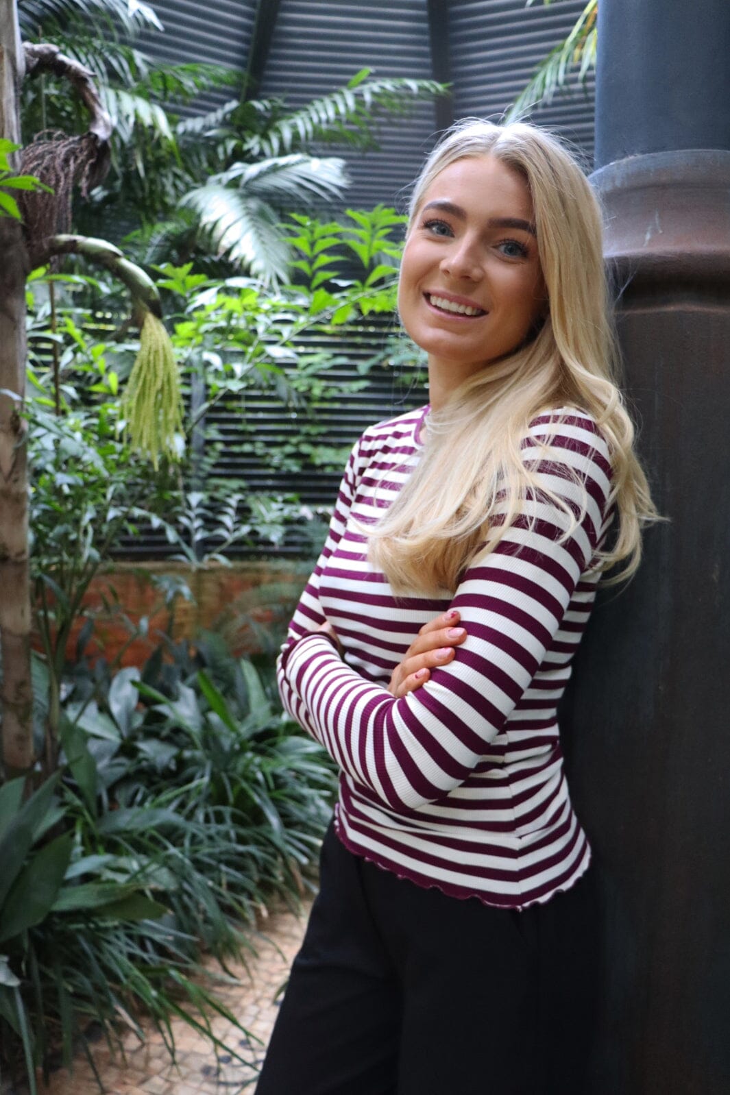 Blouse rayée de Liberte avec des rayures horizontales en prune et crème. La blouse a un col rond et un ourlet ondulé.
