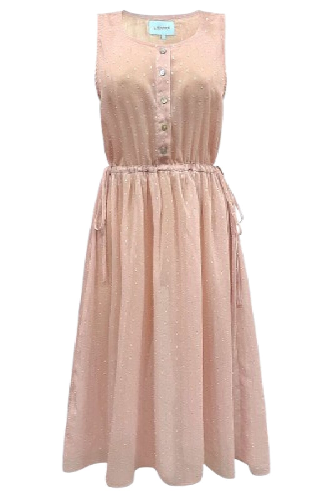 Robe rose de Liberte en tissu structuré avec de petits pois. La robe a une fermeture à boutons à l'avant et une taille froncée avec un lien pour ajuster la coupe.