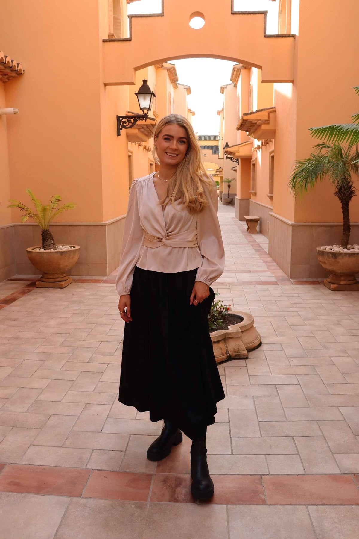 Un chemisier de la marque Liberte dans une teinte champagne beige clair, fabriqué en 100 % polyester. Le chemisier présente un détail twist sur le devant et une partie froncée au dos.