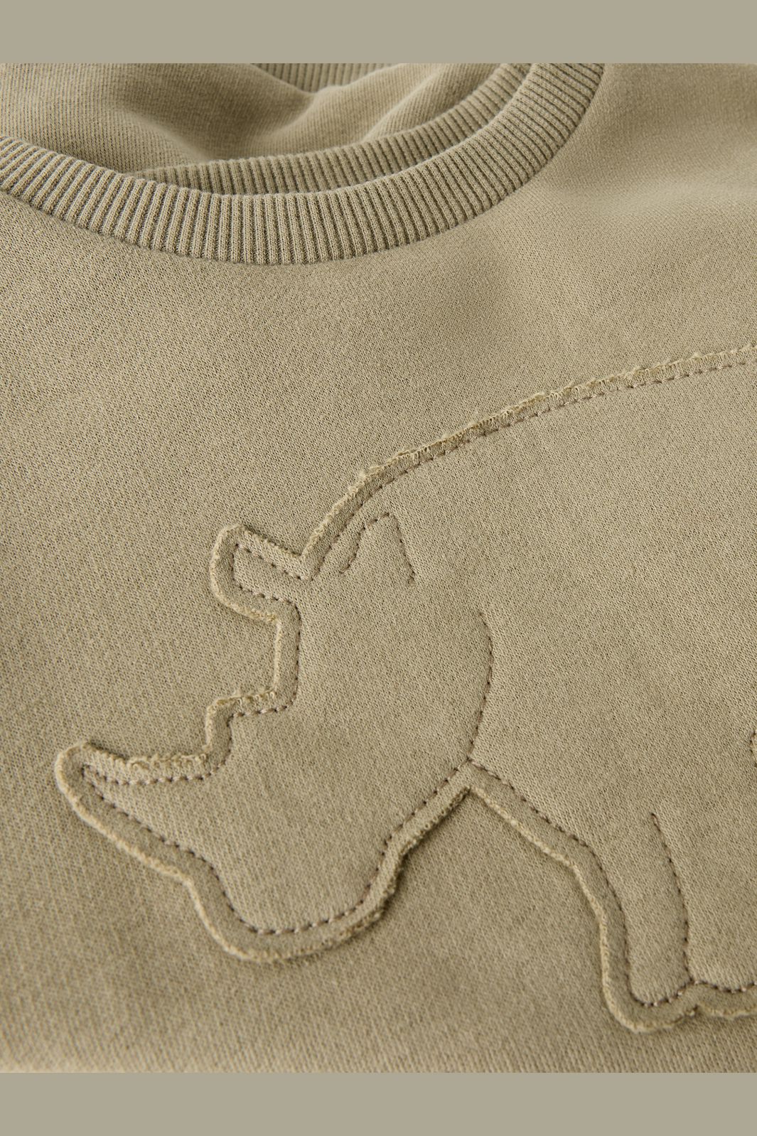 Sweatshirt Lil' Atelier Mini vert olive avec un motif rhinocéros brodé sur le devant. Le sweatshirt possède des poignets côtelés et un col rond côtelé.