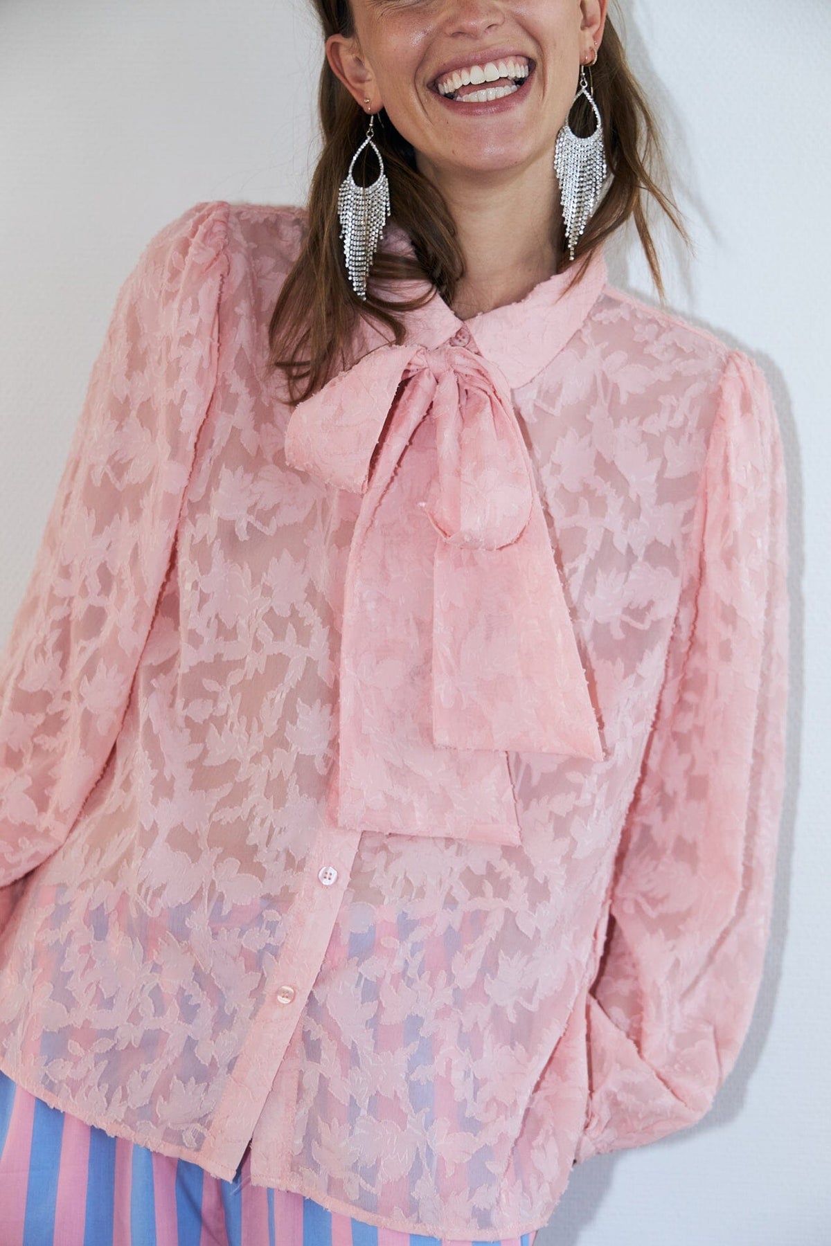 Chemise rose de Lollys Laundry avec motif floral et nœud au col. La chemise a des boutons à l'avant et des manches bouffantes avec élastique aux poignets.