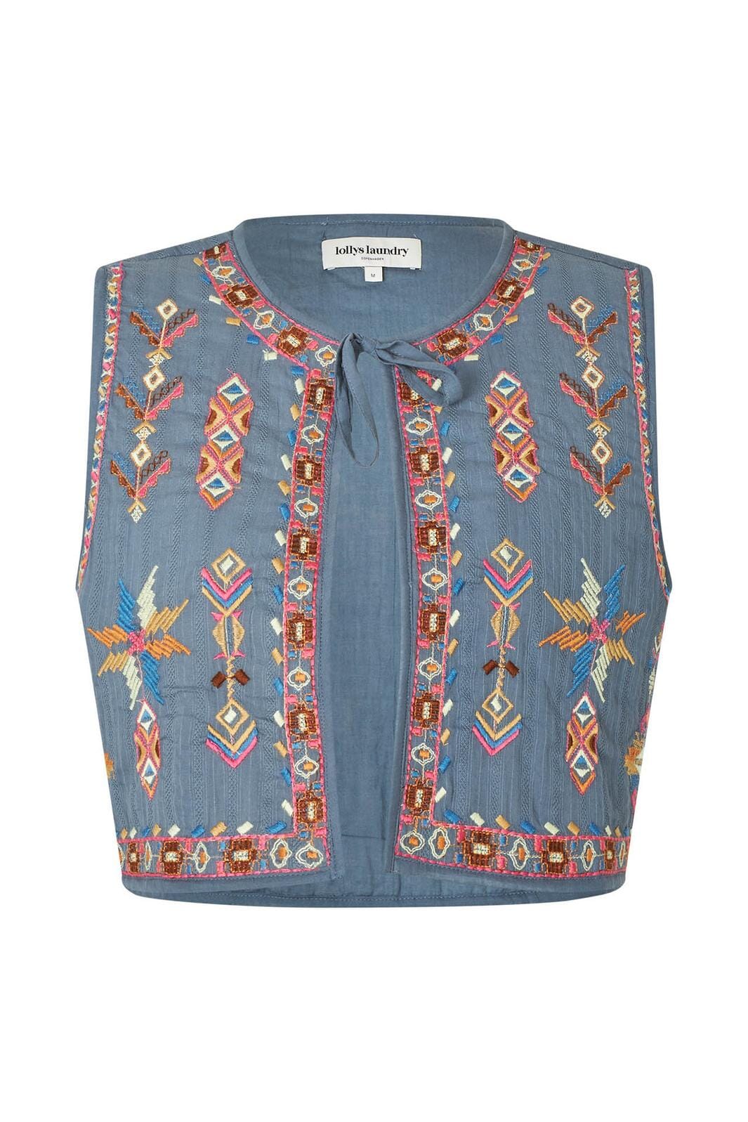 Veste bleu poussiéreux de Lollys Laundry avec broderie colorée. La veste a un col rond avec un lien et est fabriquée en coton avec des motifs détaillés le long des bords.