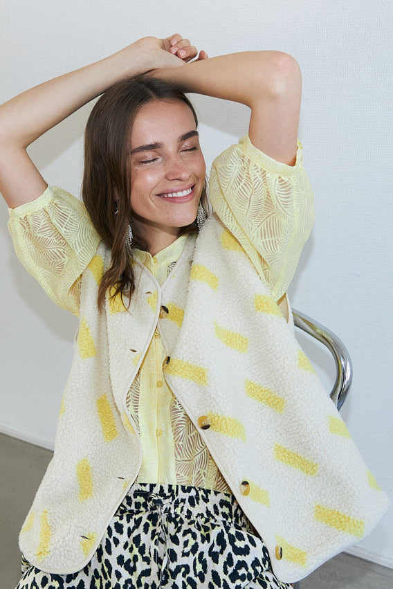 Chemise blanche de Lollys Laundry avec des motifs brodés en brun, violet et jaune. La chemise à manches courtes a un col classique et des boutons jaunes à l'avant.