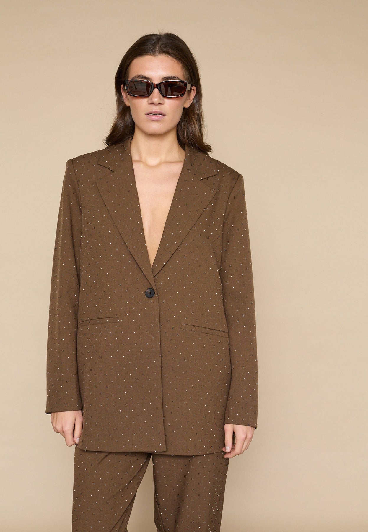 Blazer de Love & Divine de couleur brune avec de petits détails en strass. La veste présente une coupe classique avec revers et fermeture par un seul bouton.