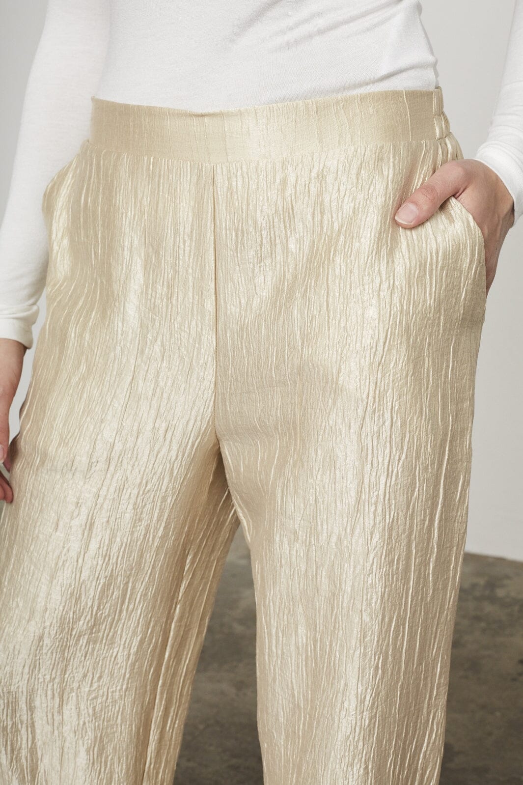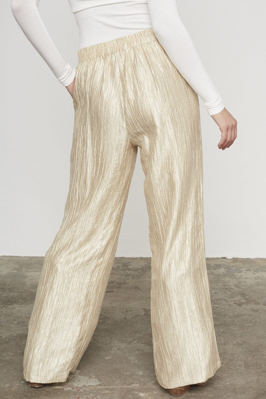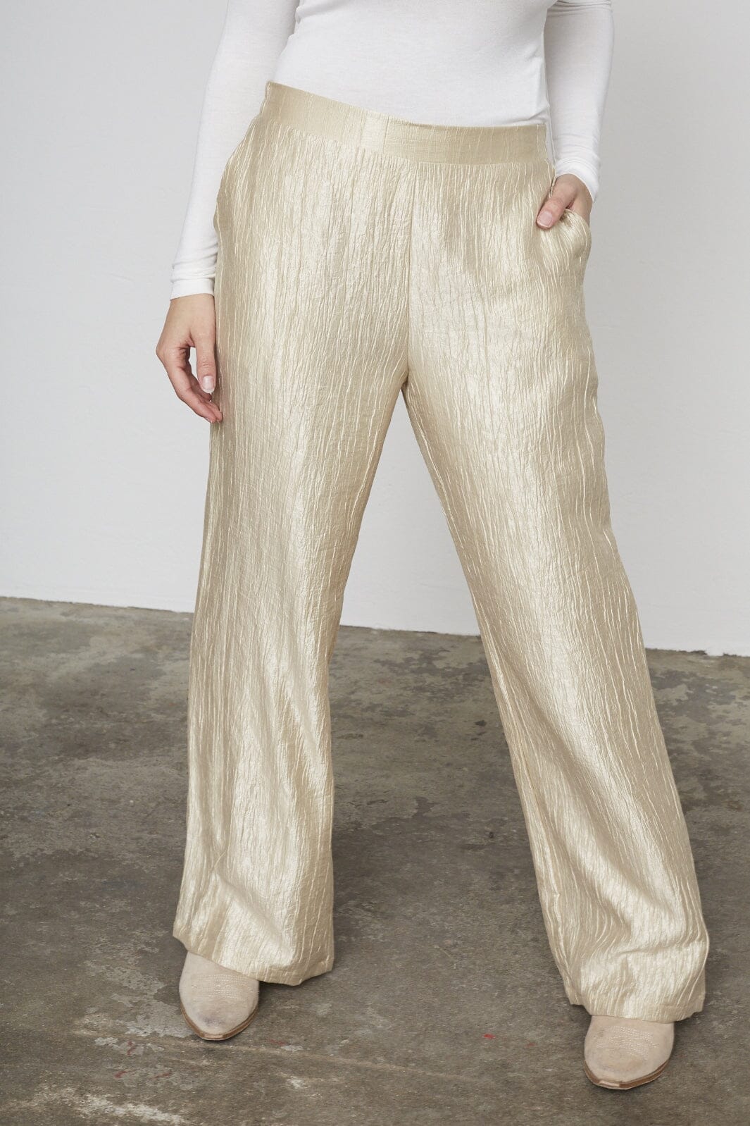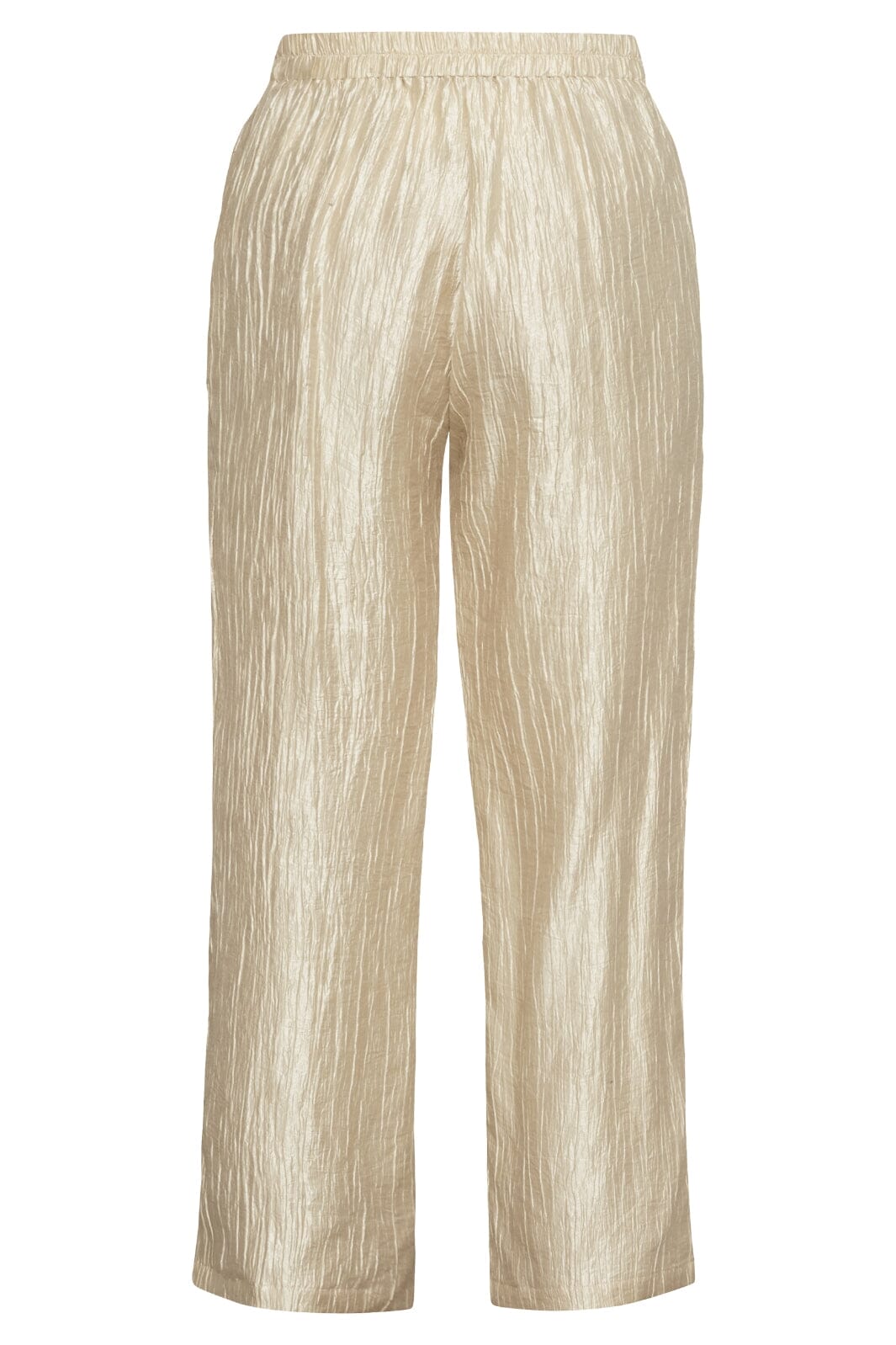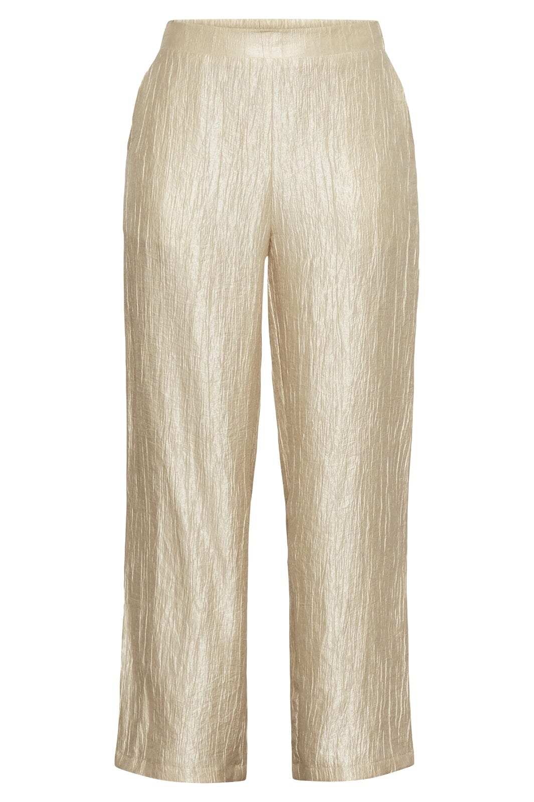 Pantalons dorés de Love & Divine avec une surface frisée. Les pantalons ont une taille haute et un design ample et large qui offre une bonne liberté de mouvement.