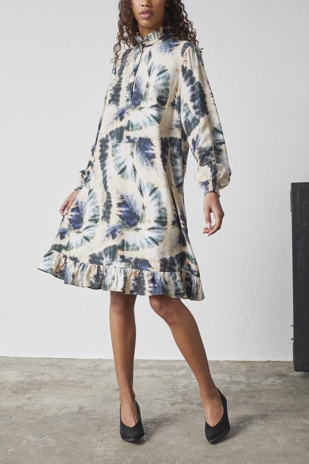 Robe de Love & Divine avec un motif tie-dye dans des nuances de beige, vert et bleu. Elle a un col montant, des détails de boutons à l'avant et un ourlet froncé en bas. Les longues manches sont resserrées aux poignets.