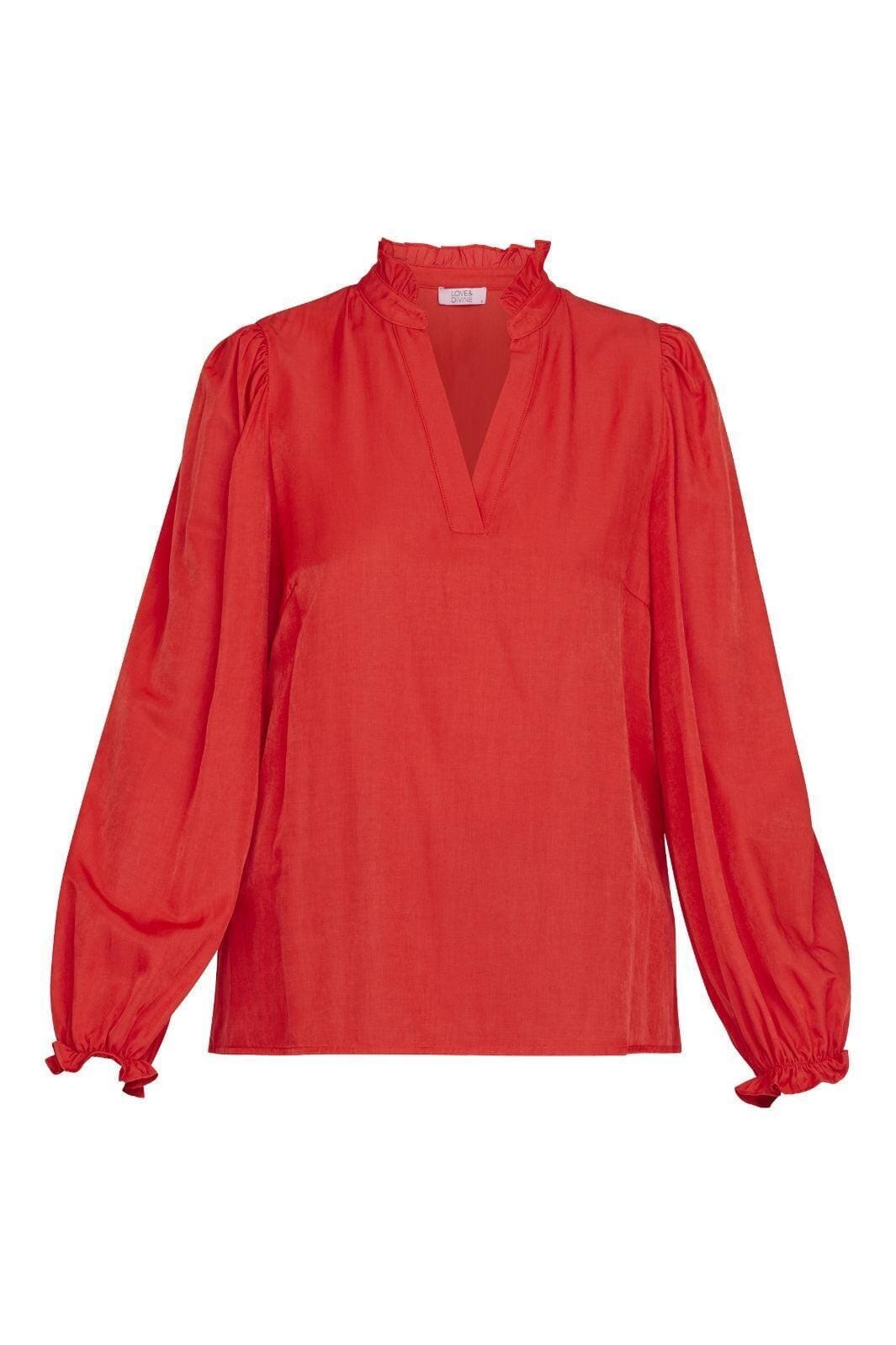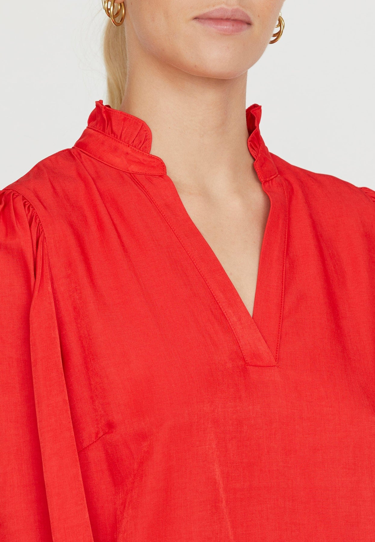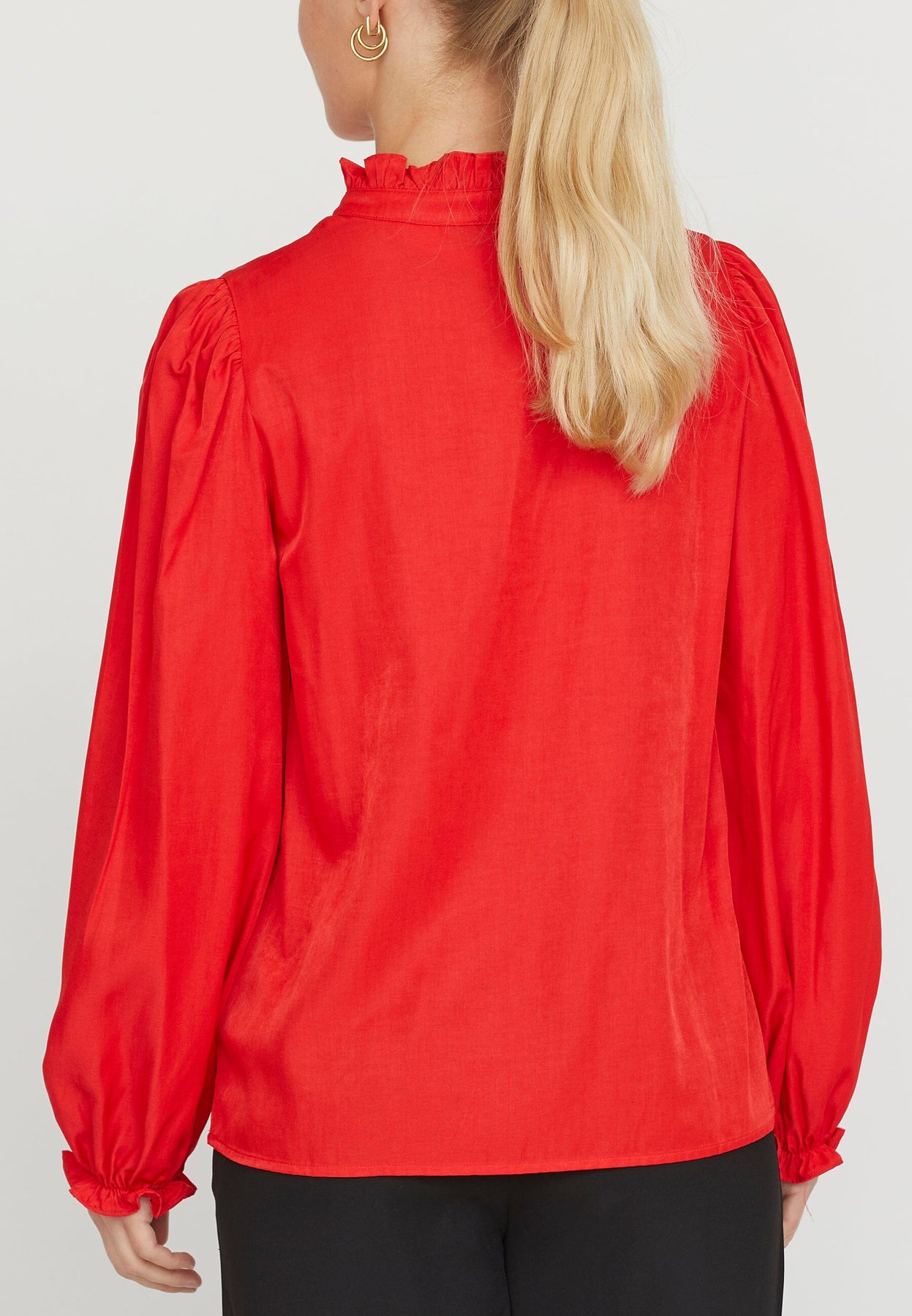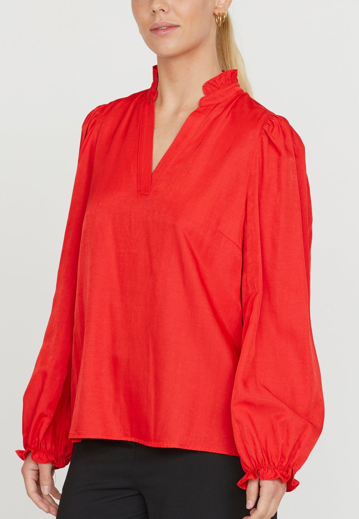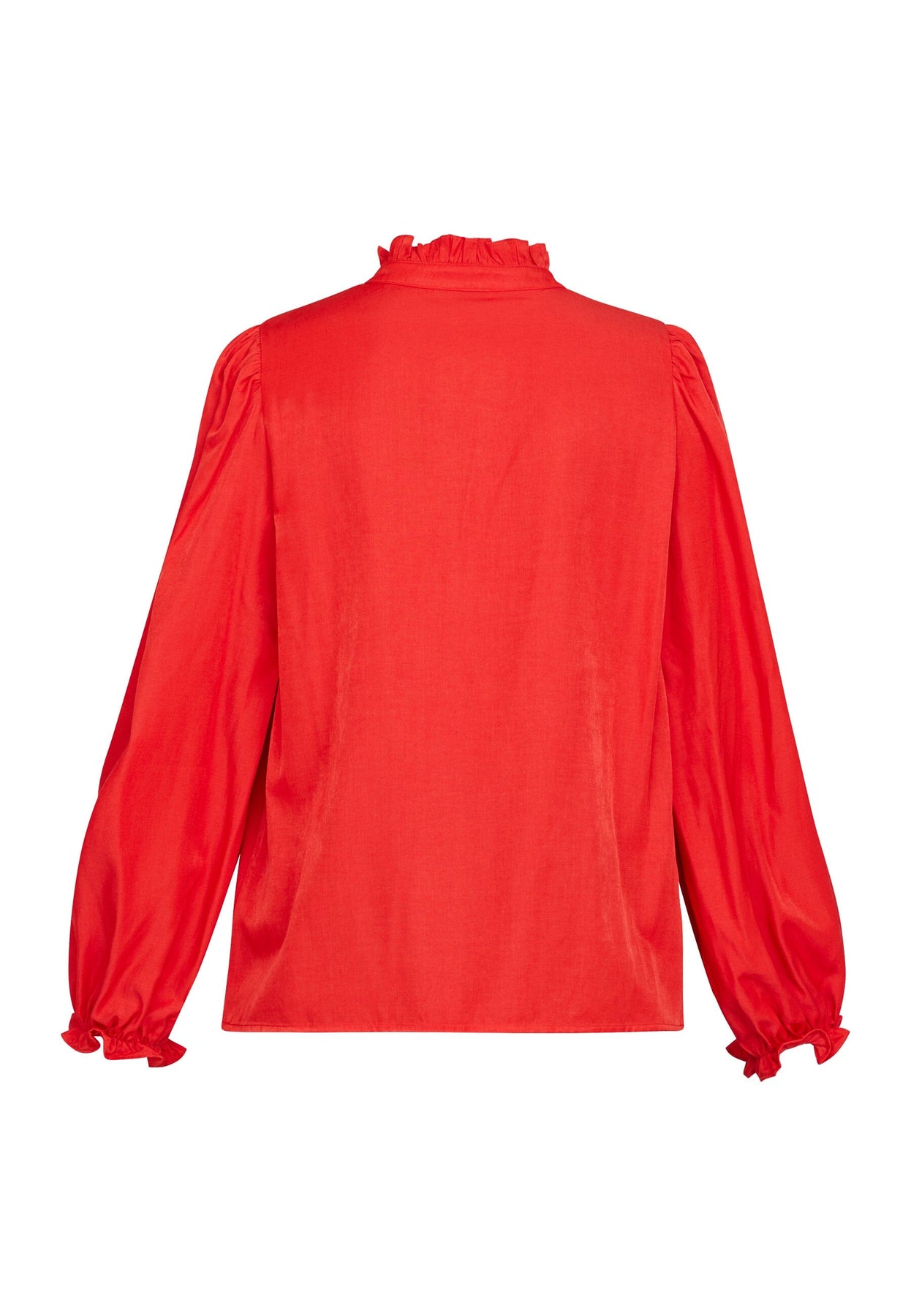 Blouse rouge de Love & Divine avec col froncé et manches bouffantes. La blouse a un décolleté en V et des détails en volants aux épaules, créant une expression féminine.