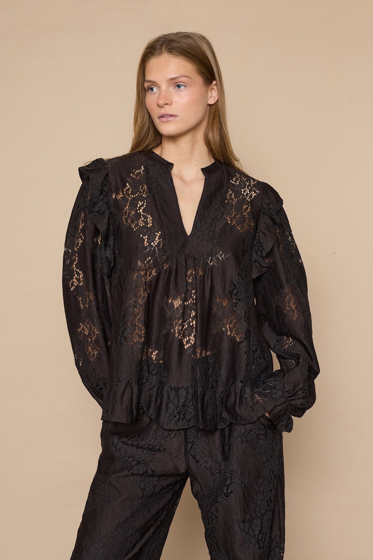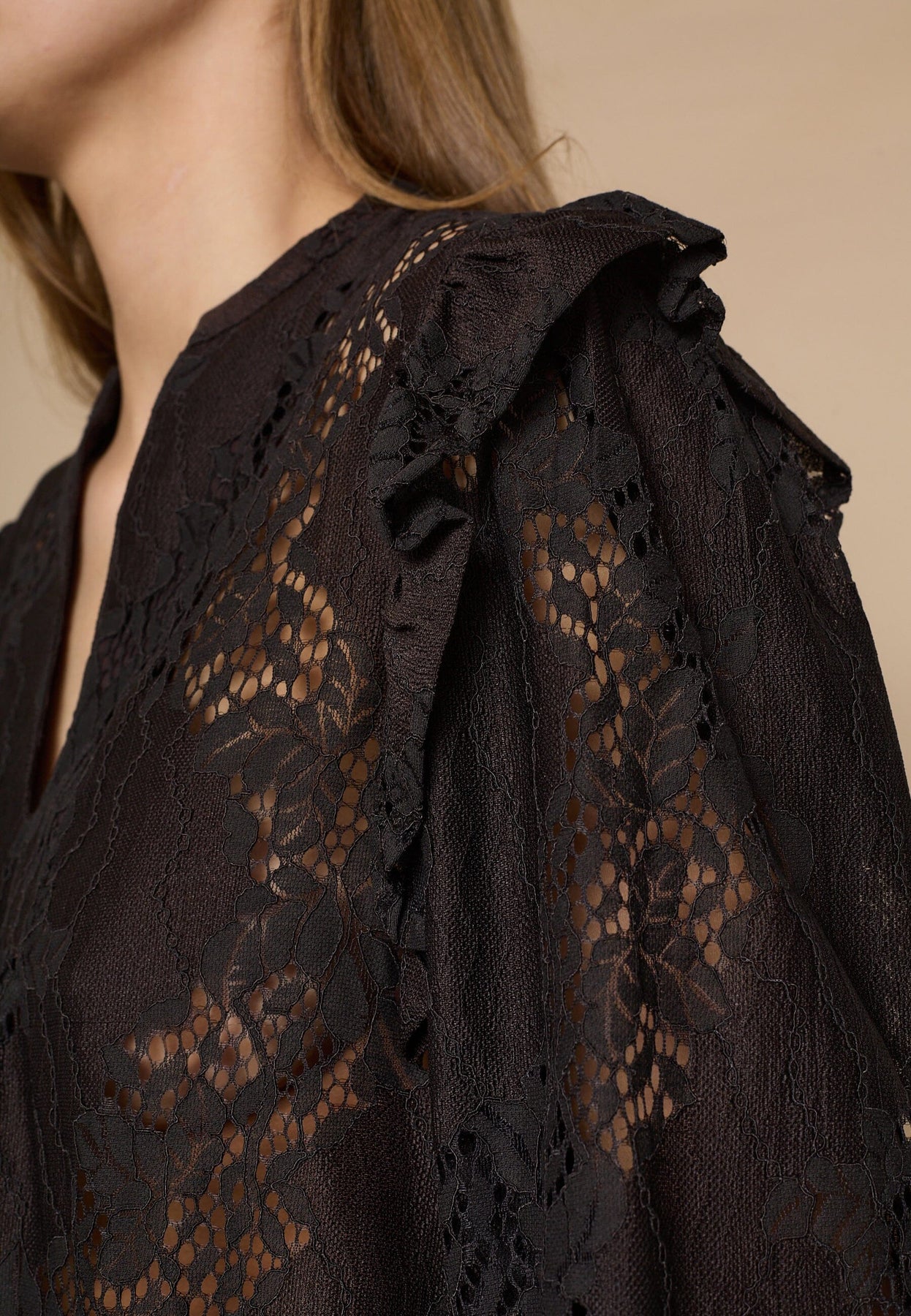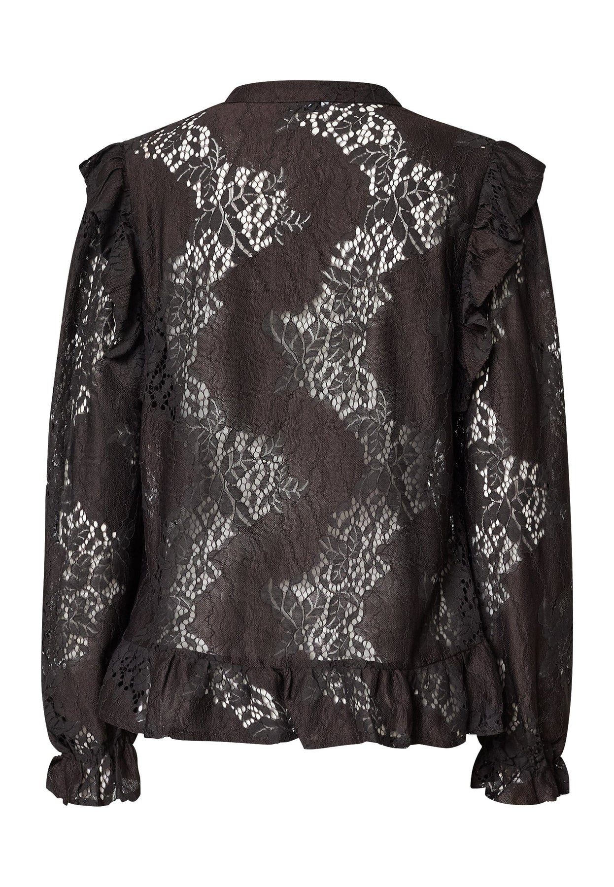 Blouse Love & Divine de couleur brun chocolat foncé avec motif en dentelle fleurie transparente. La blouse présente des détails à volants aux épaules et aux poignets.