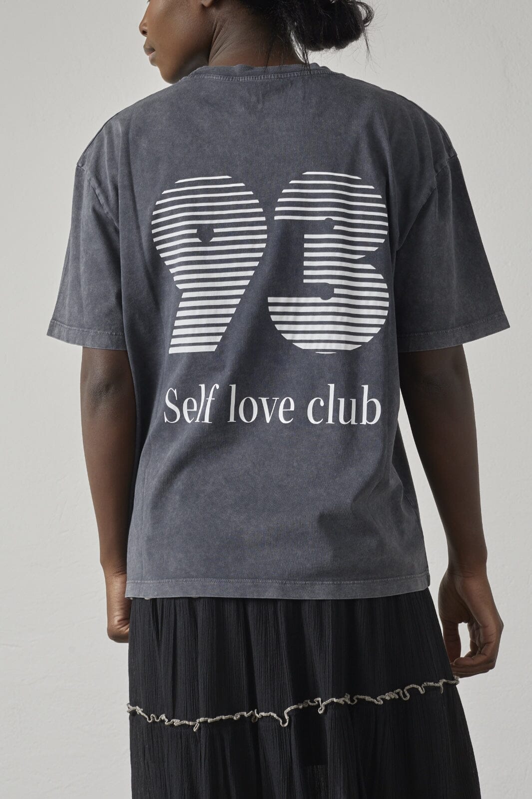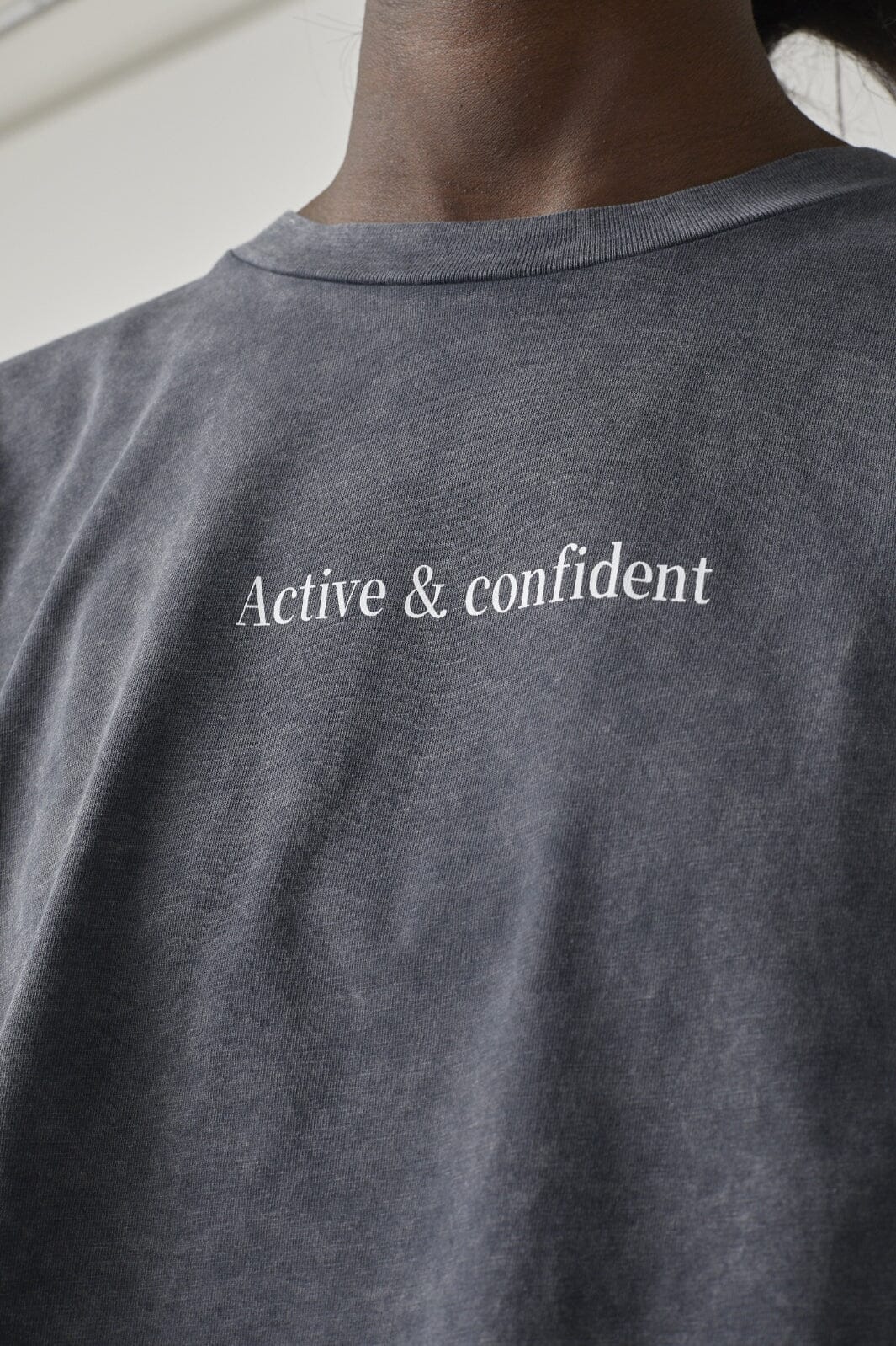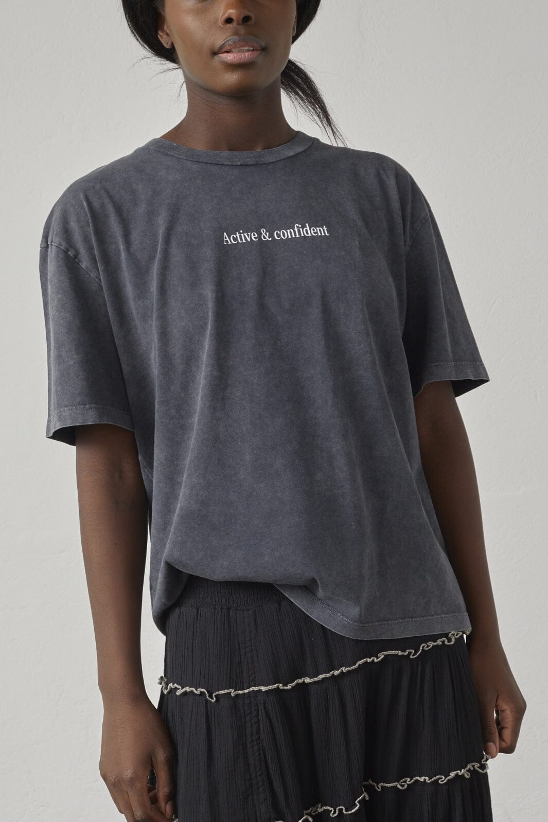 T-shirt gris délavé de Love & Divine avec impression Active & Confident sur le devant. Le t-shirt a une coupe ample et un aspect légèrement usé avec un effet acid wash.