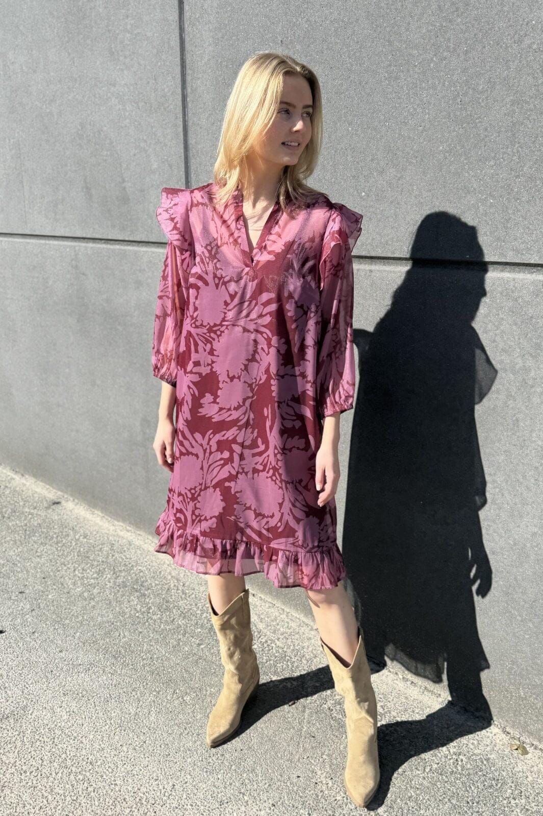 Robe de Love & Divine avec imprimé floral dans des nuances de blush et de bordeaux. Elle a un décolleté en V, des manches 3/4 et des détails froncés aux manches et au bas.