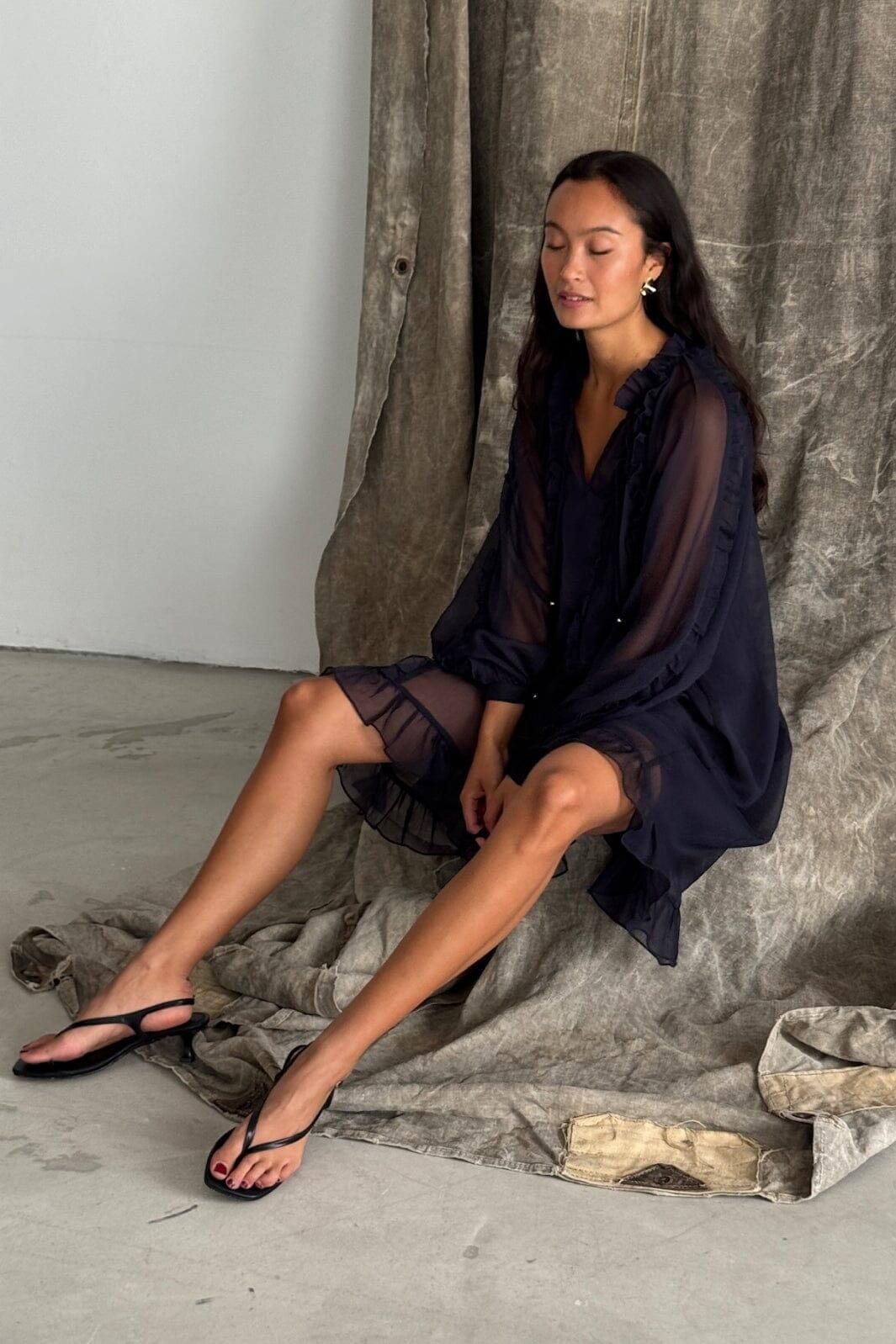 Robe navy de Love & Divine avec des détails en volants. La robe a un col haut avec un lien, des manches longues et un tissu légèrement transparent avec des volants le long de l'avant et des manches.