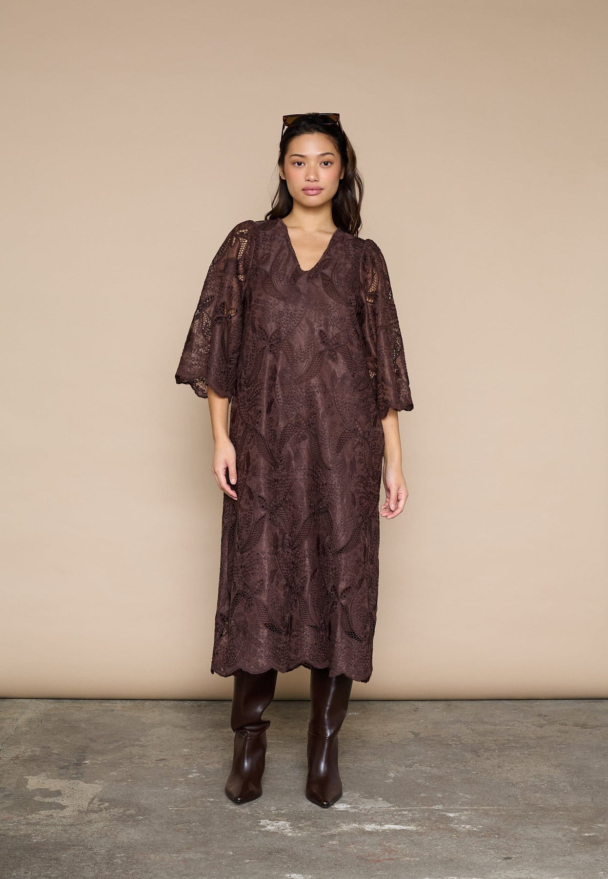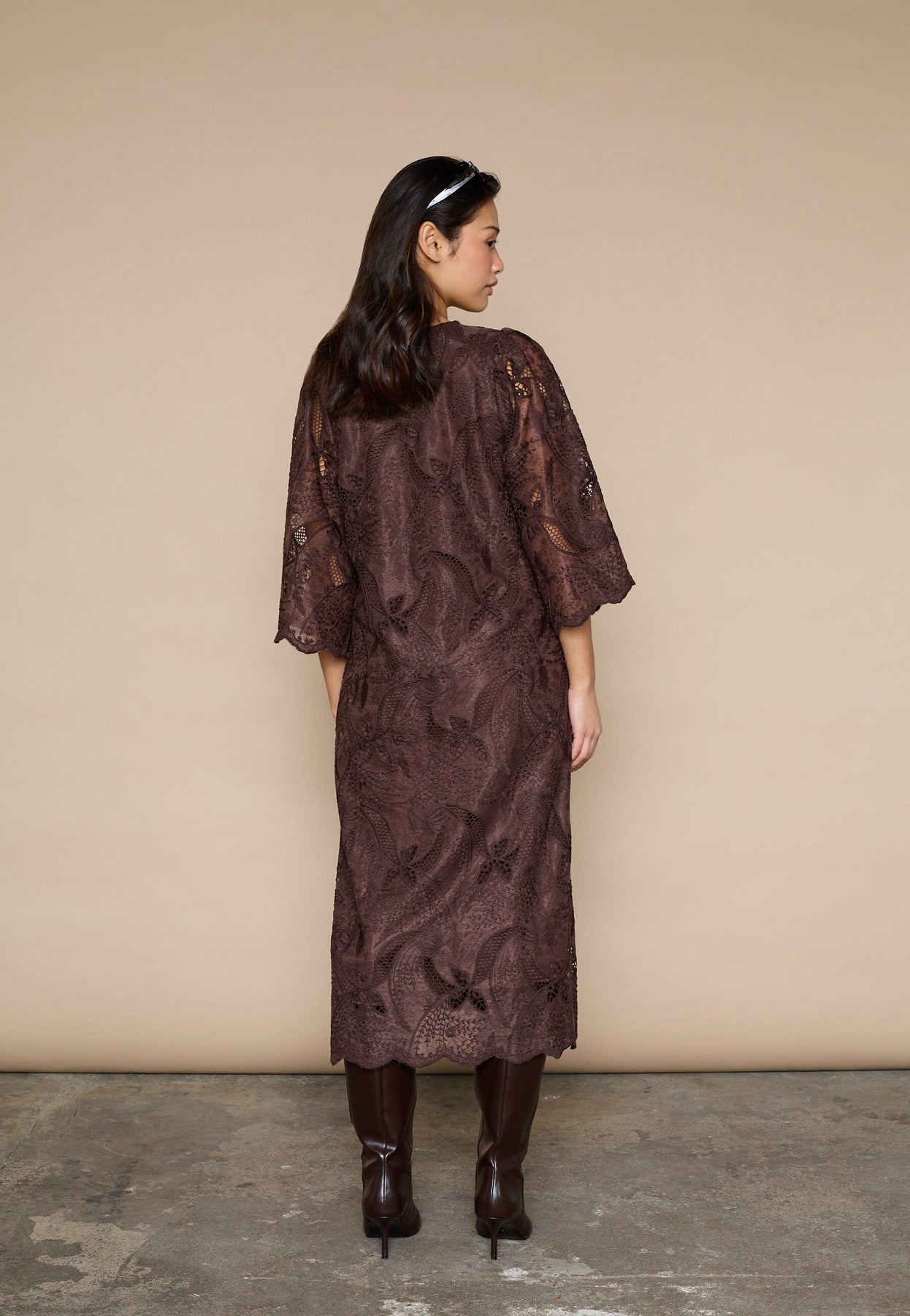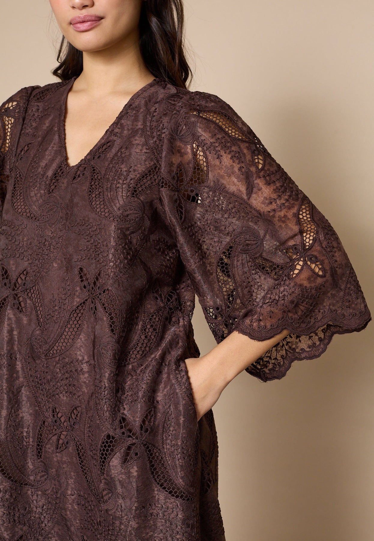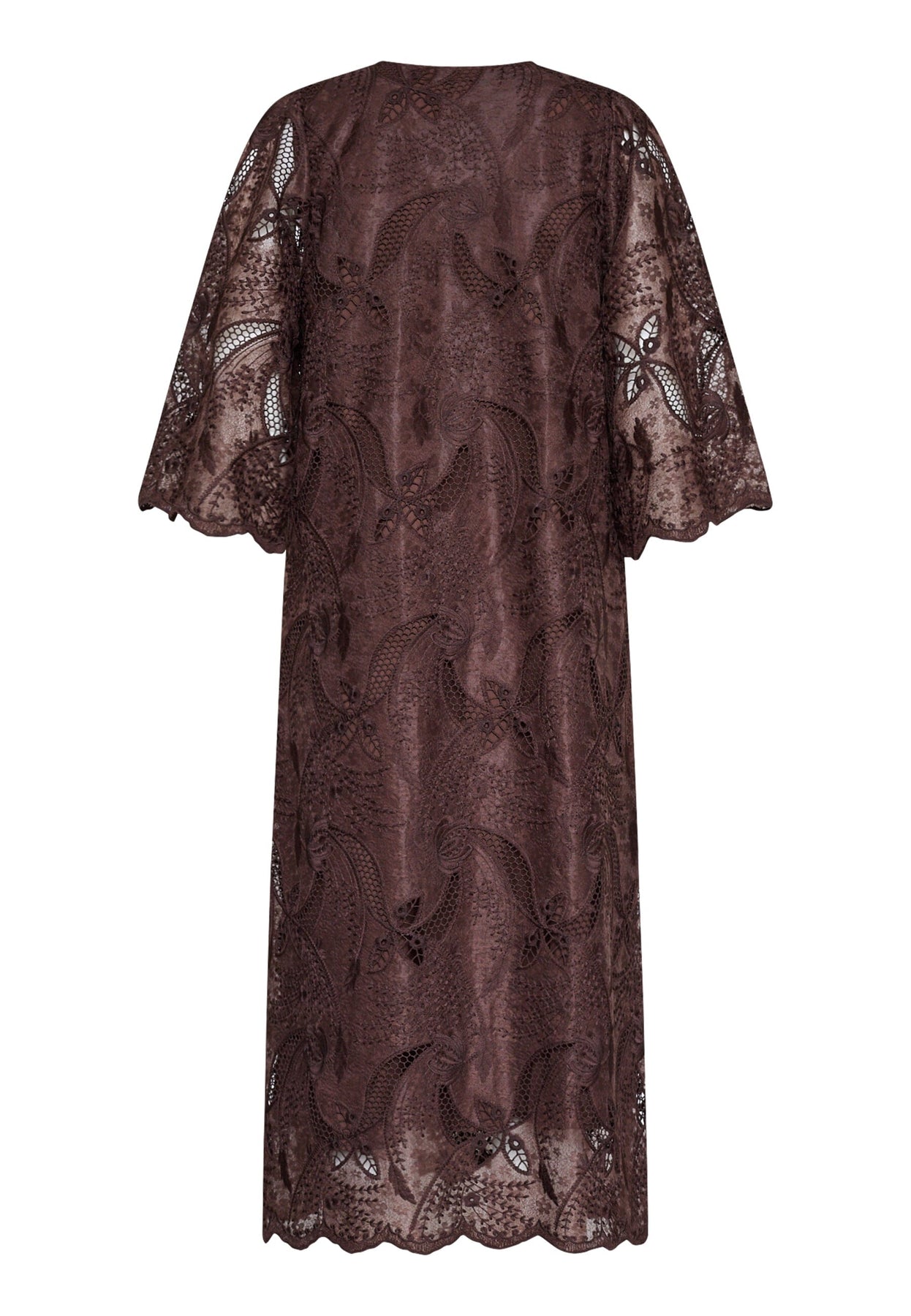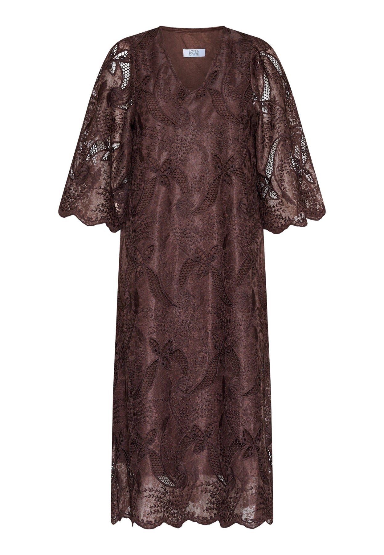 Robe marron de Love & Divine avec broderie et dentelle. La robe possède des manches trois-quarts, un décolleté en V et un motif floral et cachemire.