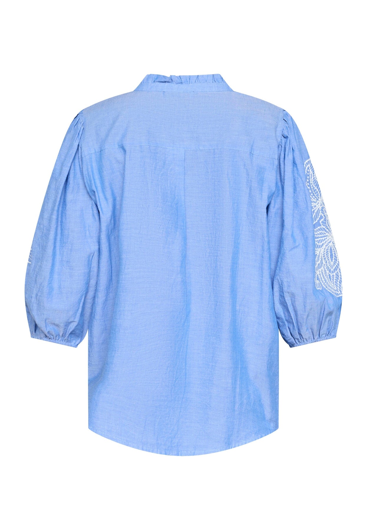 Chemise bleue de Love & Divine avec des broderies florales blanches. La chemise est en 100 % coton et présente une coupe ample avec des manches 3/4 bouffantes.
