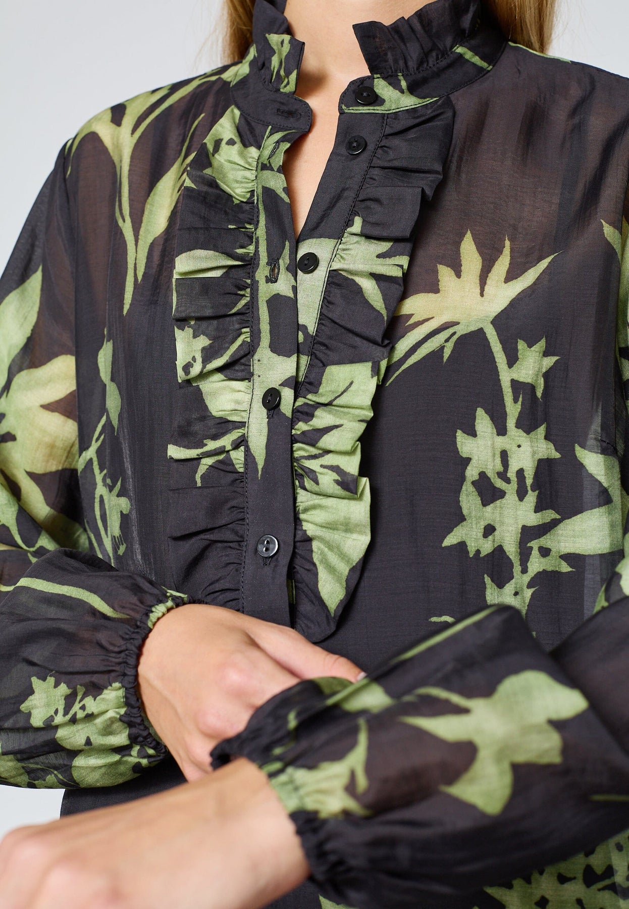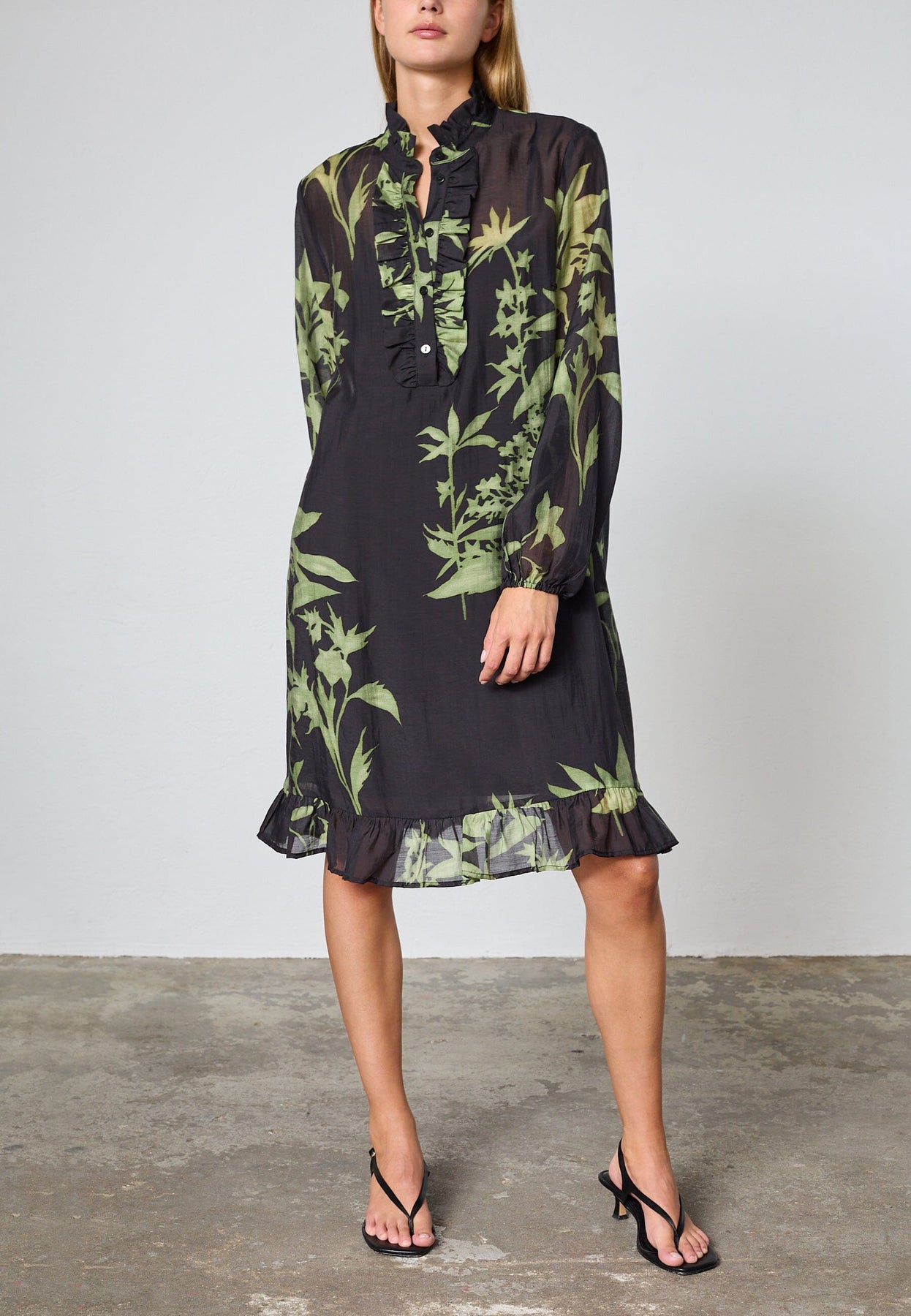 Robe longueur genou de Love & Divine avec motif de feuilles vertes sur fond sombre. La robe possède un petit col montant à volants et se ferme avec des boutons.