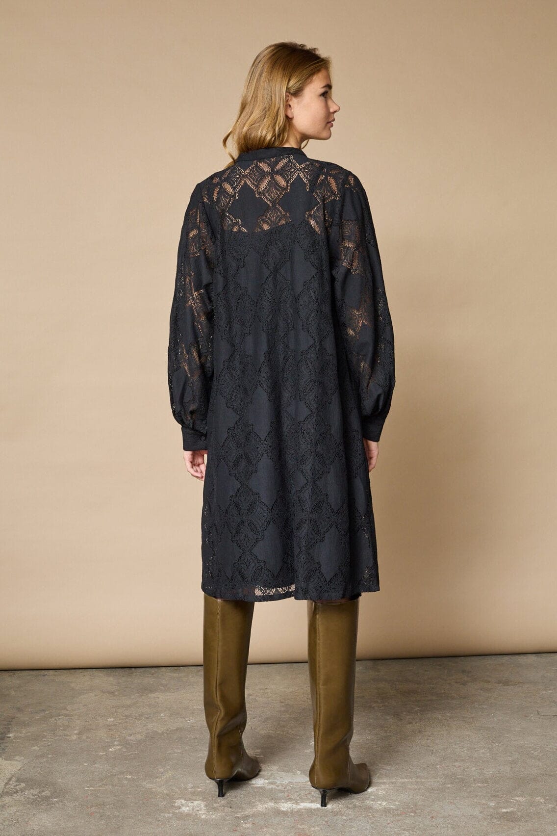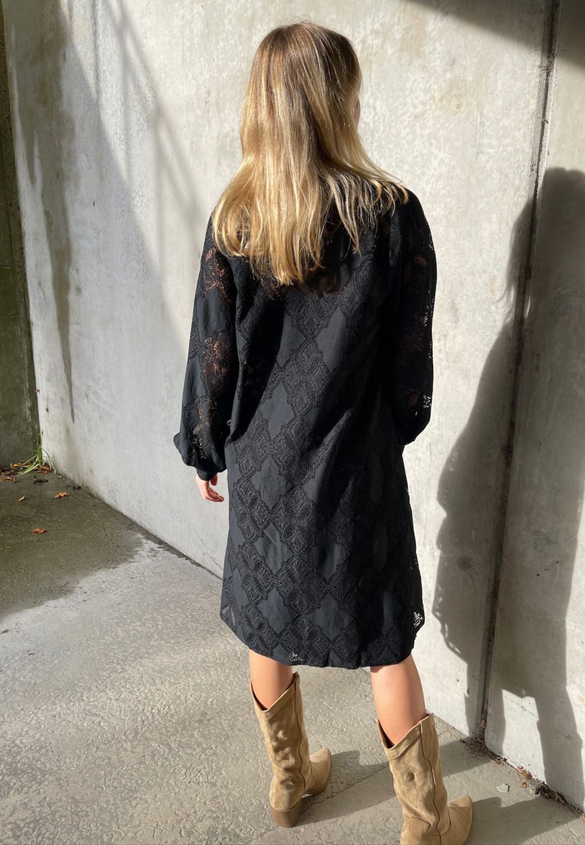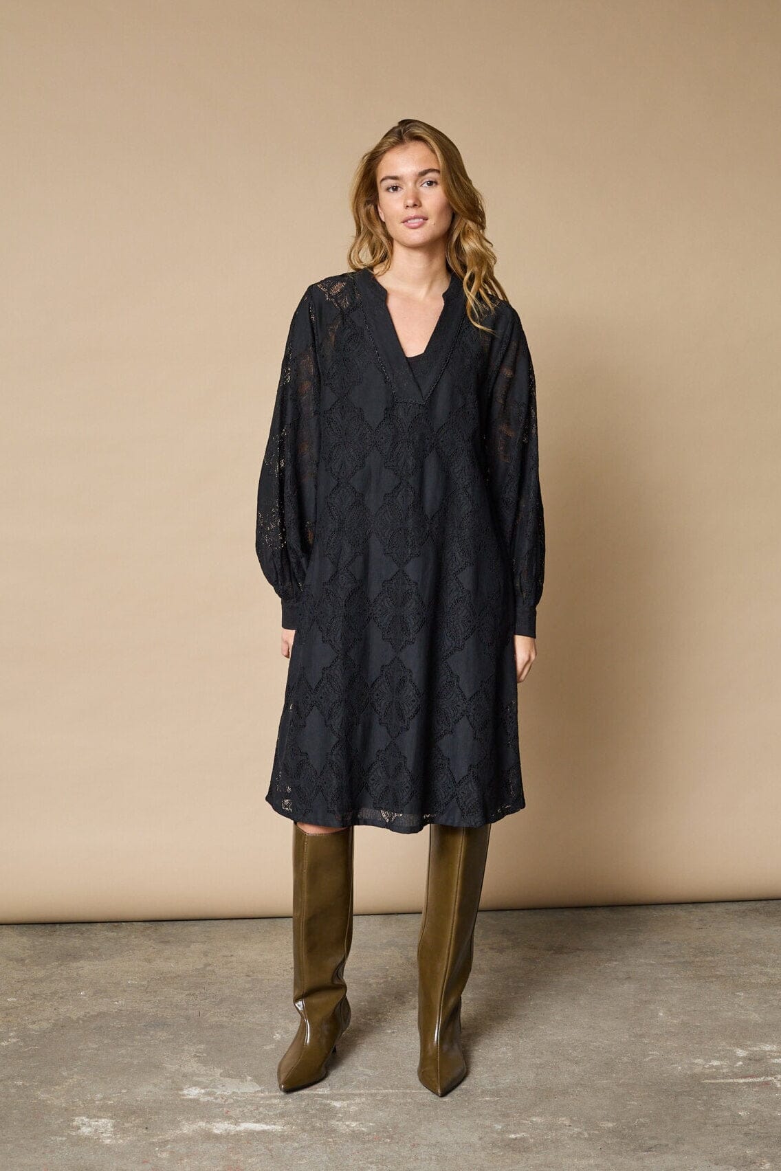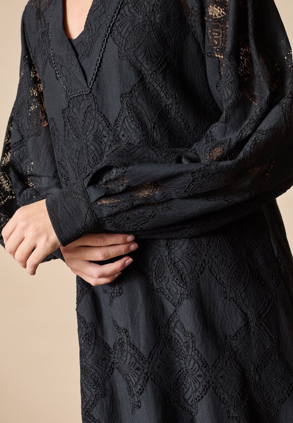 Robe noire de Love & Divine avec broderies et détails en dentelle dans le tissu. La robe a une longueur au genou et une coupe ample, et elle convient aussi bien aux occasions décontractées que festives et formelles.