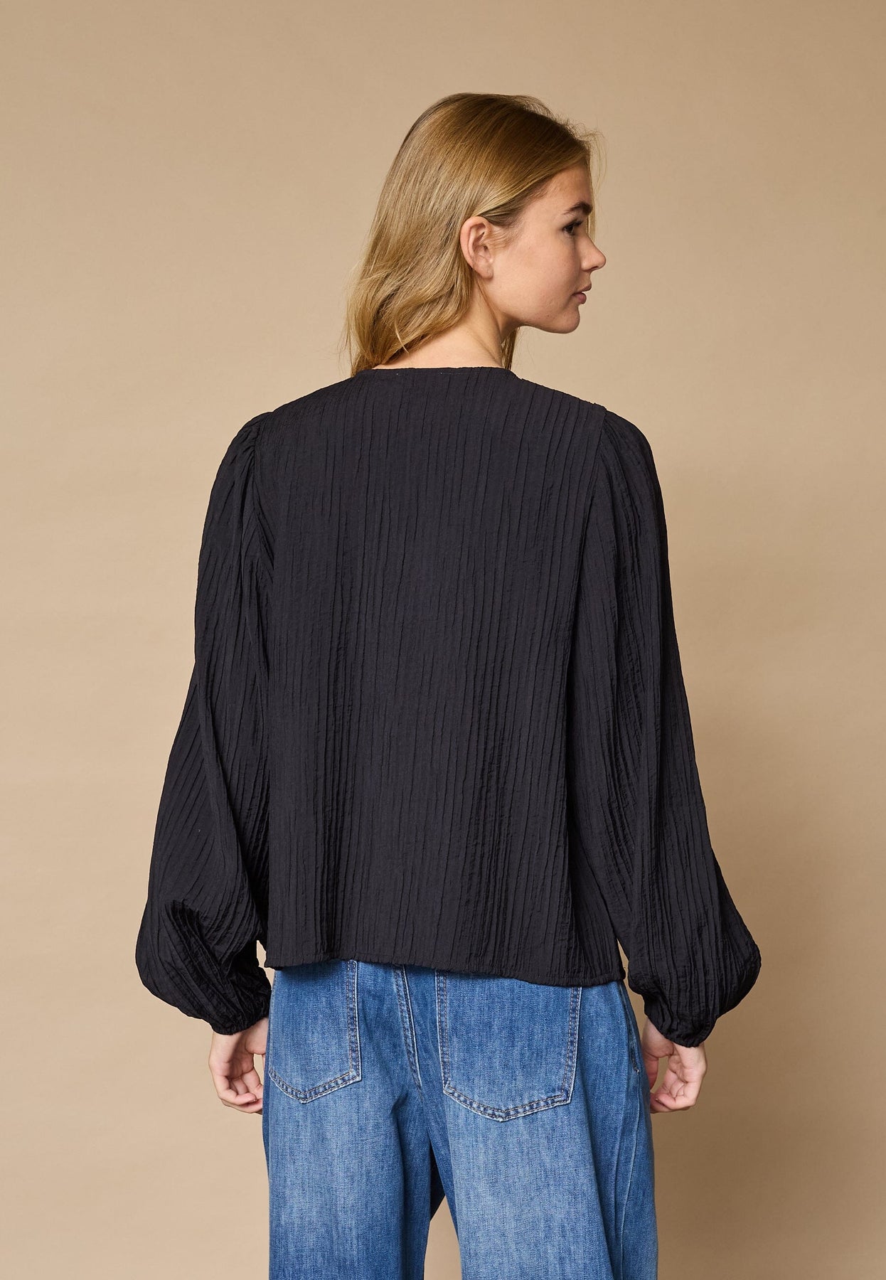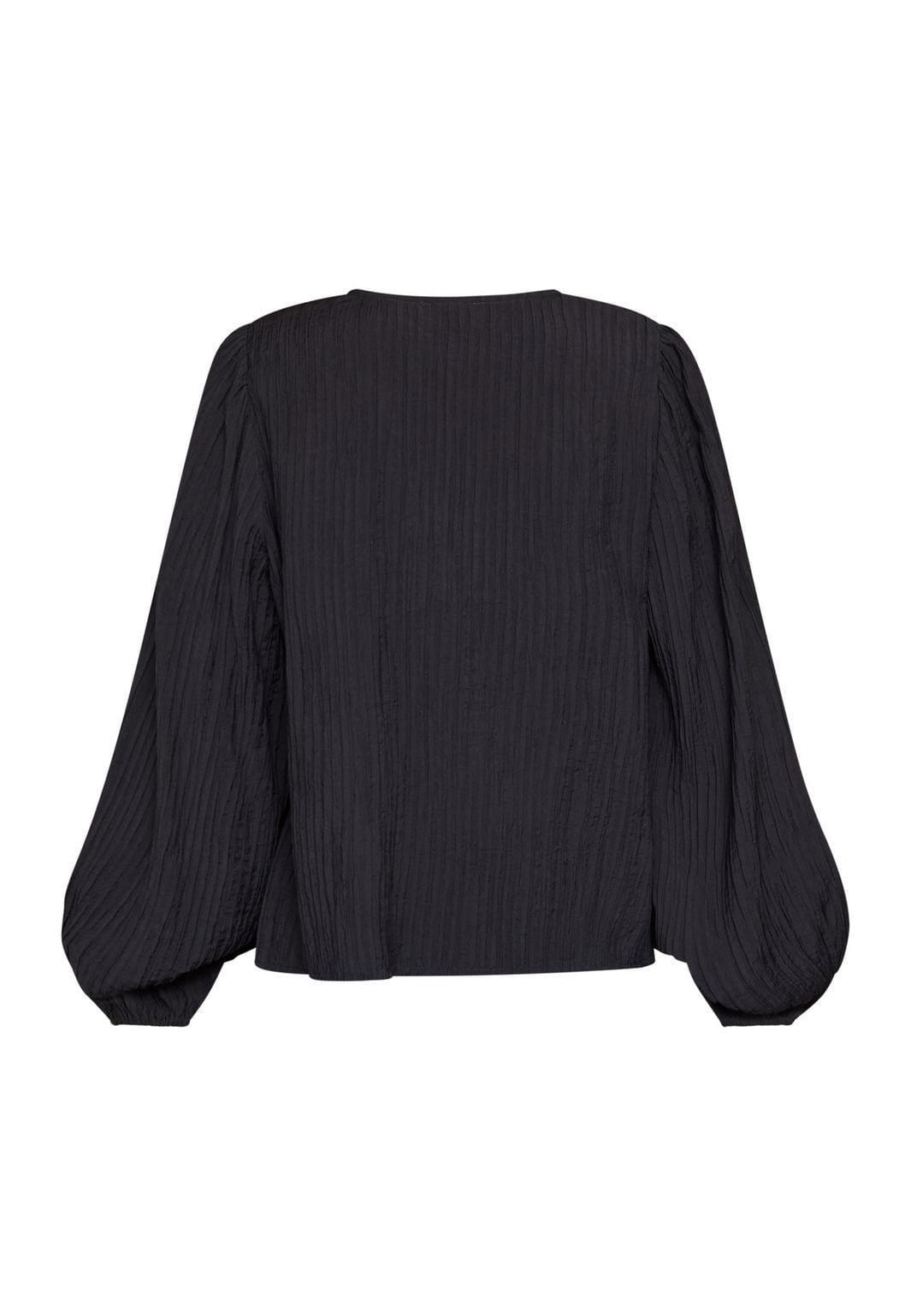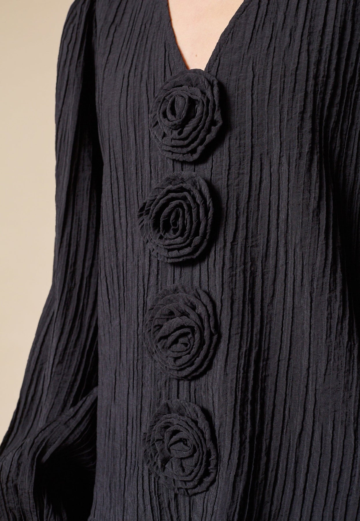Blouse noire de Love & Divine avec quatre détails décoratifs ressemblant à des fleurs sur le devant, des manches longues avec poignets légèrement bouffants et un décolleté en V.