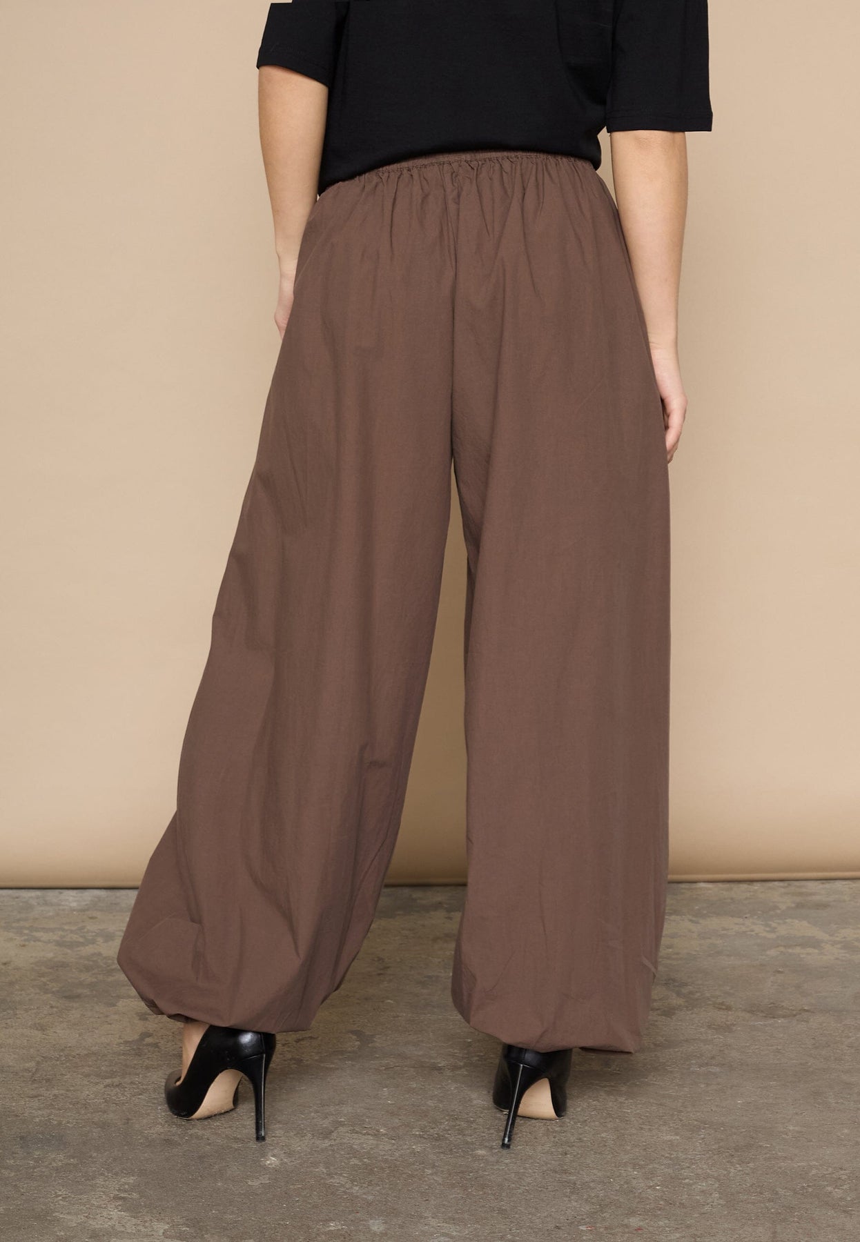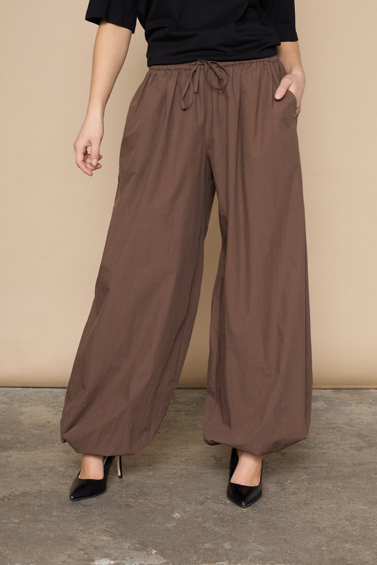 Pantalon marron foncé de Love & Divine, en coton. Le pantalon présente des jambes larges et une coupe ample avec taille élastique et cordon de serrage.