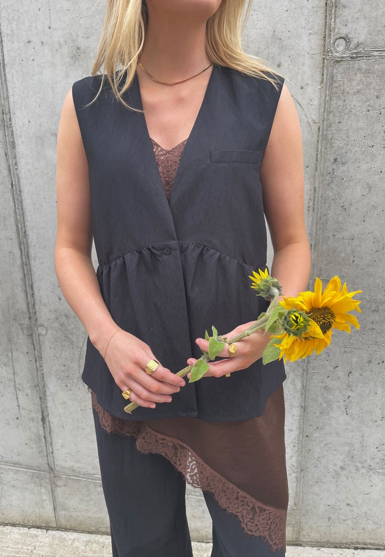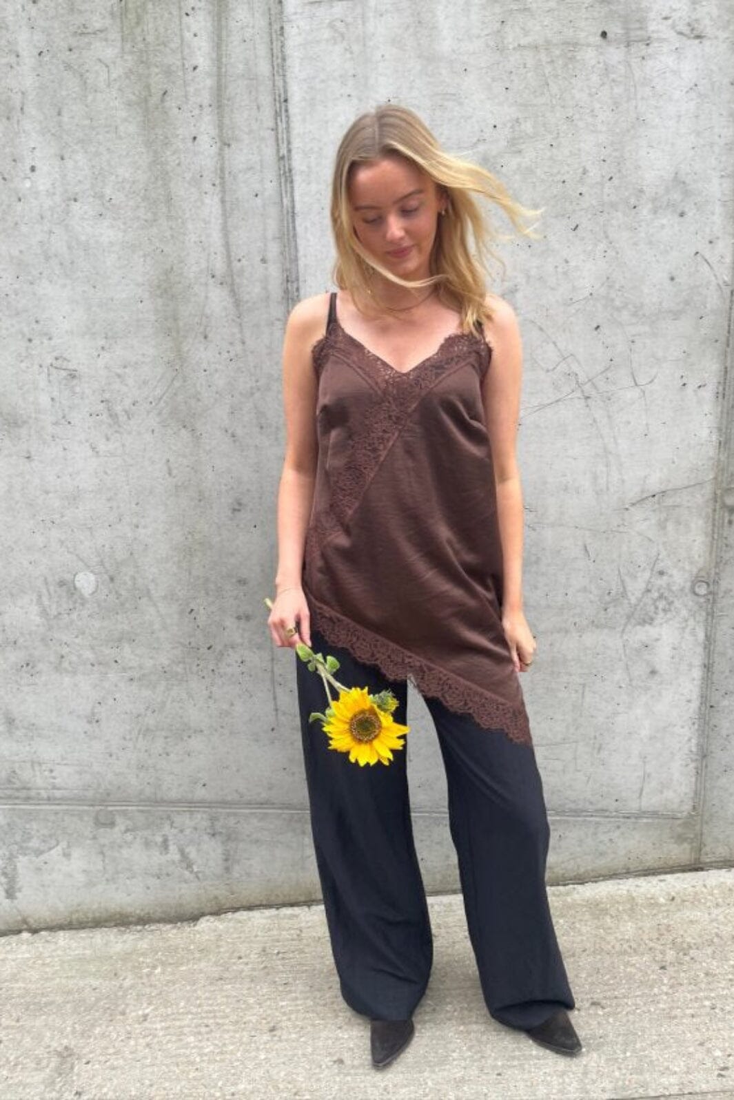 Top en satin brun de Love & Divine avec des détails en dentelle. Le top possède une base asymétrique avec dentelle au bas et de fines bretelles spaghetti avec encolure en V.