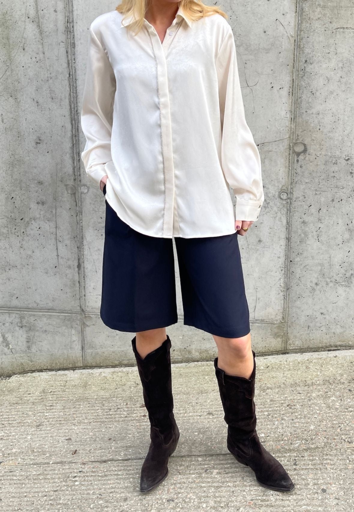 Chemise couleur crème de Love & Divine avec col classique et manches longues. La chemise présente des paillettes le long de la patte de boutonnage et des poignets à boutons.