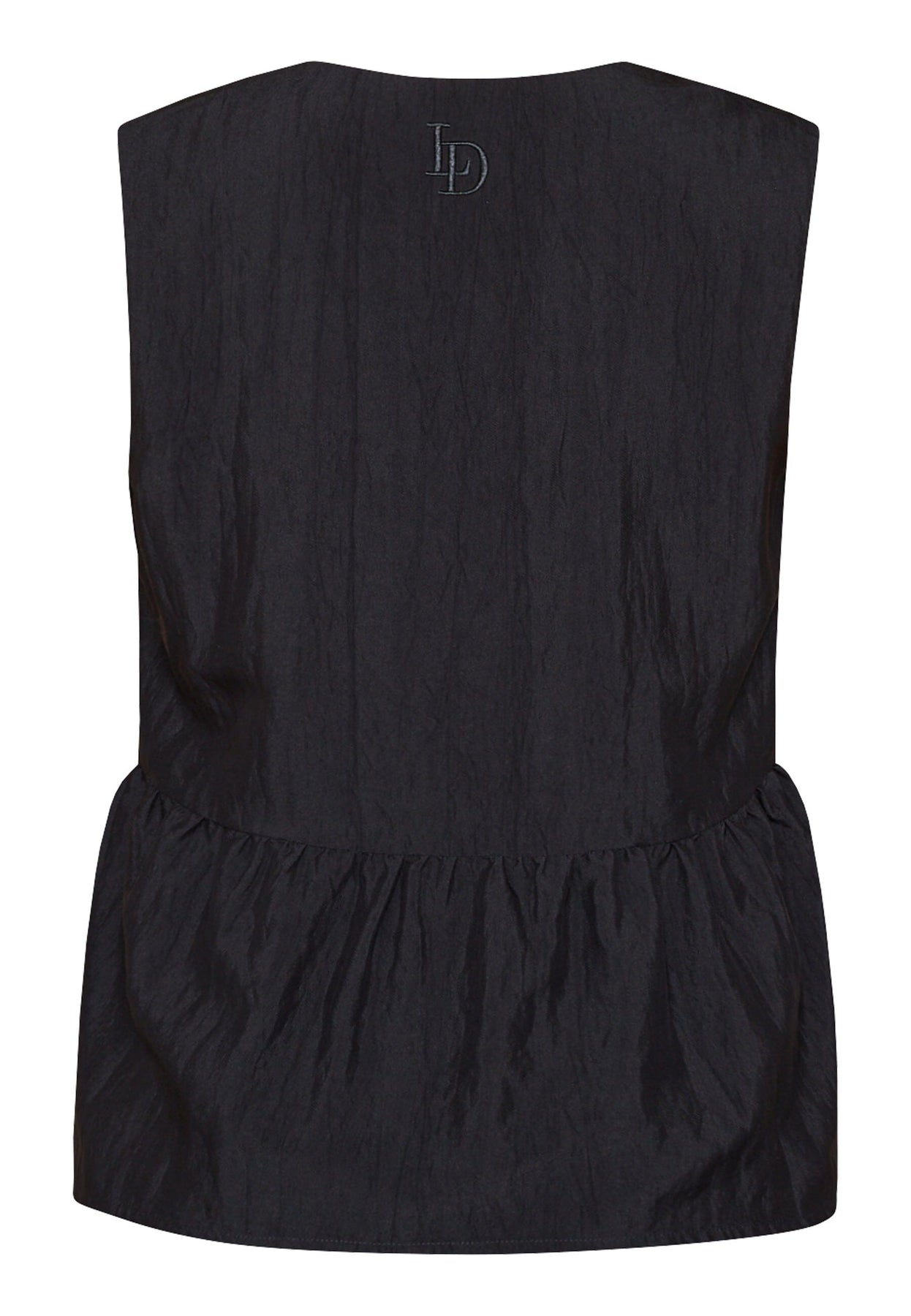 Top sans manches noire de Love & Divine avec décolleté en V et fronces. Le top a une fermeture à boutons et est fabriqué dans un design noir uni.