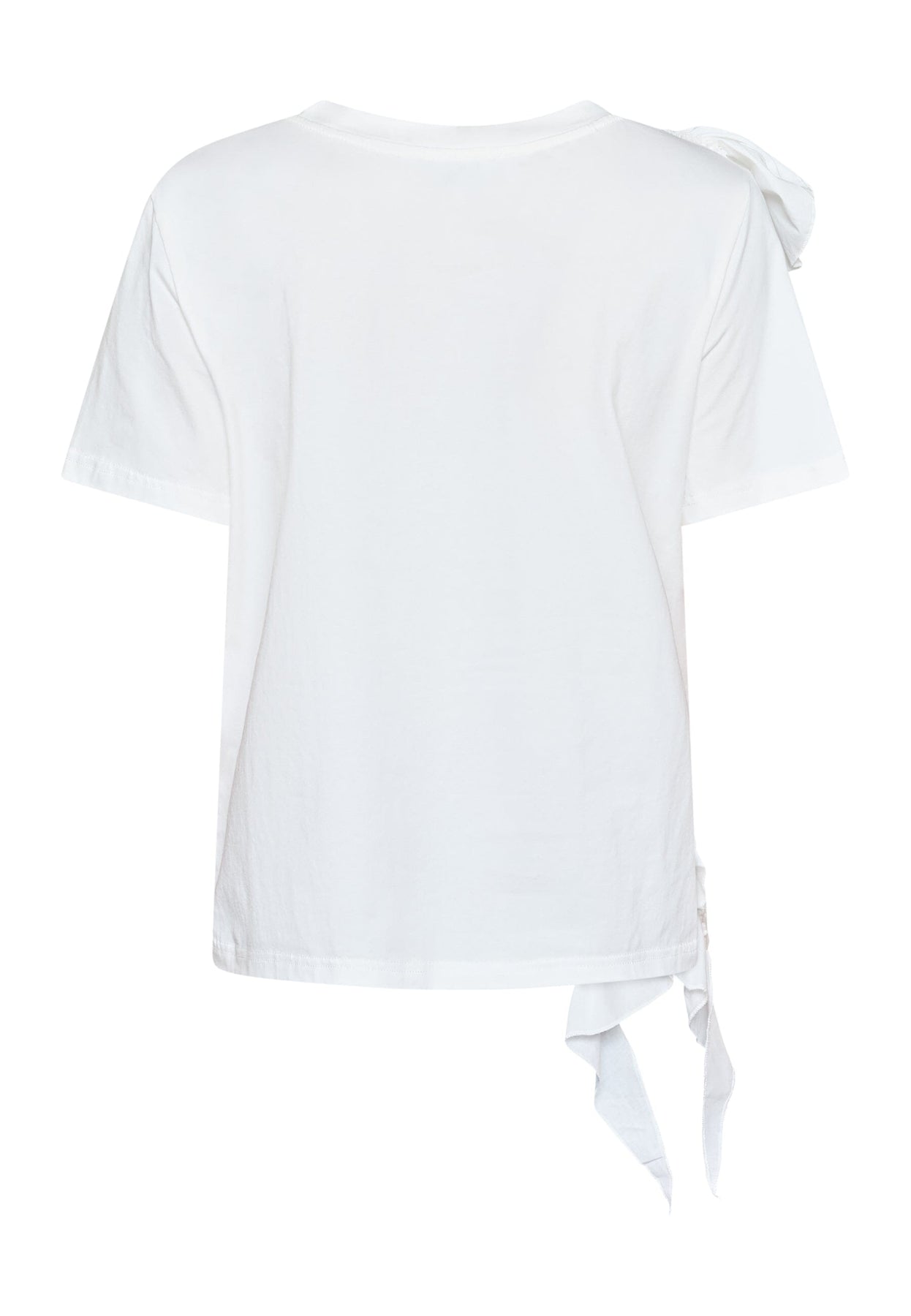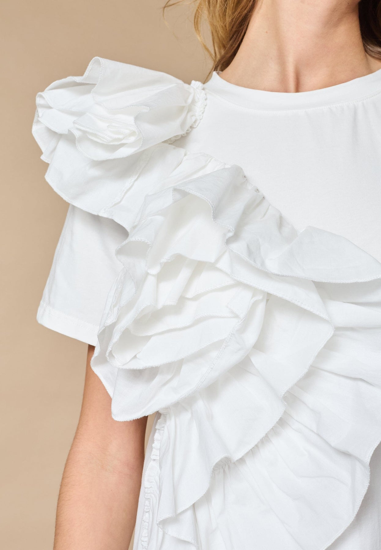 T-shirt blanc Love & Divine au design asymétrique. Le haut est orné de grands volants volumineux descendant sur une épaule et la poitrine.