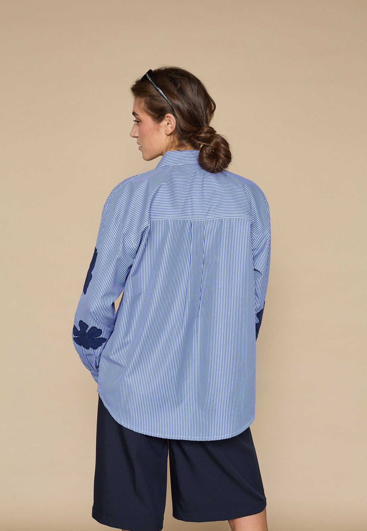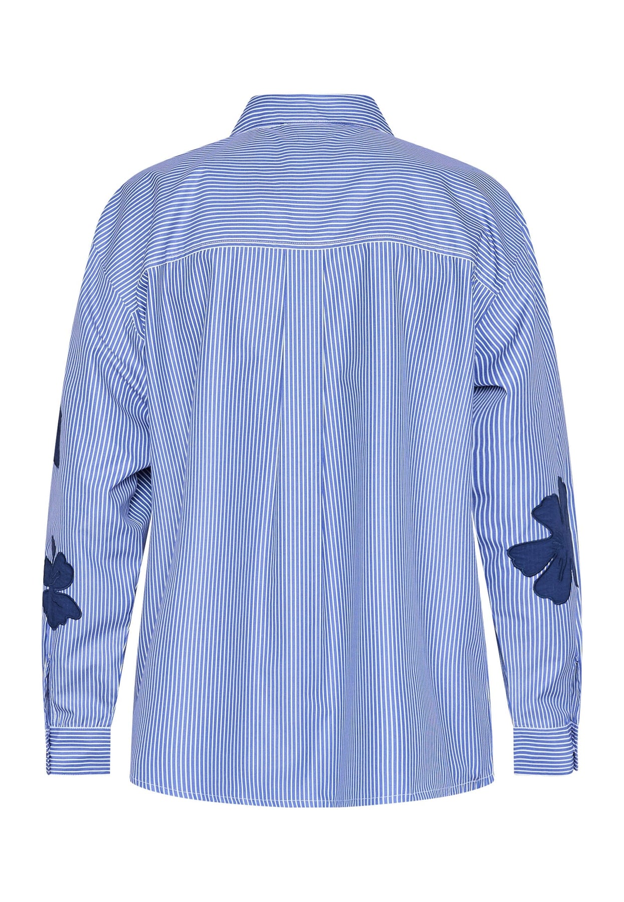 Chemise rayée de Love & Divine avec de grandes applications florales bleu foncé. La chemise est fabriquée en 100 % coton et a une coupe décontractée.