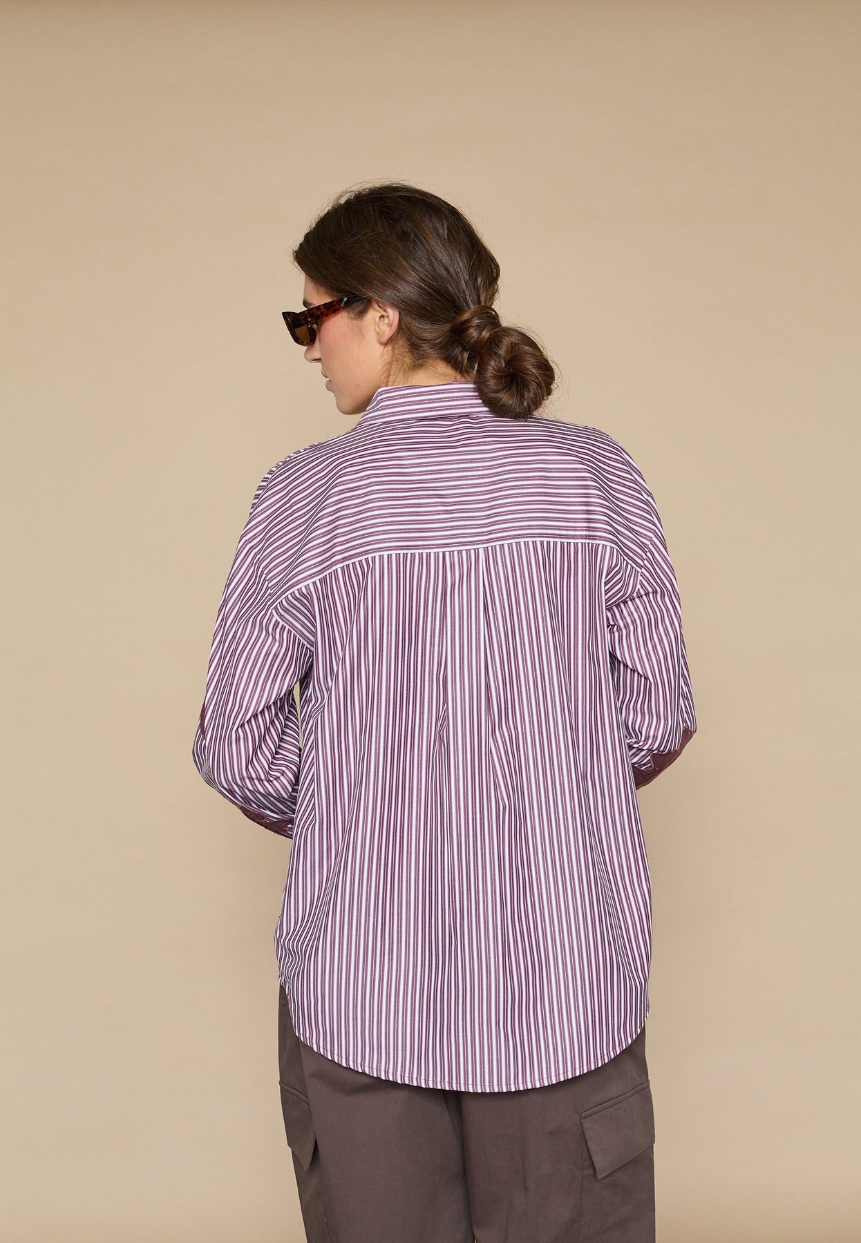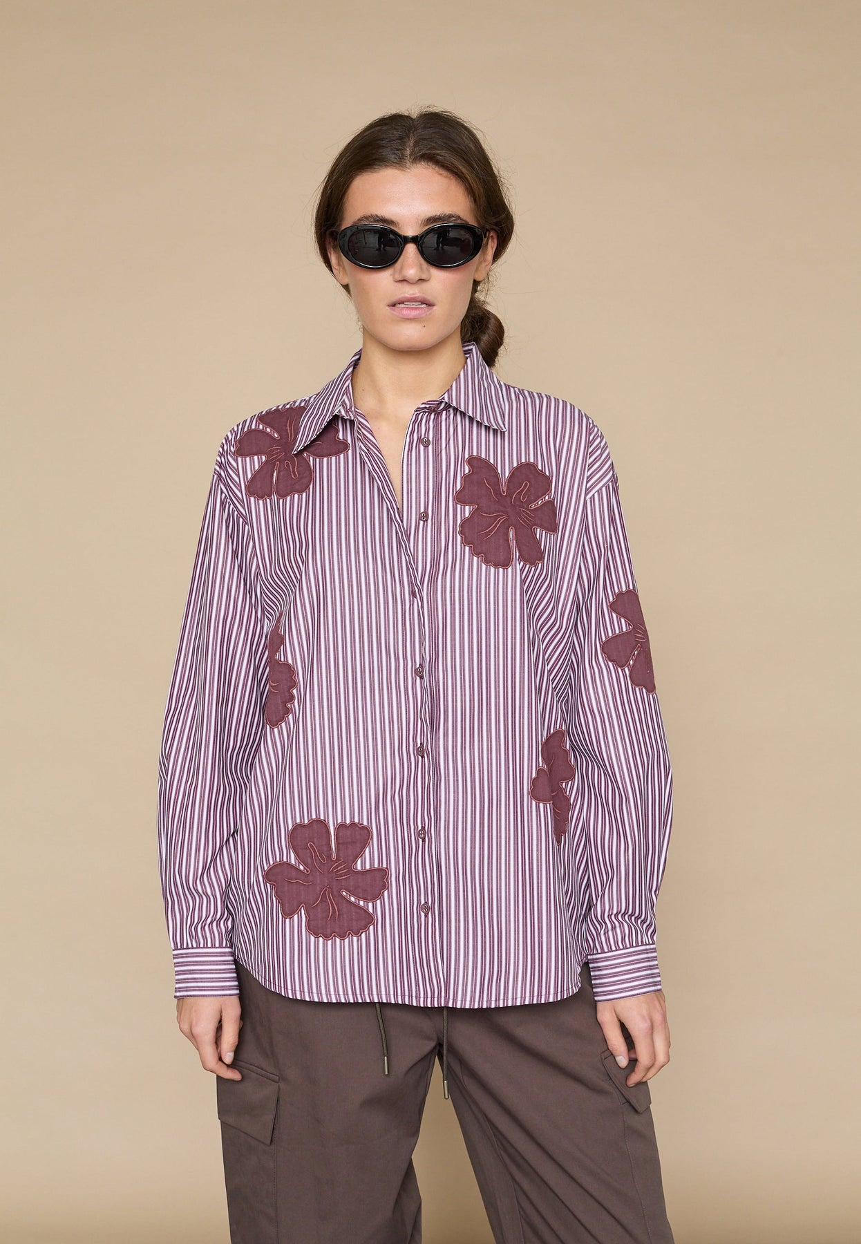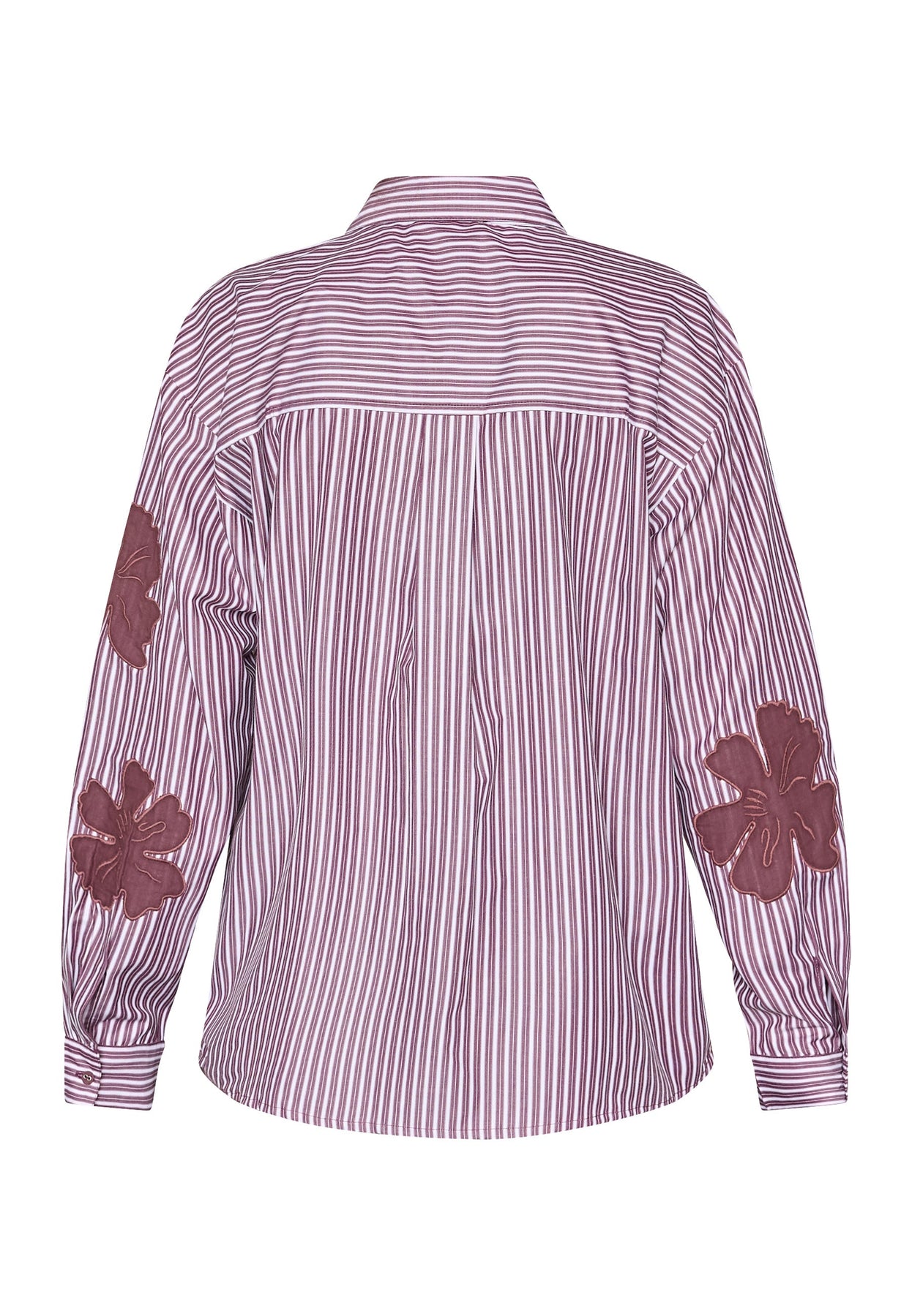 Chemise rayée de Love & Divine avec de grandes appliques florales en bordeaux. La chemise a un col classique et une fermeture à boutons.