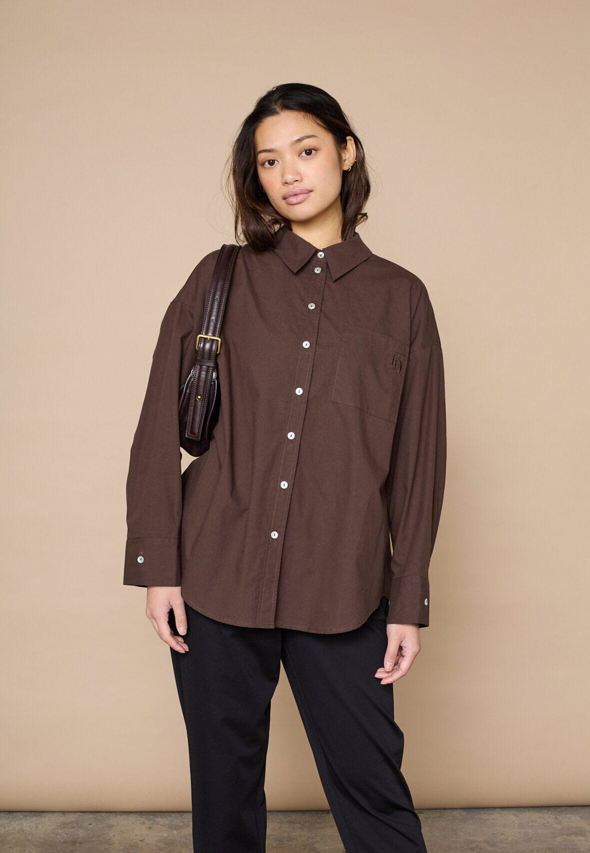 Chemise marron de Love & Divine avec broderie sur la poche poitrine. La chemise présente une coupe oversize, des manches longues et une fermeture boutonnée sur le devant.