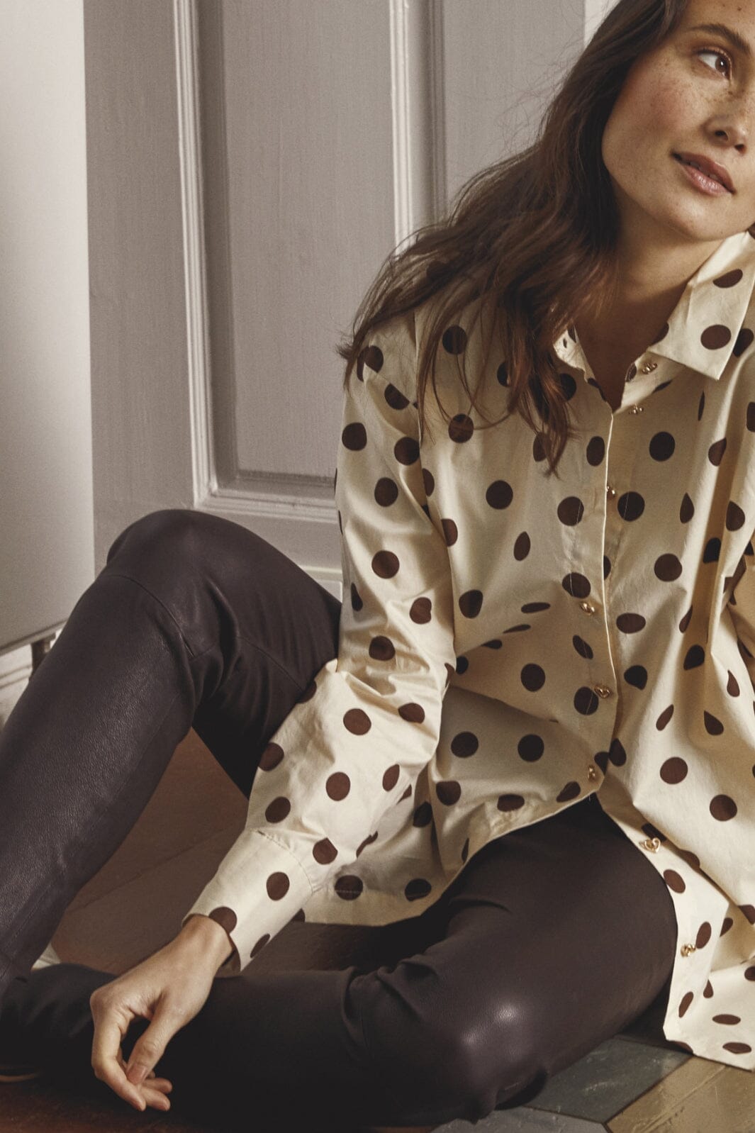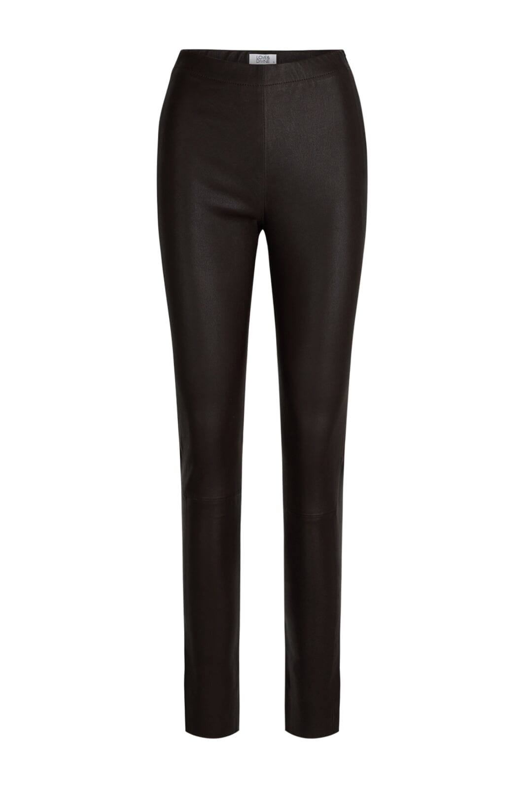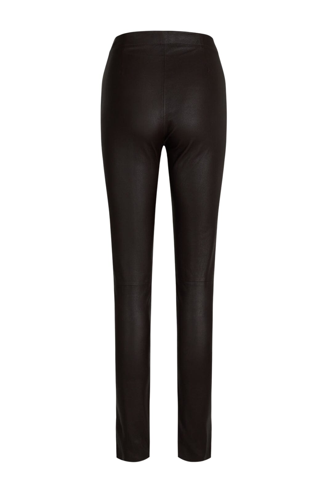 Pantalons en cuir de Love & Divine en couleur chocolat. Ils ont une fermeture éclair dans la couture latérale à la taille et une coupe slim fit avec une longueur longue.