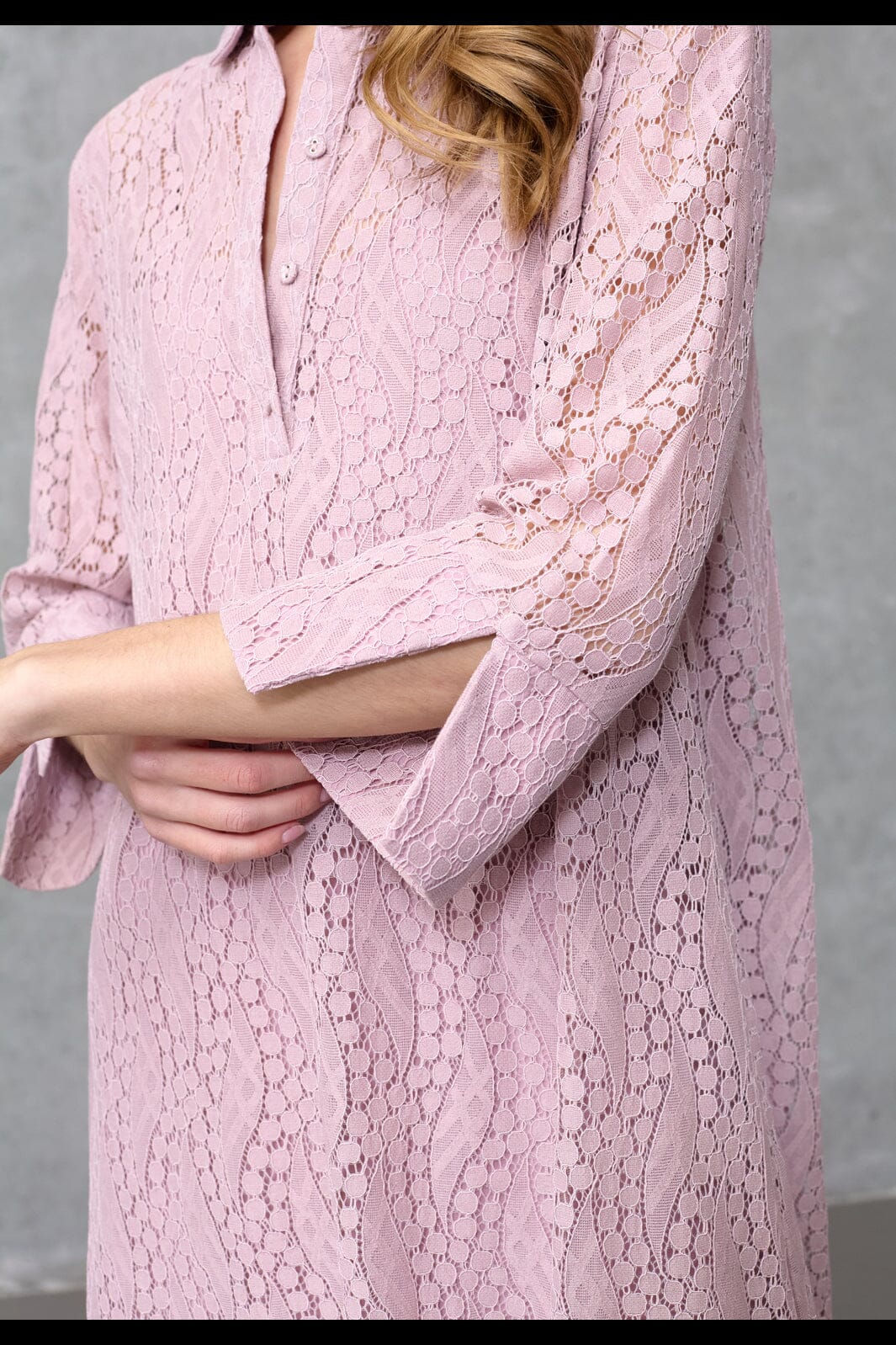 Robe en dentelle de Love & Divine dans une nuance lilas-rose. La robe possède un col chemise, des manches trois-quarts et une coupe ample.
