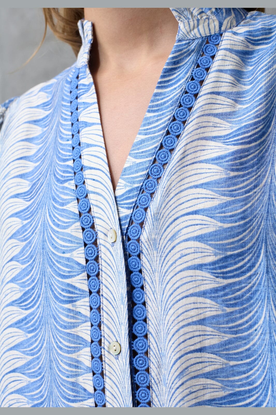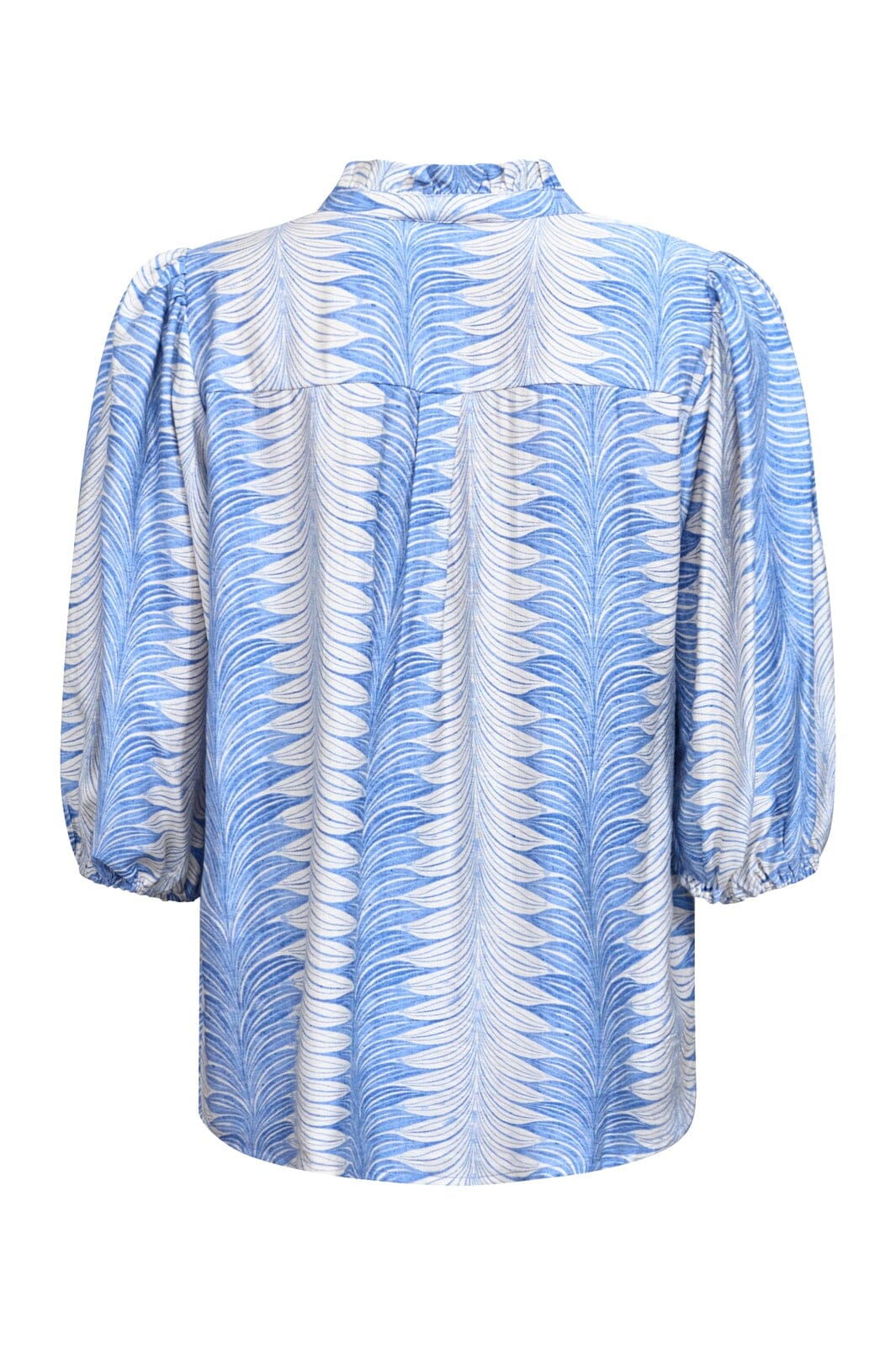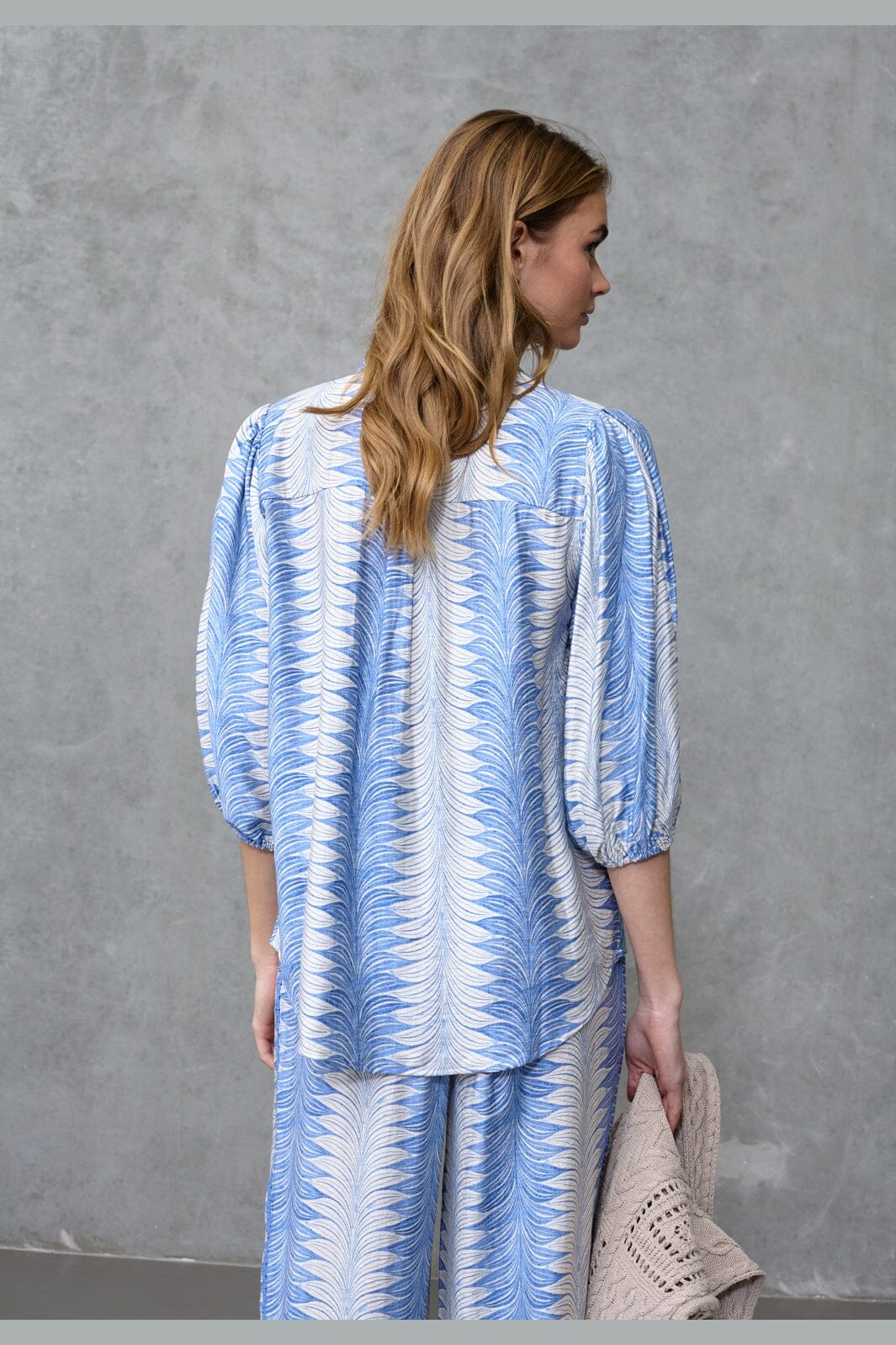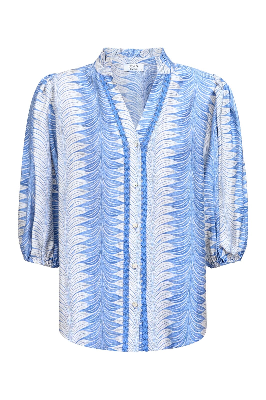 Blouse de Love & Divine avec un imprimé graphique bleu, crème et blanc. La blouse présente un décolleté en V et des manches ballon trois-quarts avec élastique.