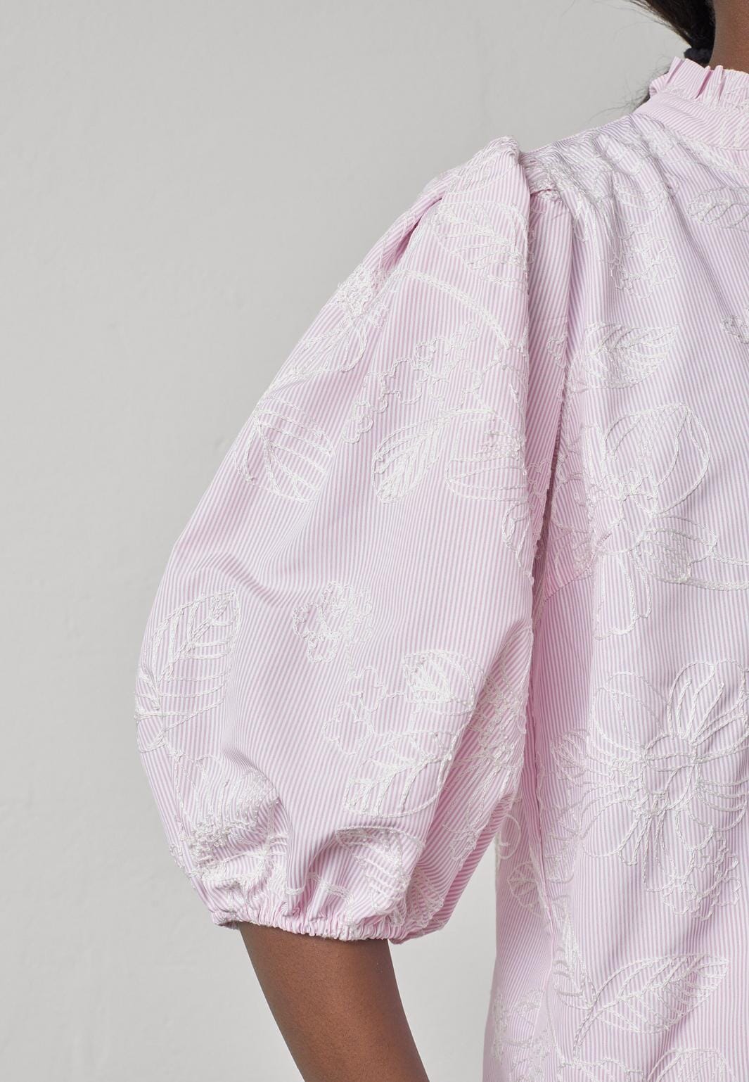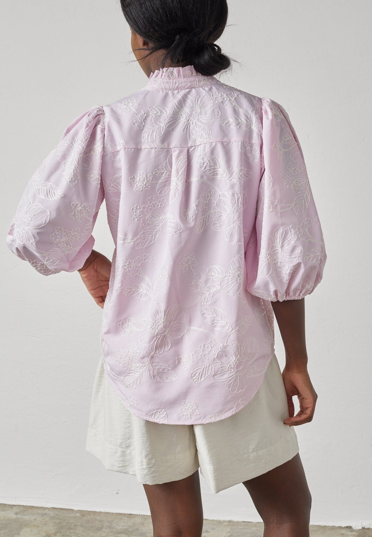 Blouse rayée rose de Love & Divine avec broderie florale. La blouse a un col haut avec un col froncé et des manches courtes bouffantes. Les boutons à l'avant la rendent facile à enfiler et à enlever.