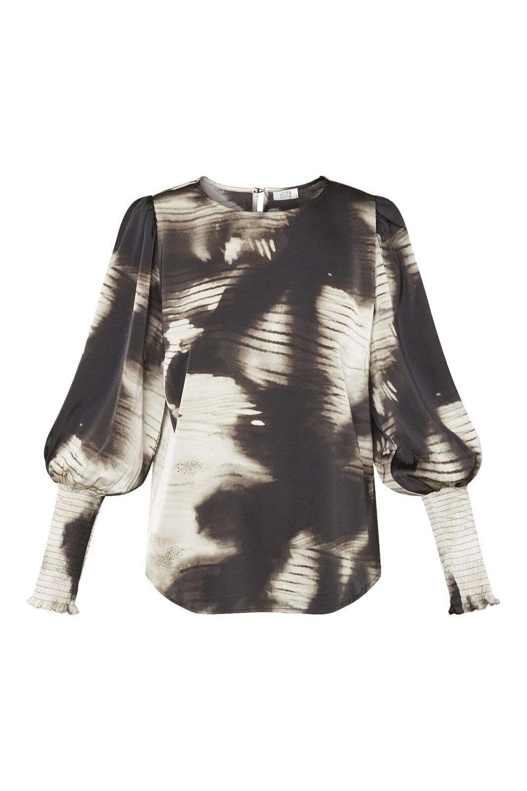 Blouse Love & Divine avec imprimé graphique noir, crème et blanc. La blouse possède des manches longues et une coupe ample.