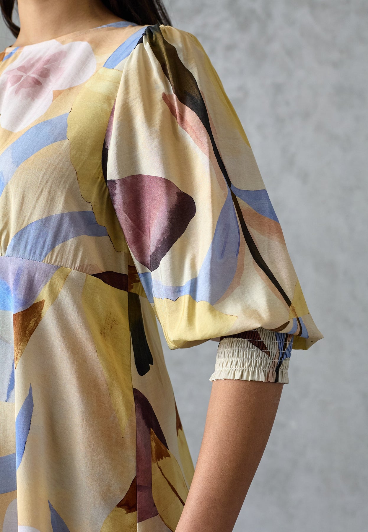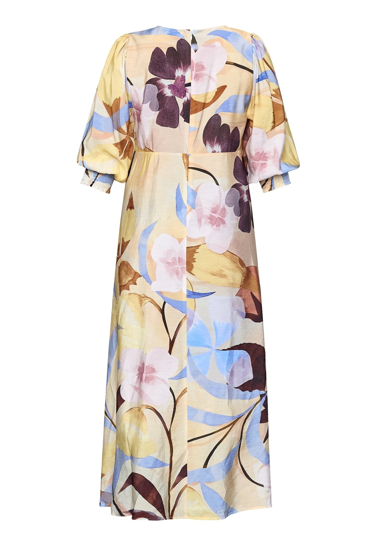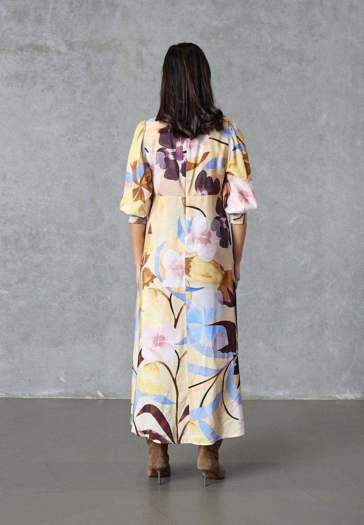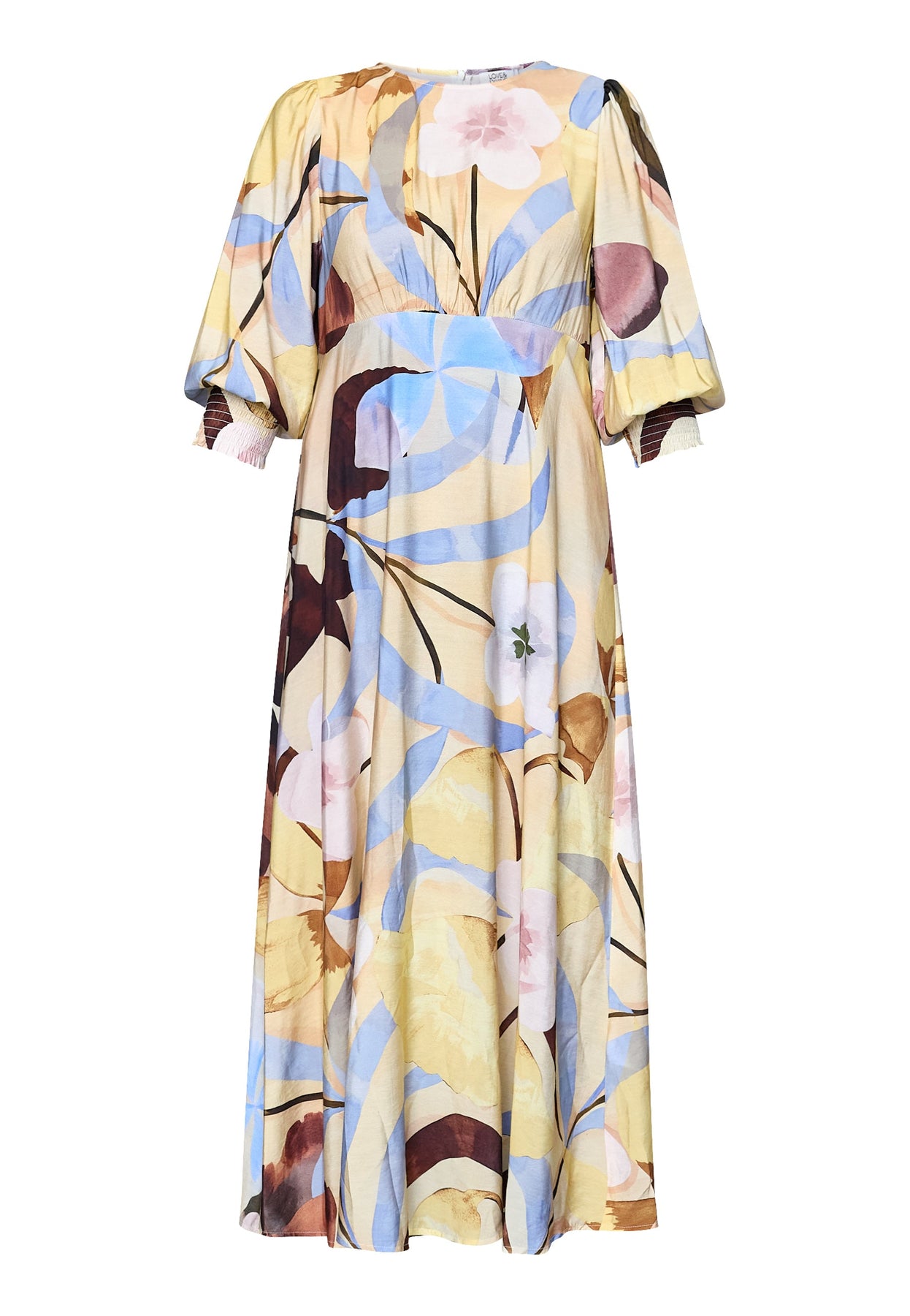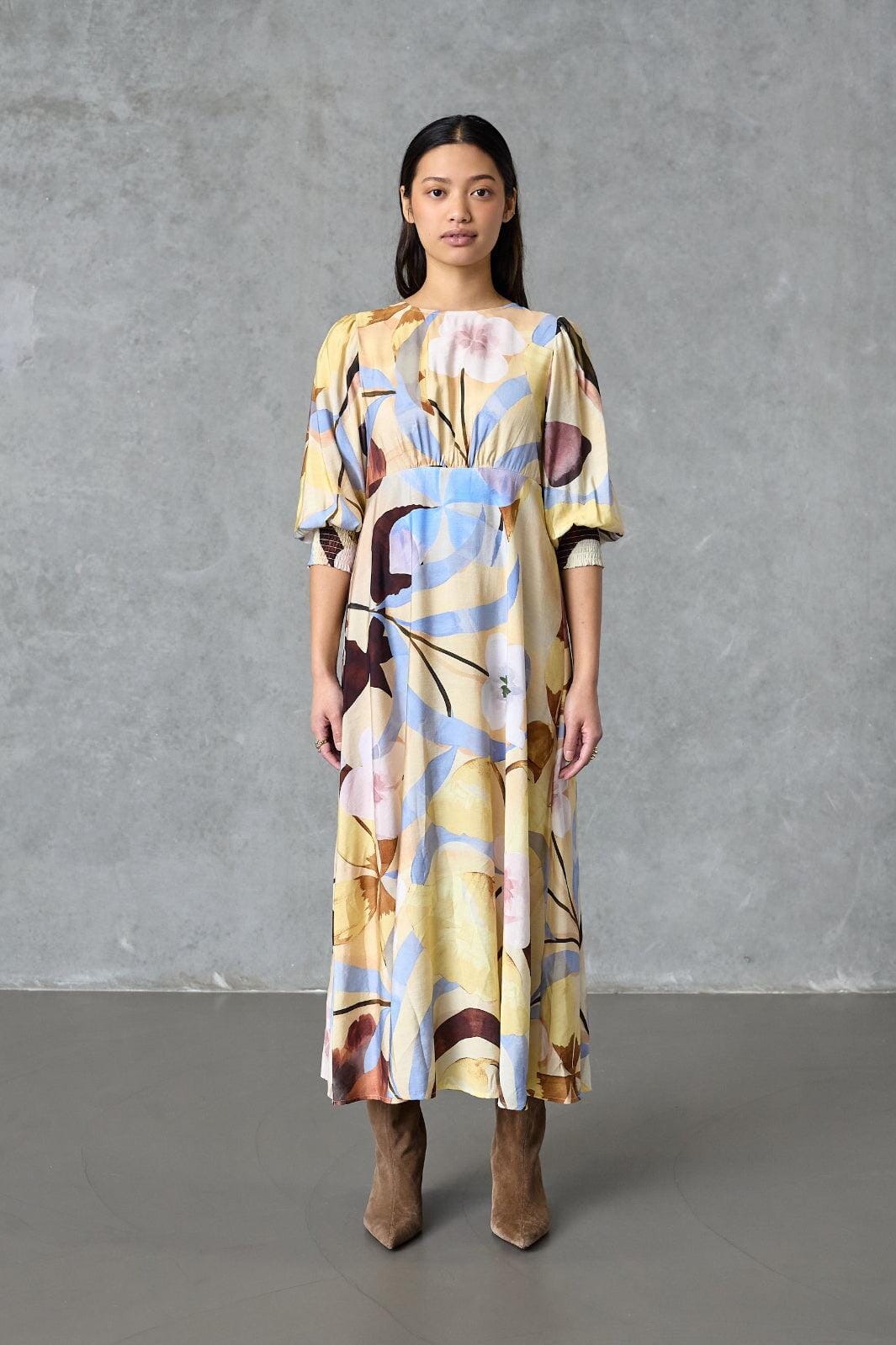Robe Love & Divine avec un motif fleuri dans des nuances de jaune, bleu clair, rose et marron sur un fond clair.