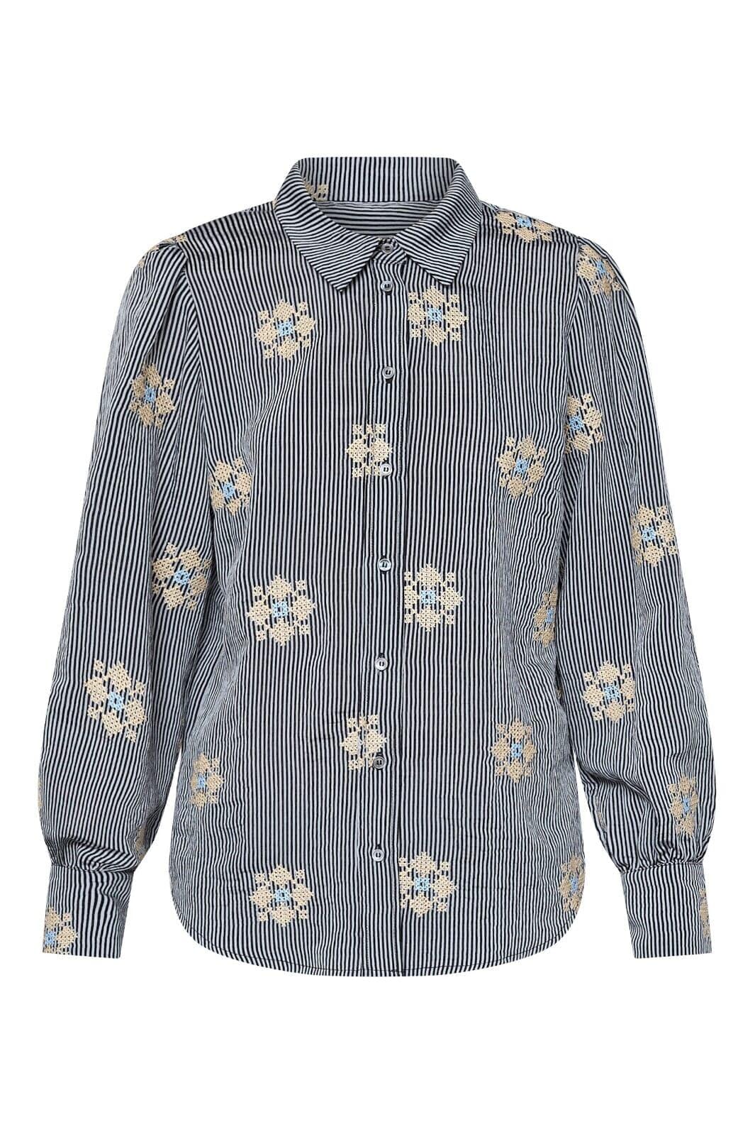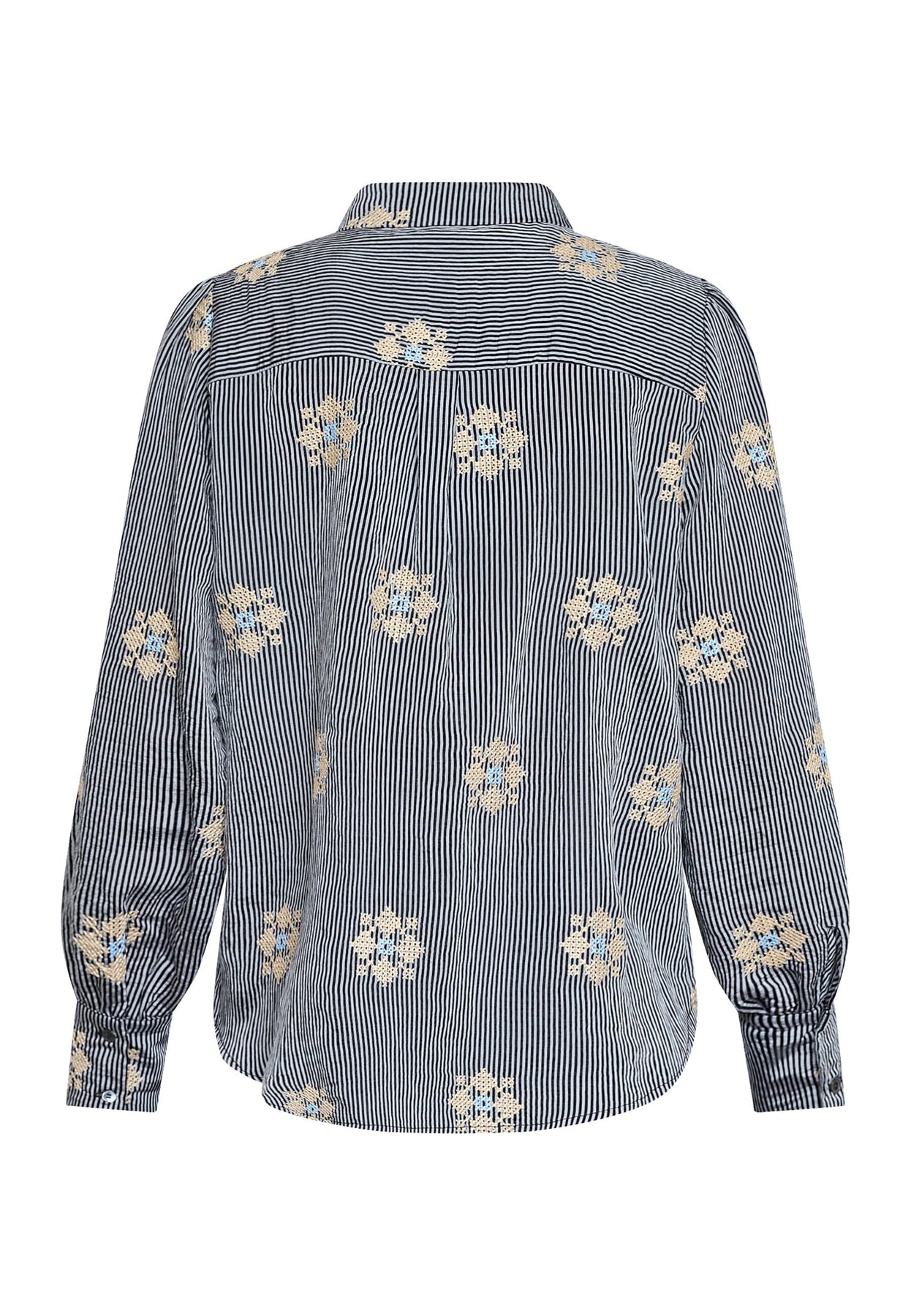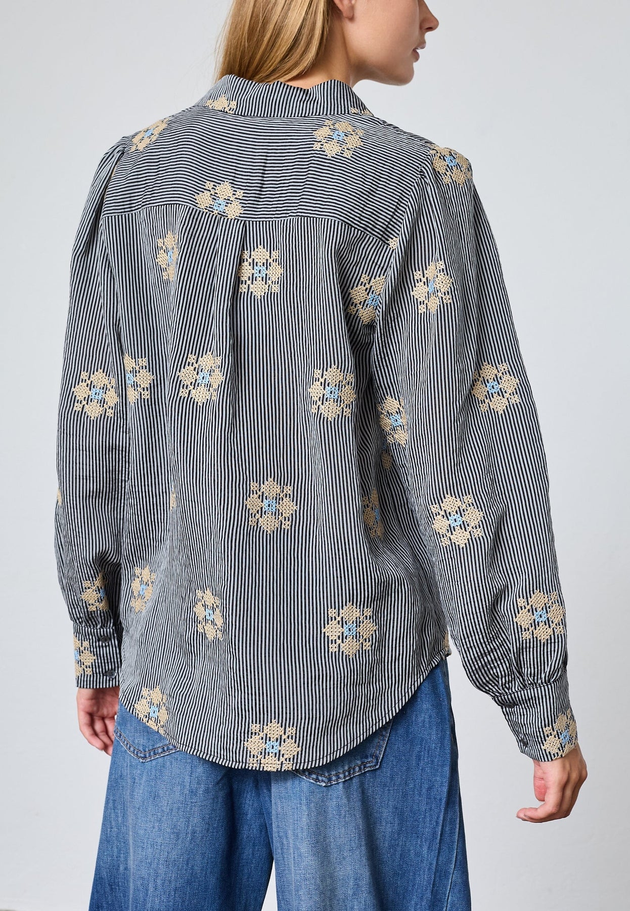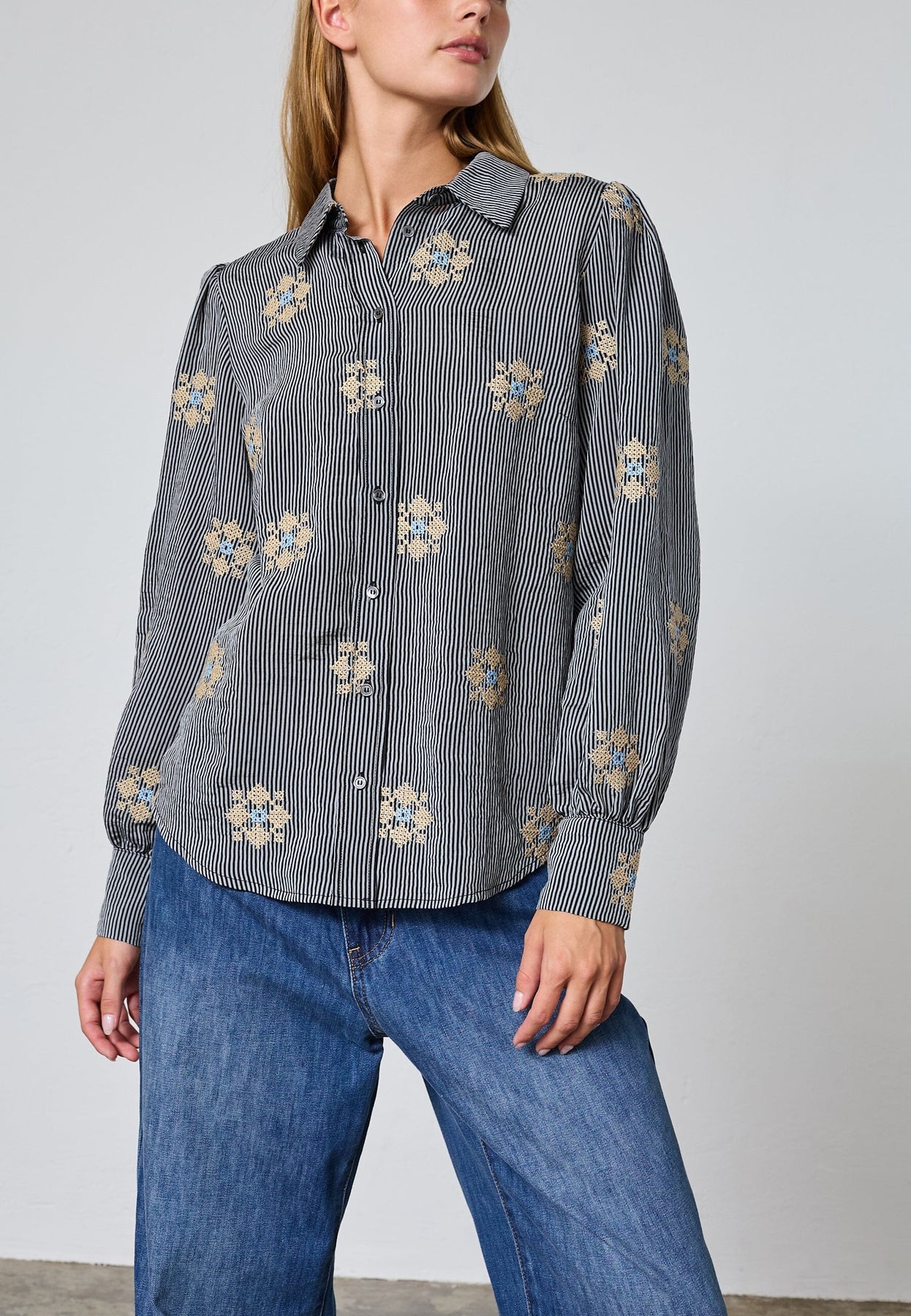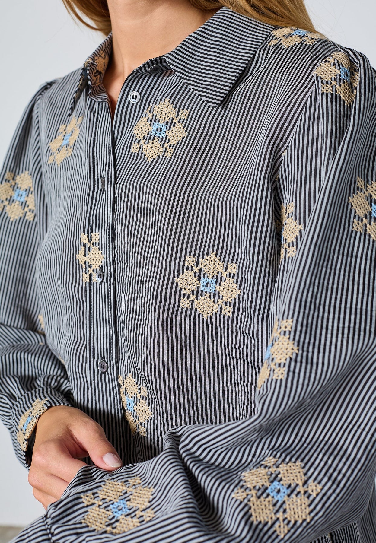 Chemise rayée de Love & Divine avec des rayures noires et blanches. La chemise présente des détails de fleurs brodées qui créent un contraste avec le motif rayé.