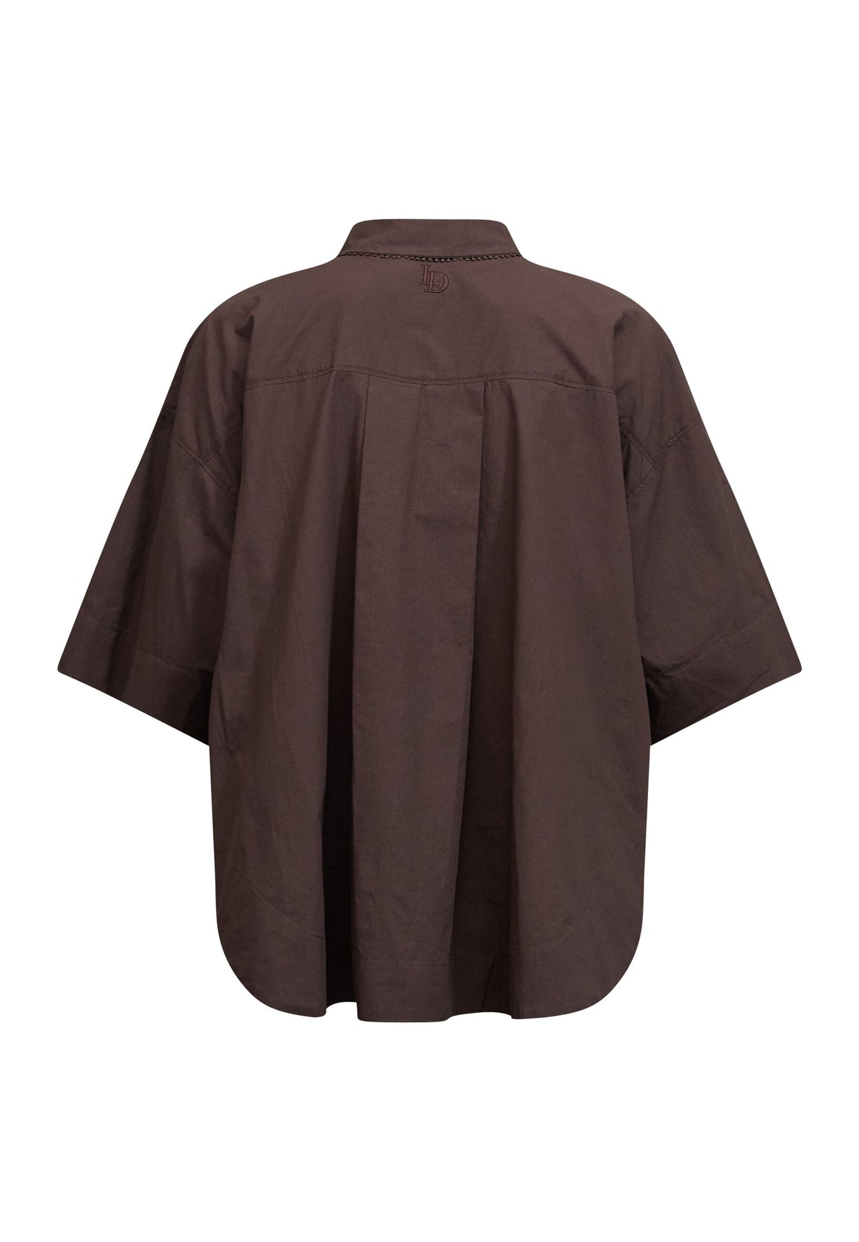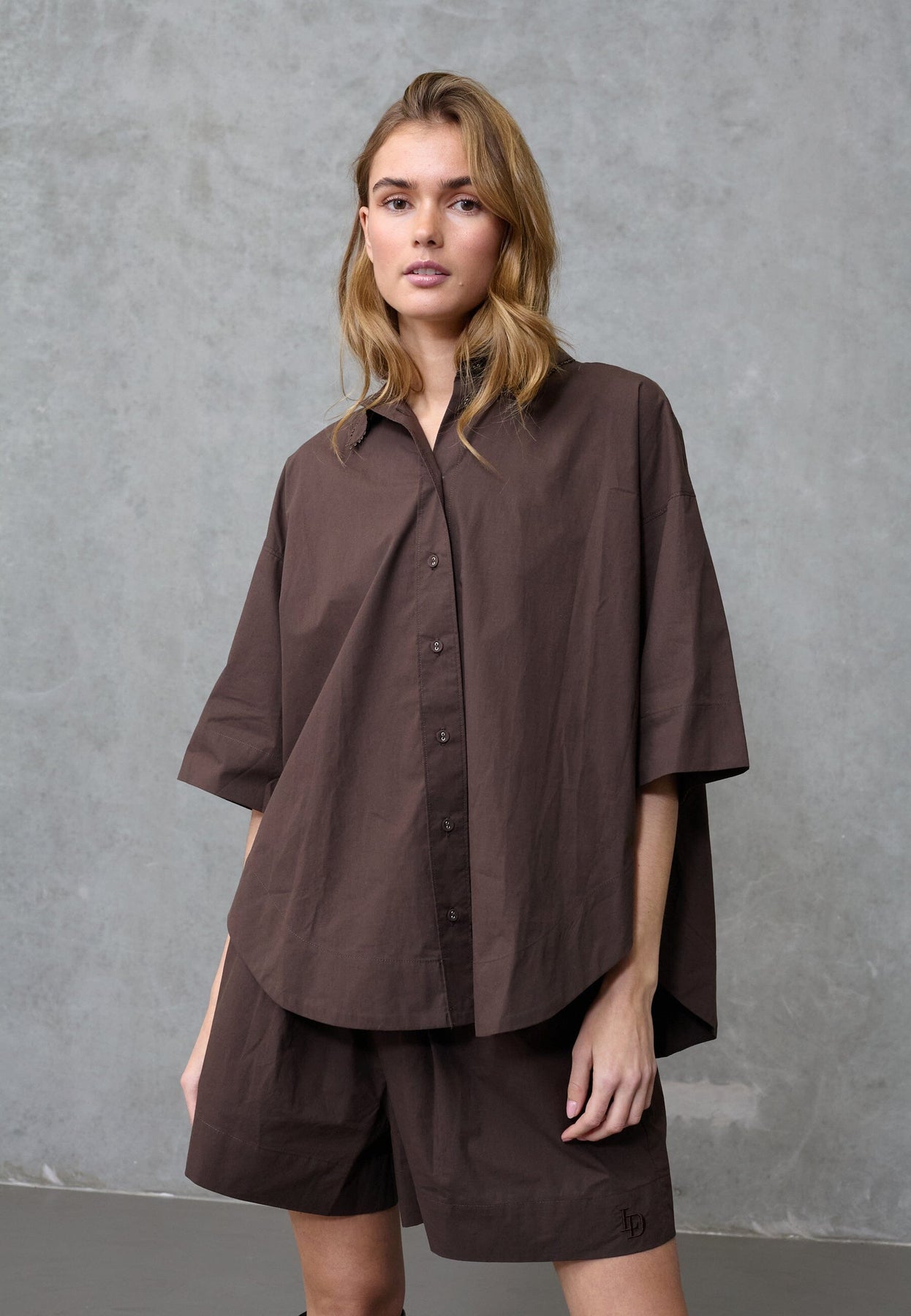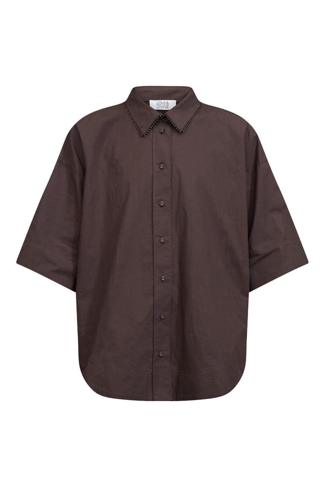 Chemise marron de Love & Divine, confectionnée en 100 % coton. La chemise présente une coupe oversize avec une silhouette boxy et des épaules tombantes.