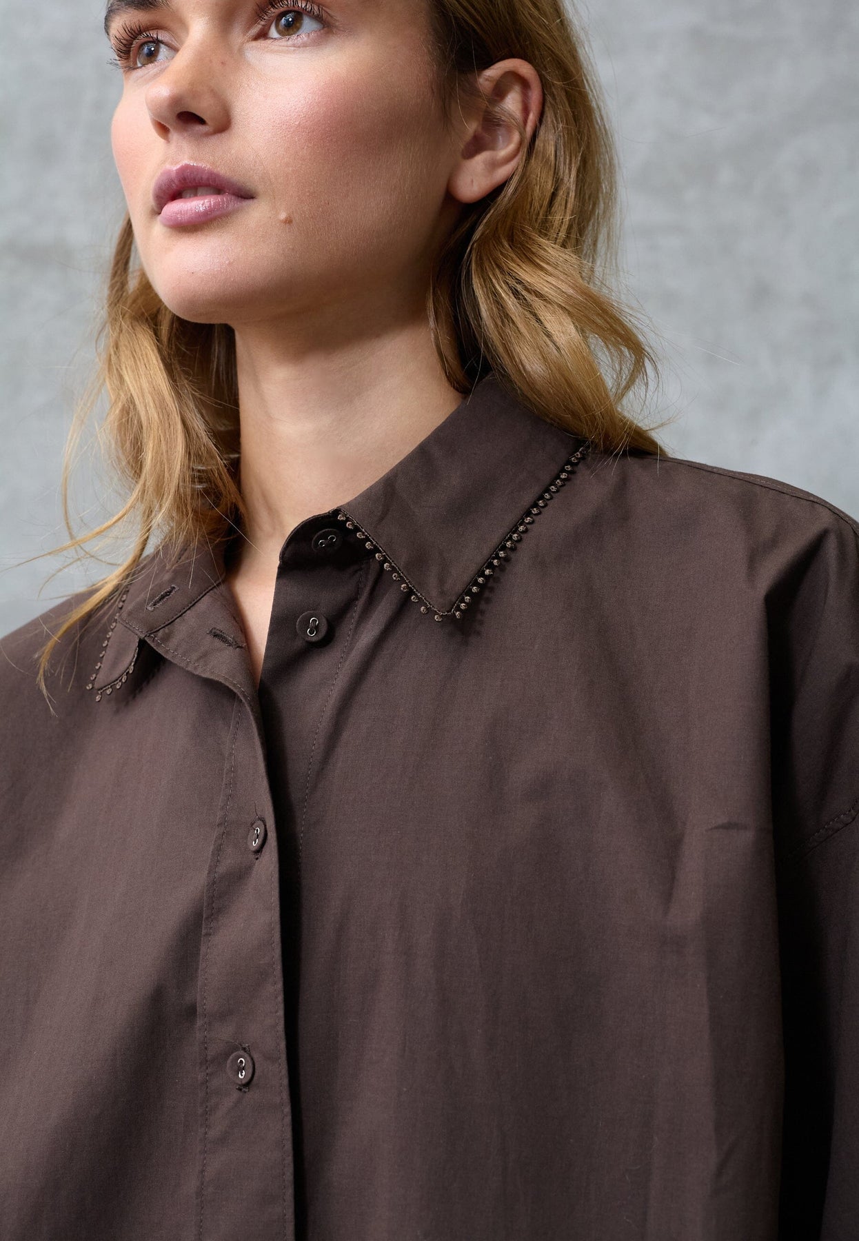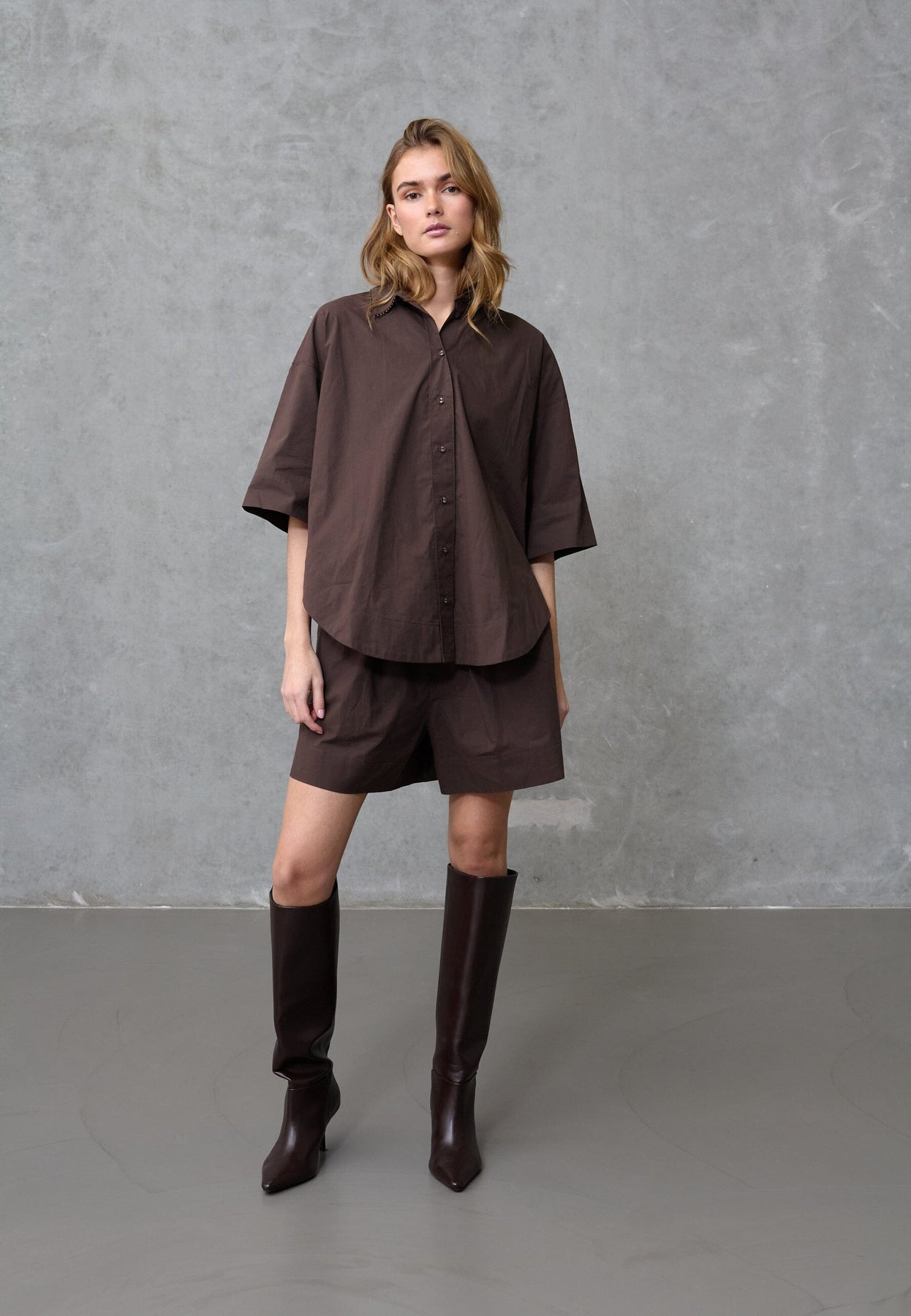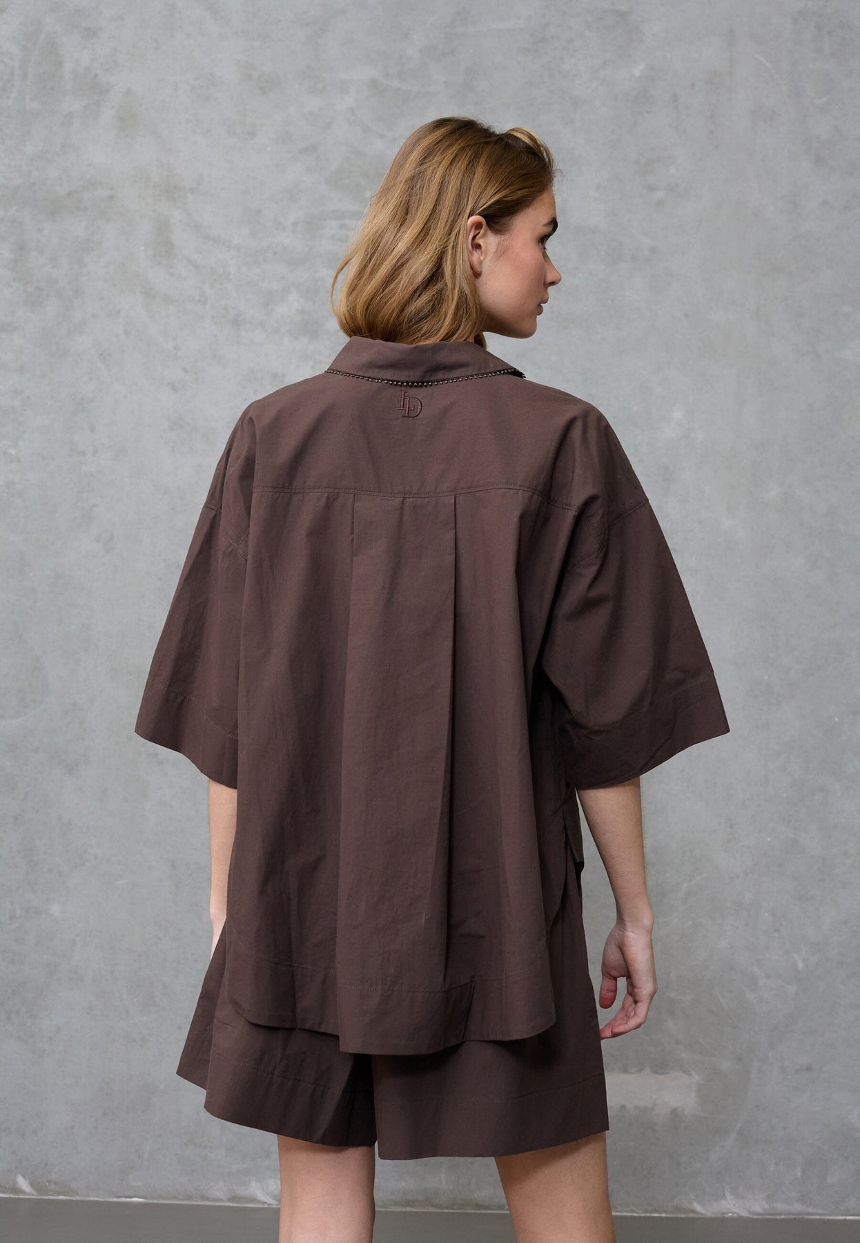 Chemise marron de Love & Divine, confectionnée en 100 % coton. La chemise présente une coupe oversize avec une silhouette boxy et des épaules tombantes.