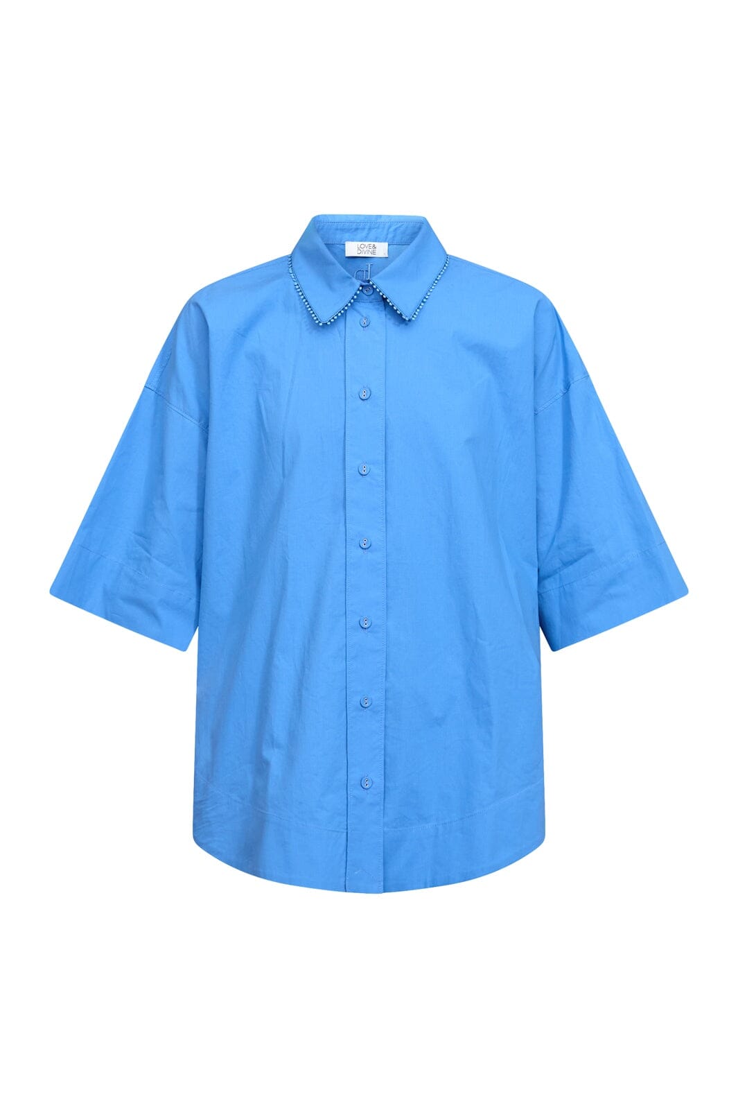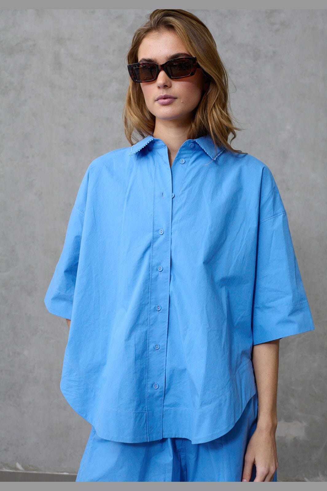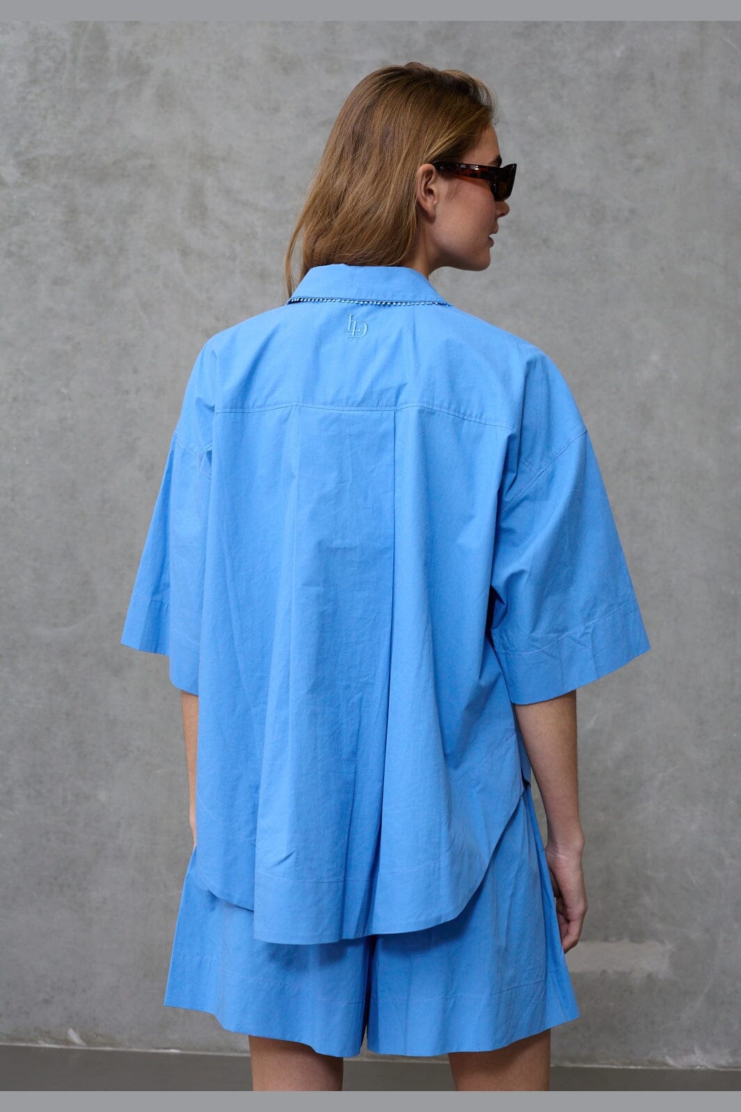 Chemise bleu clair de Love & Divine, confectionnée en 100 % coton. La chemise présente une coupe oversize avec une silhouette boxy et de fines dentelles au col.