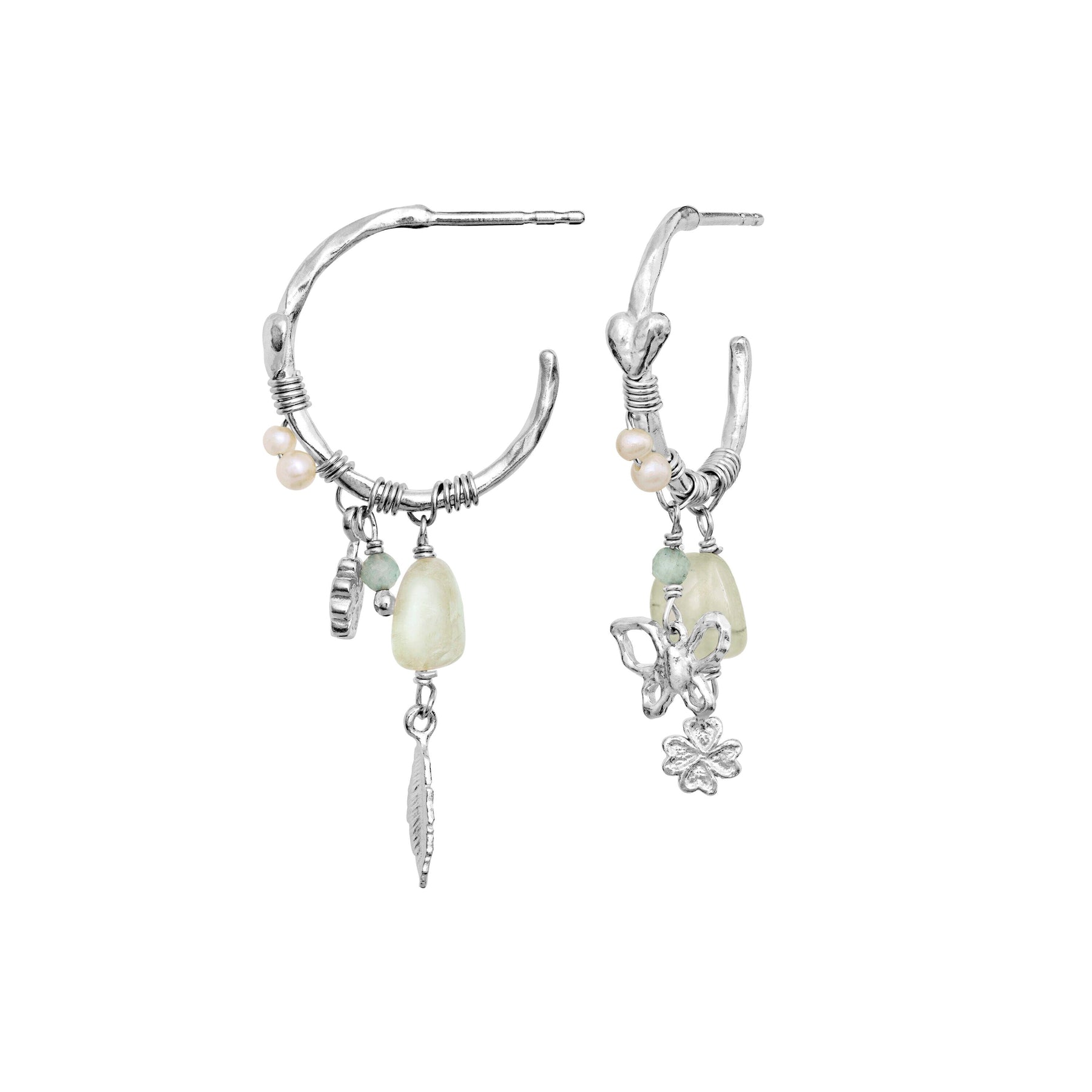 Boucles d’oreilles Maanesten en argent, de forme circulaire avec une surface irrégulière et texturée. Plusieurs pendentifs incluent une plume, un papillon, une fleur et de petites perles.