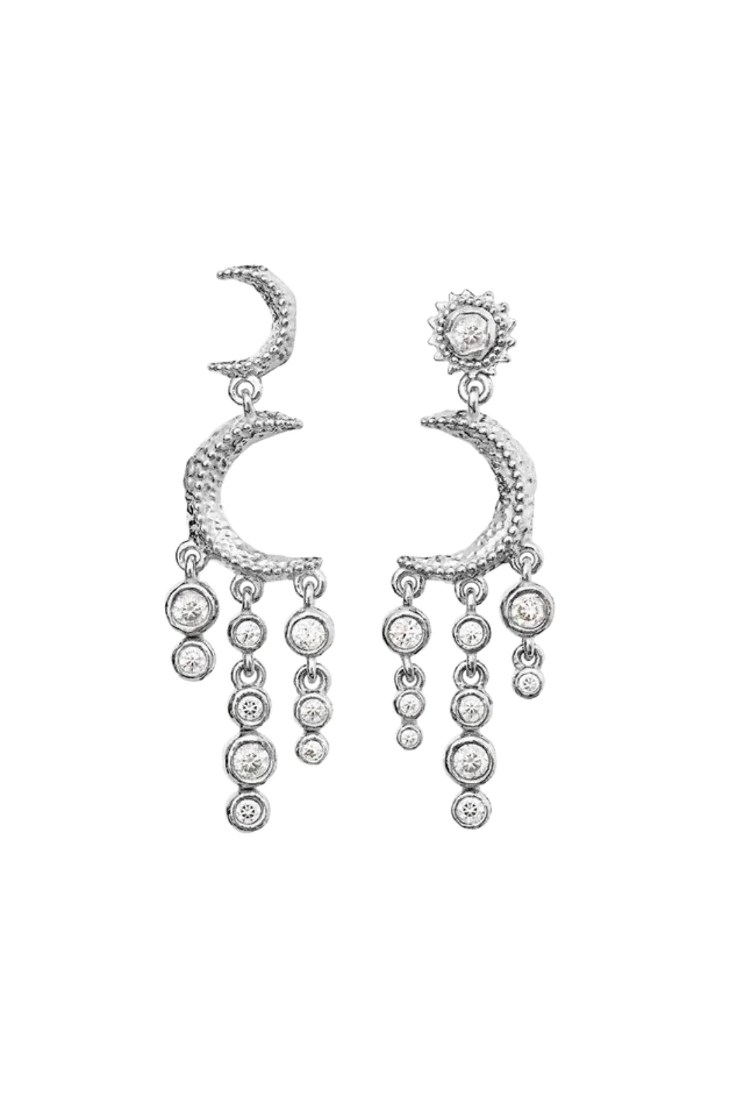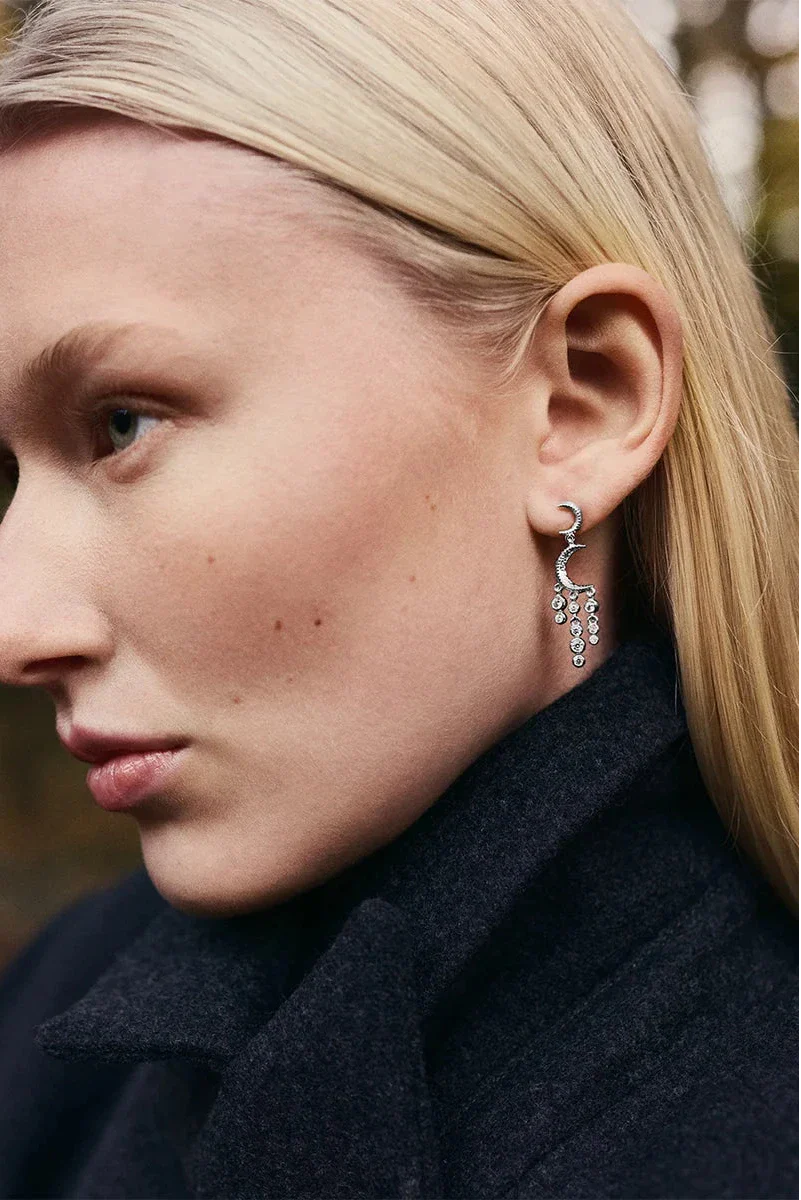 Boucles d’oreilles Maanesten au design en forme de demi-lune. Chaque boucle d’oreille comporte plusieurs éléments pendants sertis de pierres de couleur argentée.